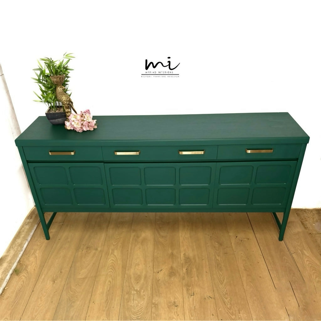 This beautiful 1970s Nathan sideboard has been professionally refinished to give a classic piece a fresh, modern look. Painted in a deep forest green finish, it features the iconic "square" door design that Nathan furniture is famous for. The rich green exterior is paired with modern as brass handles, while the inside remains in its natural warm wood state for a lovely contrast.