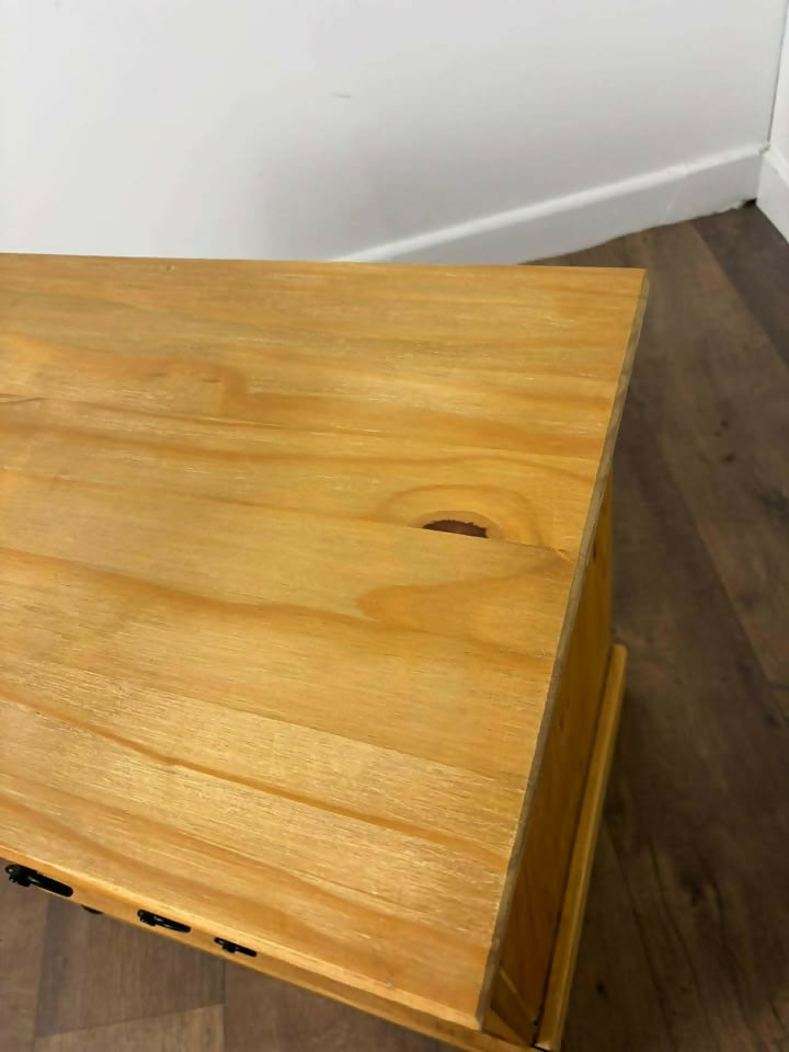A contemporary Mexican pine bedside chest of drawers, solidly made and well proportioned. The chest features three drawers fitted with traditional black metal ring handles, offering practical and accessible storage.