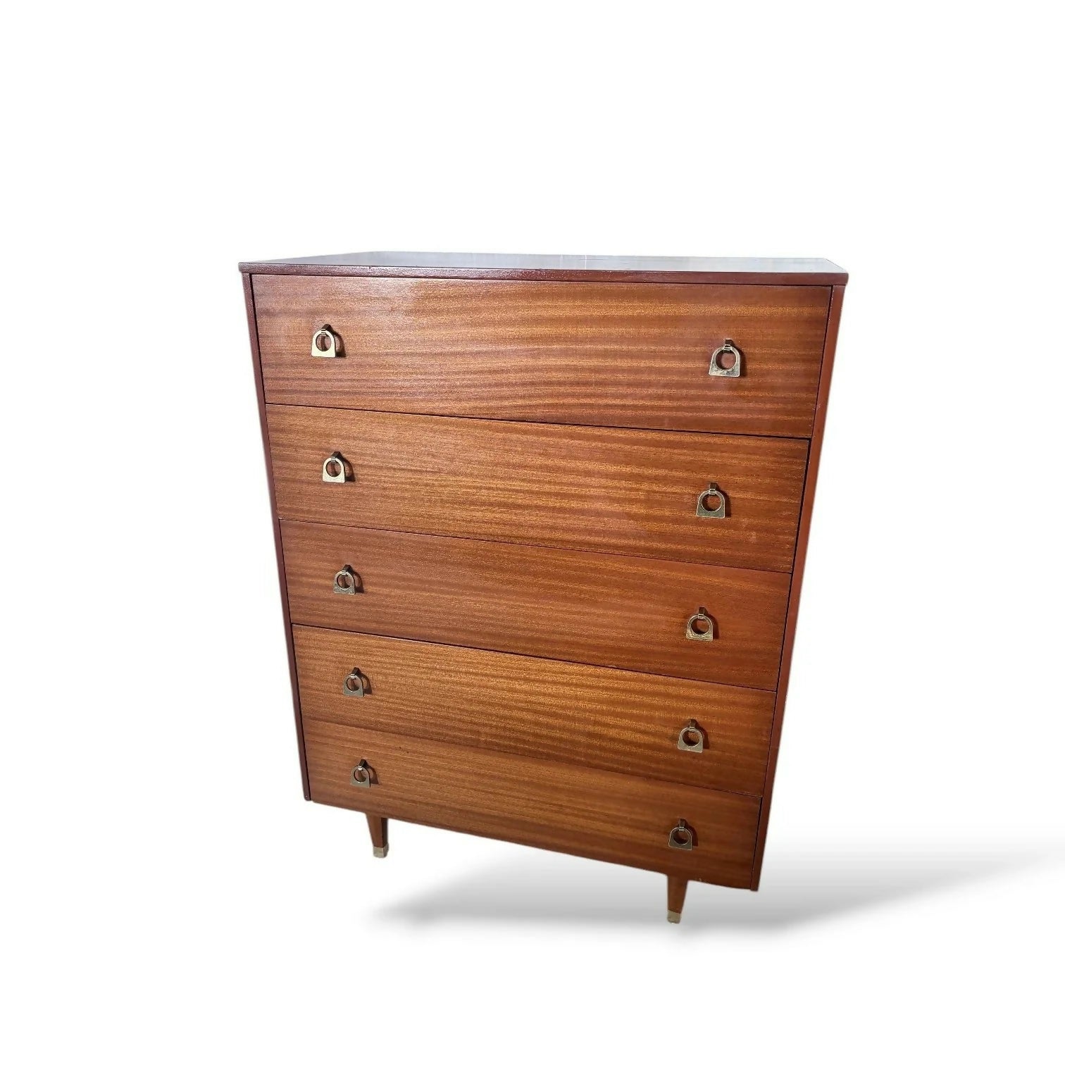 A beautifully proportioned mid-century chest of drawers, featuring five drawers with distinctive solid brass drop handles and elegant tapered legs capped in brass. Crafted in richly toned teak veneer, this piece captures the simplicity and refinement of post-war British modern design. Ideal for use in a bedroom, hallway, or living space, offering both character and storage in a compact footprint. The brass detailing adds a subtle hint of luxury against the warm wood grain. ⸻ Details • Period: Mid-20th Century (c.1960s) • Style: Mid-century modern • Material: Teak veneer, brass handles • Condition: Excellent vintage condition; minor age-related wear consistent with use • Finish: Warm teak with original patina ⸻ Dimensions • Width: 75 cm • Depth: 40 cm • Height: 100 cm ⸻ Styling Notes The clean lines and timeless materials make this a versatile storage piece — it pairs effortlessly with vintage or contemporary interiors. Use as a tallboy dresser in the bedroom or a statement storage piece in the hallway, styled with ceramics or plants for a classic mid-century look. ⸻ Delivery & Collection • UK-wide delivery available — message for a tailored quote • Collection welcome from West Yorkshire • Professionally wrapped and handled with care •