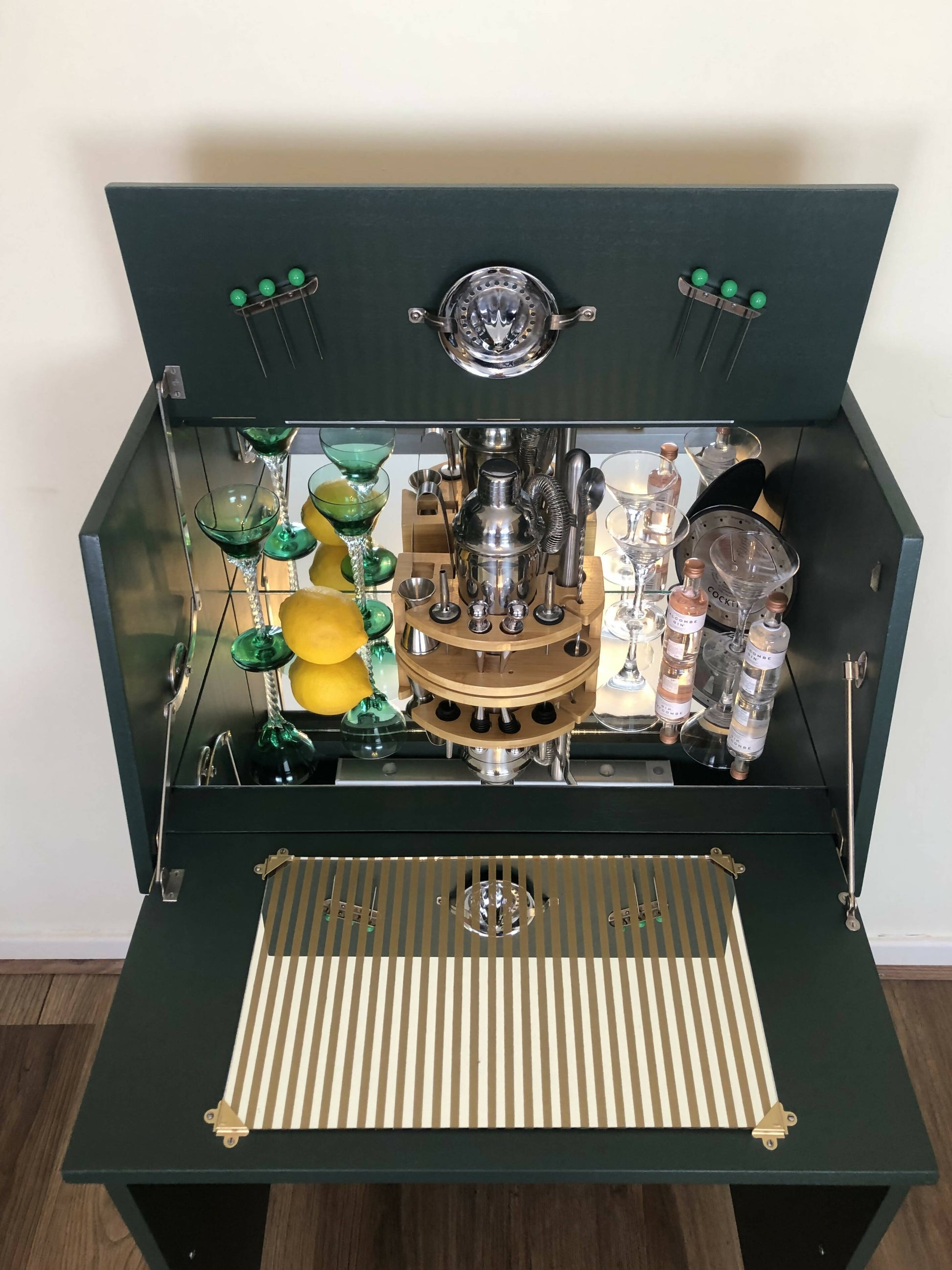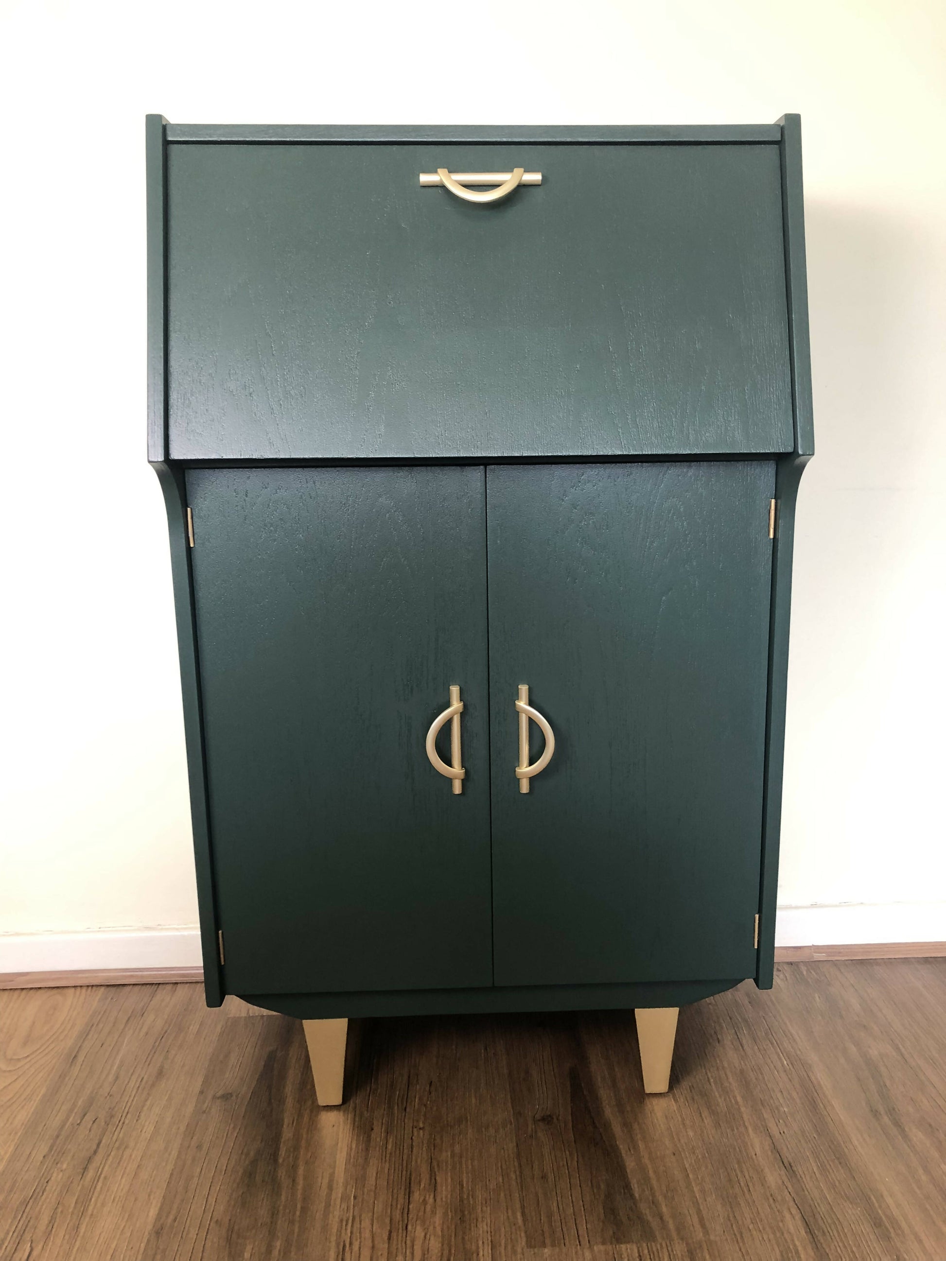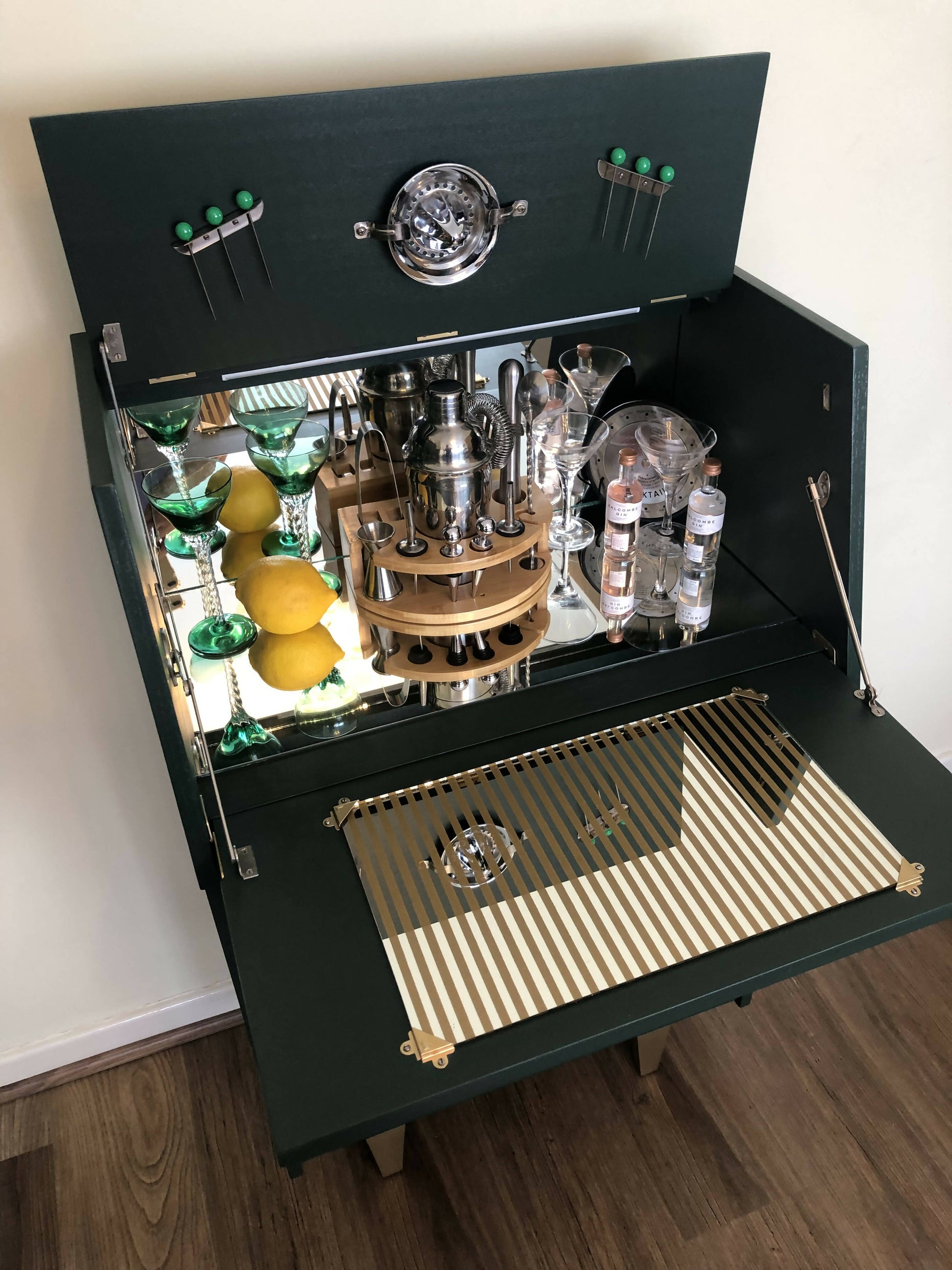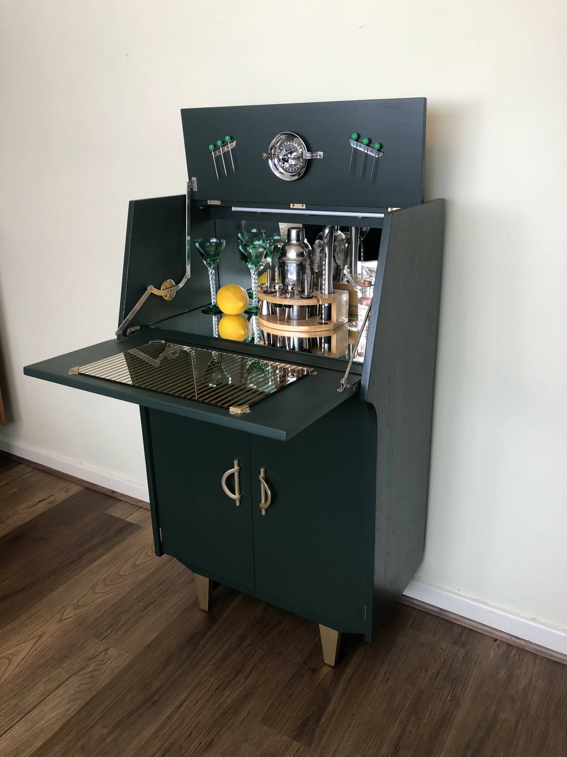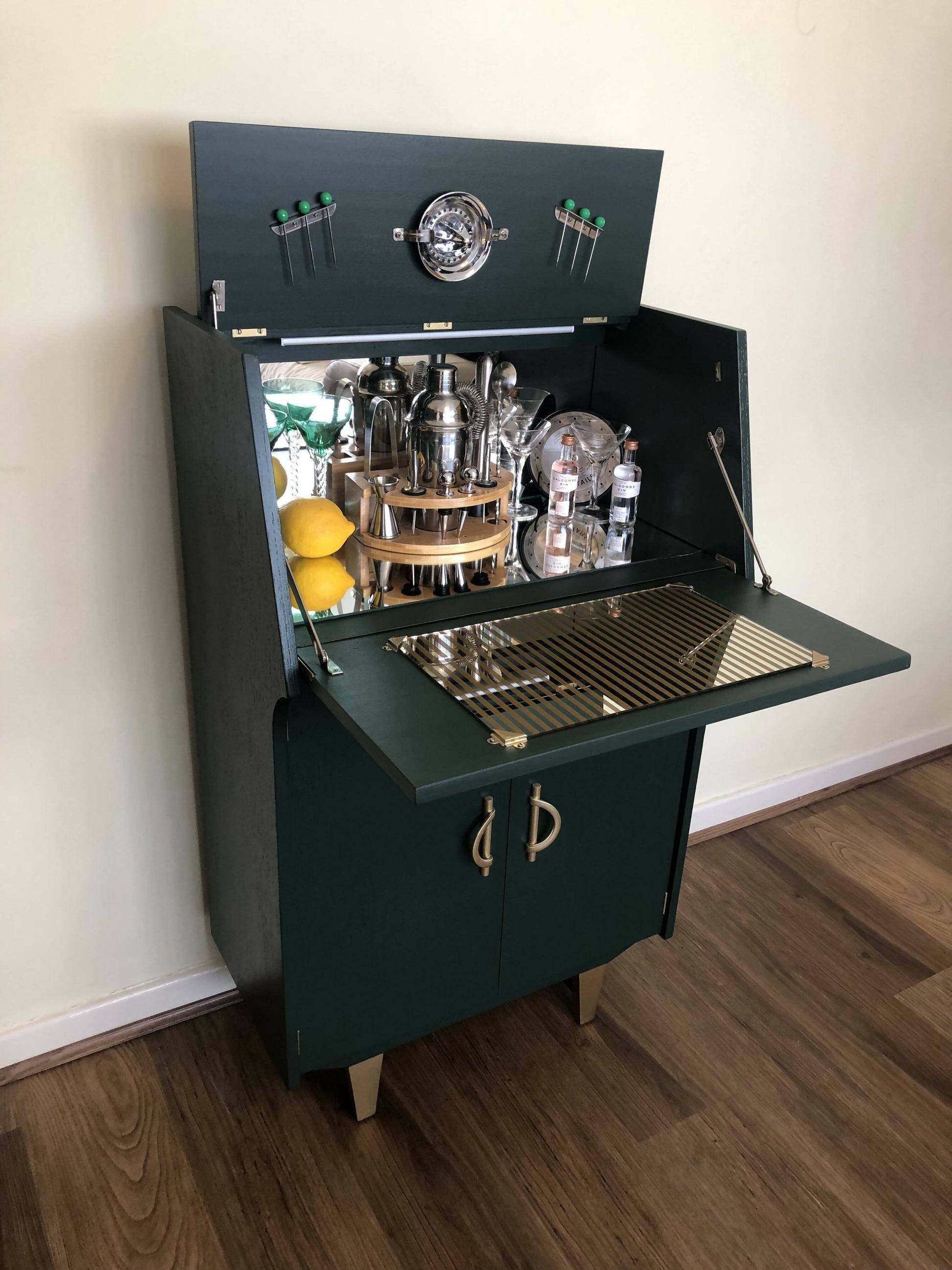 Mid Century Cocktail Cabinet, Drinks Cabinet, Home Bar in British Racing Green and Gold colour
