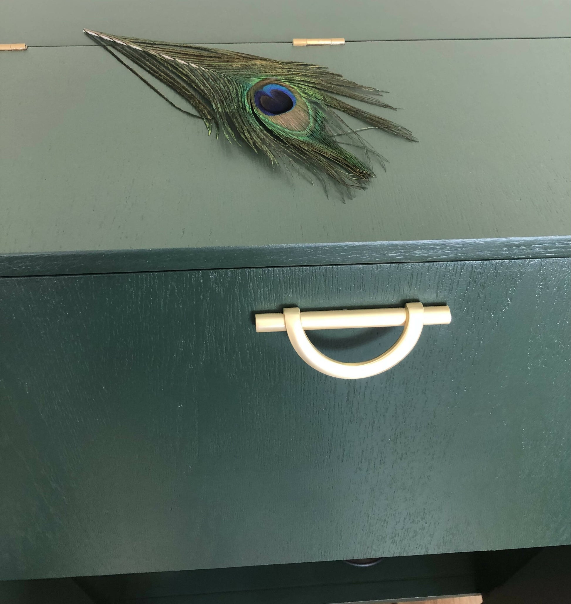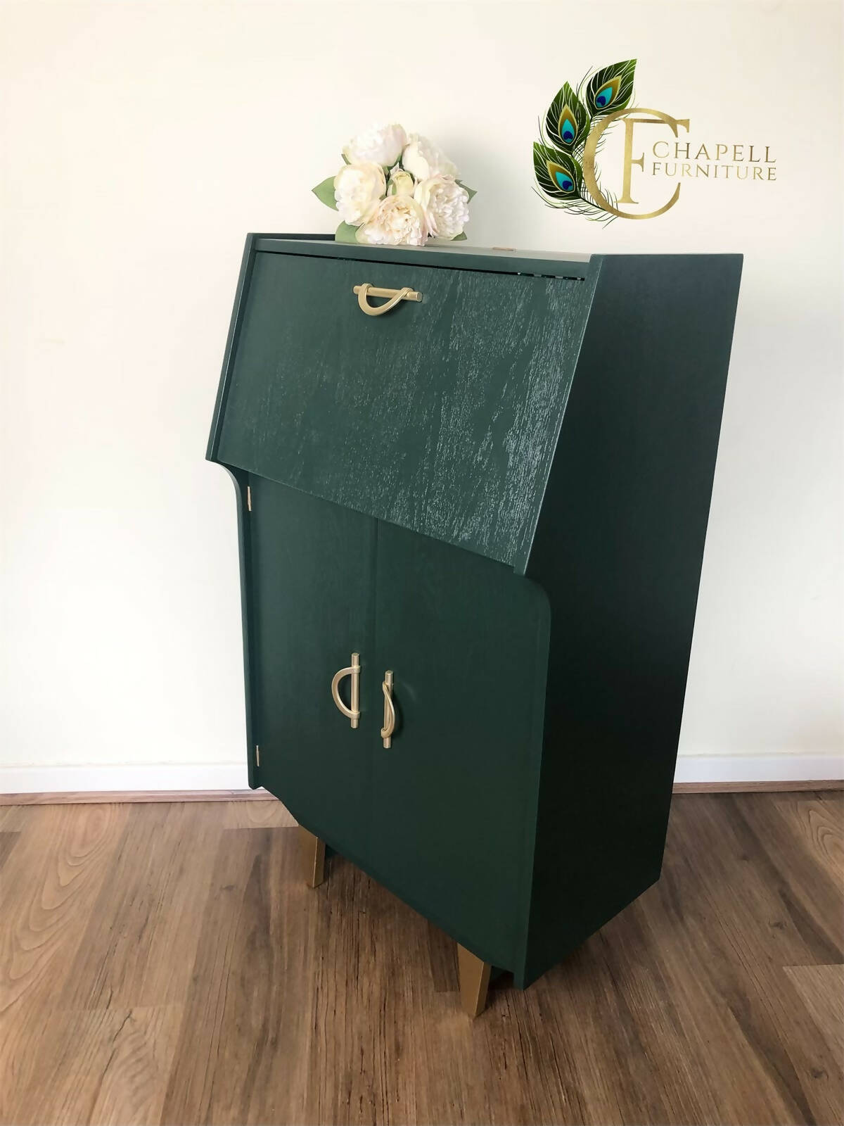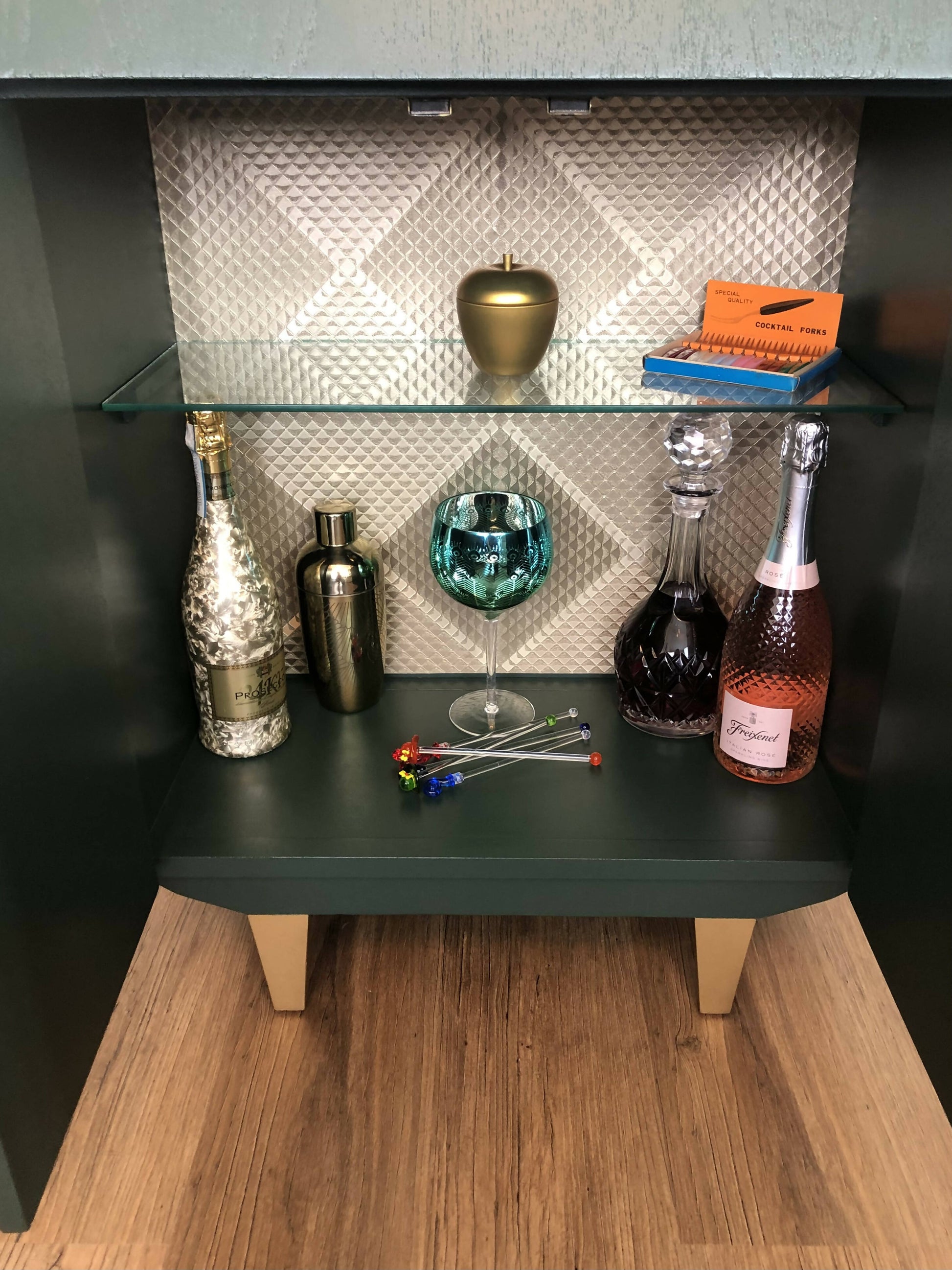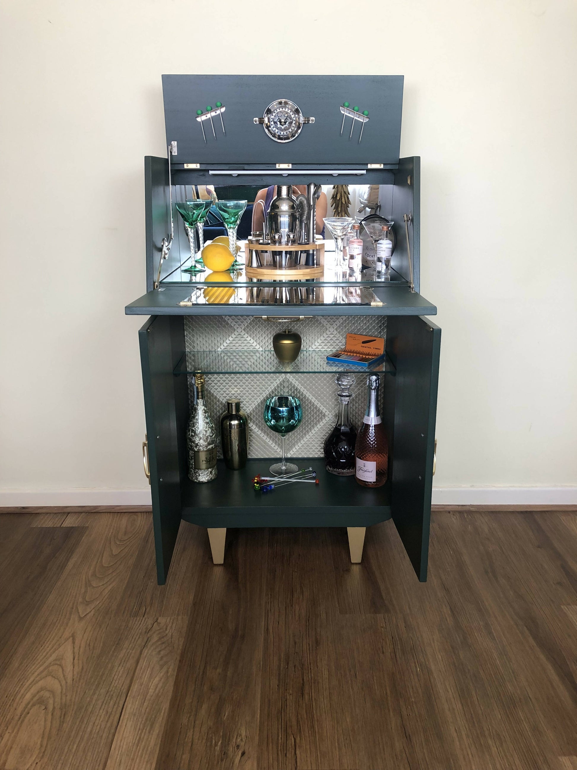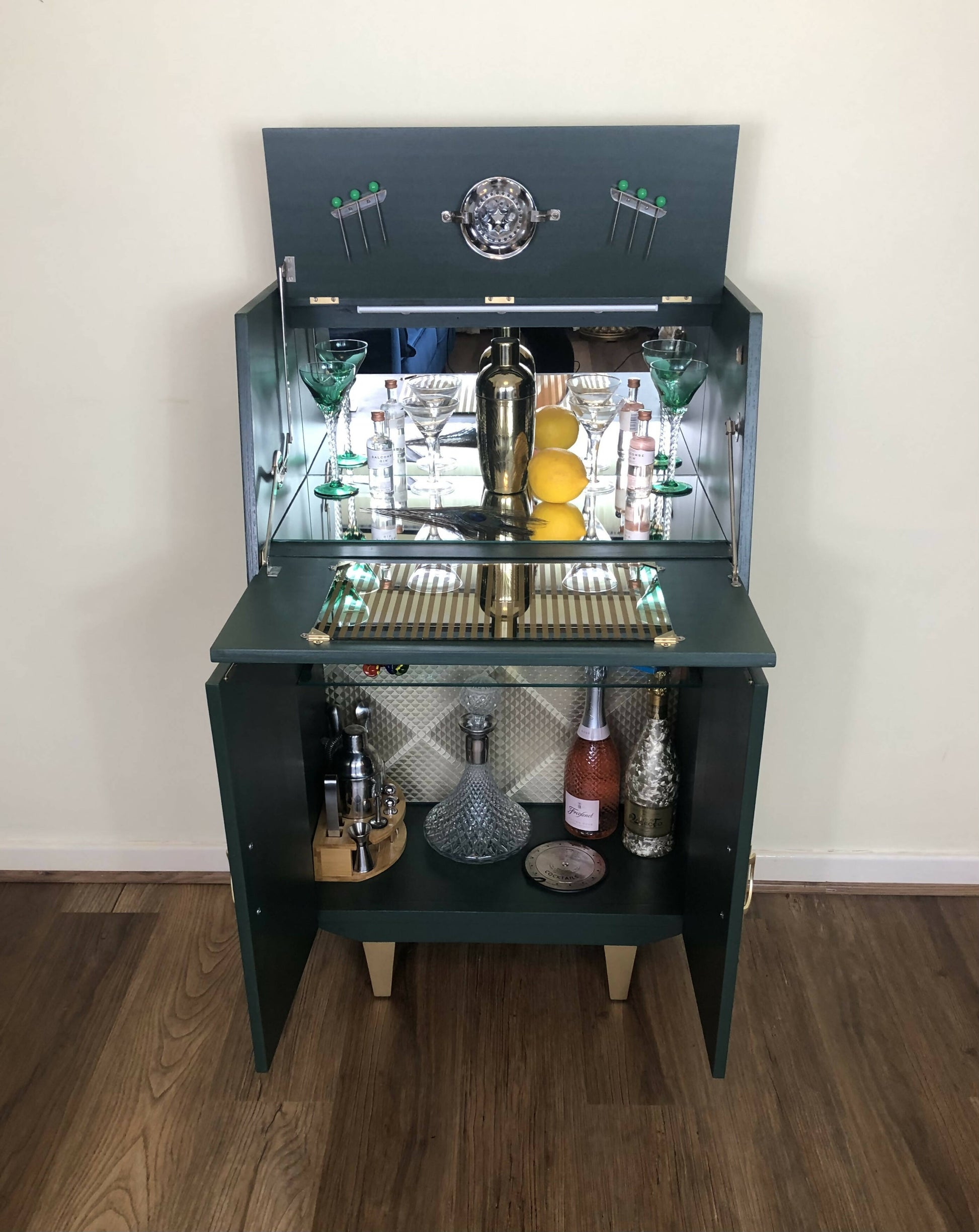 Mid Century Cocktail Cabinet, Drinks Cabinet, Home Bar in British Racing Green and Gold colour