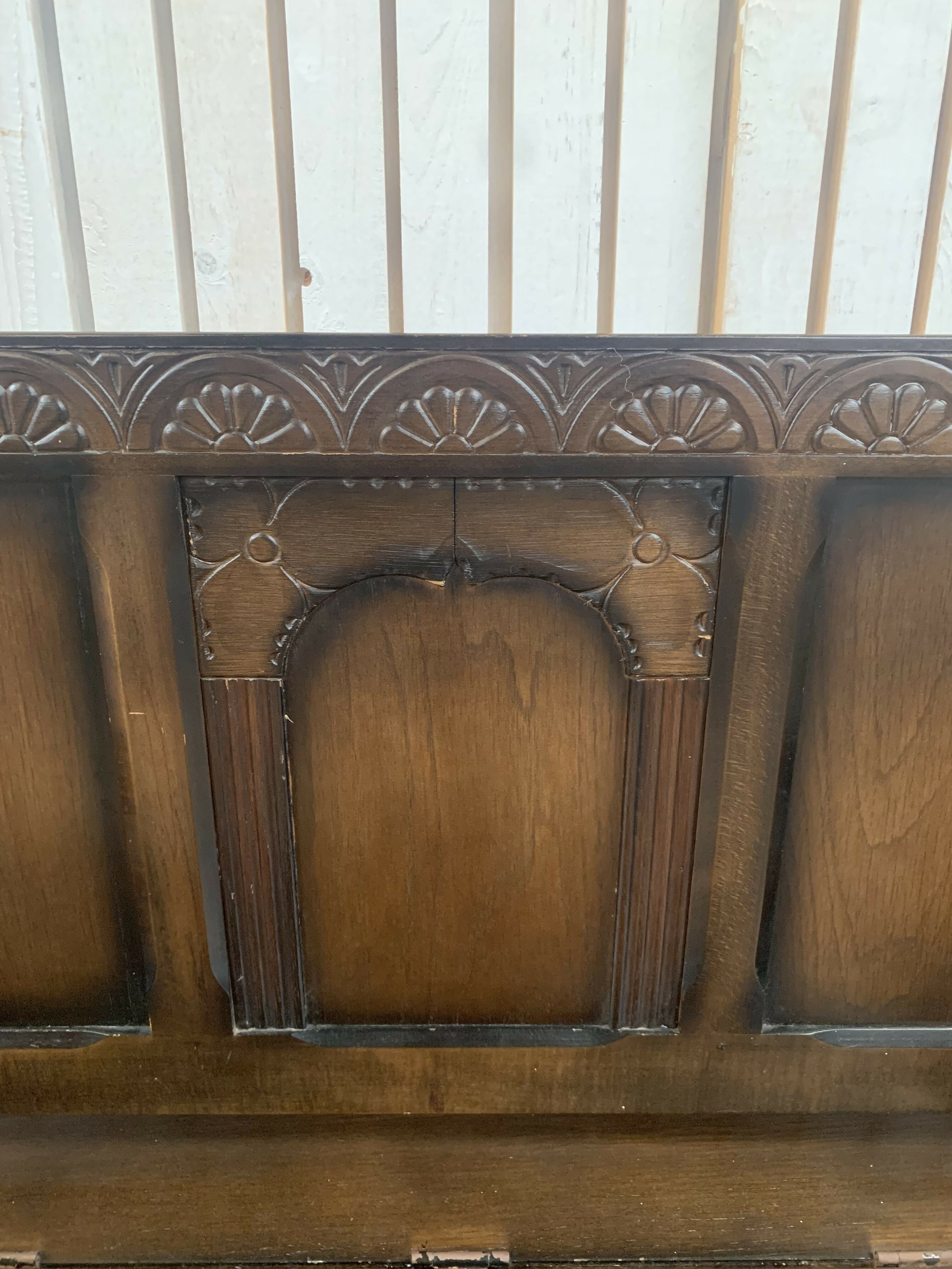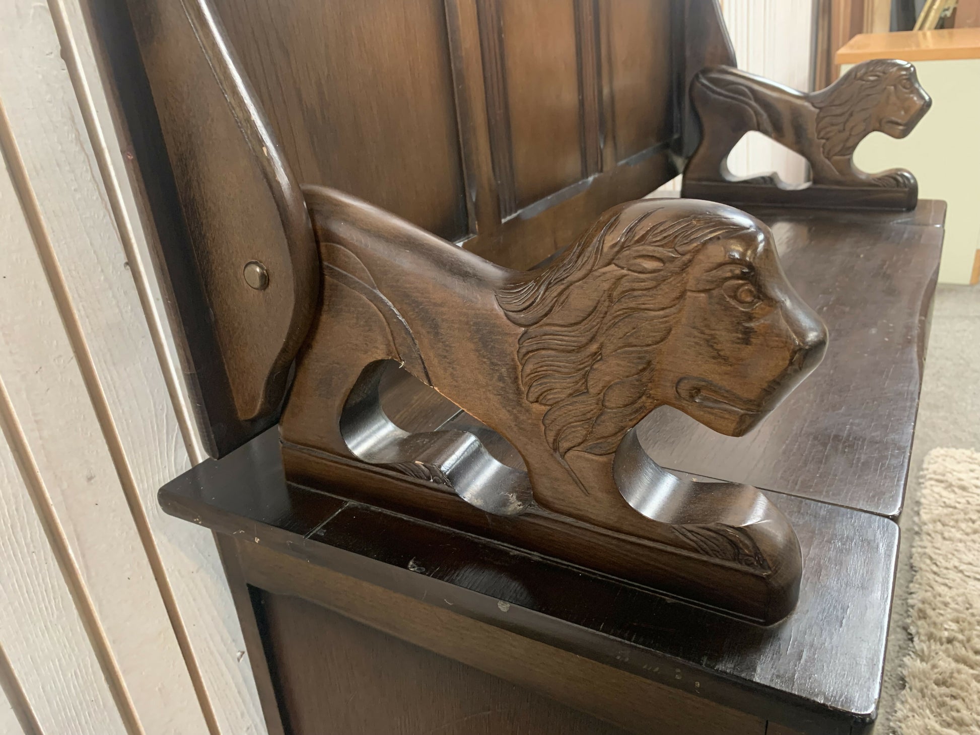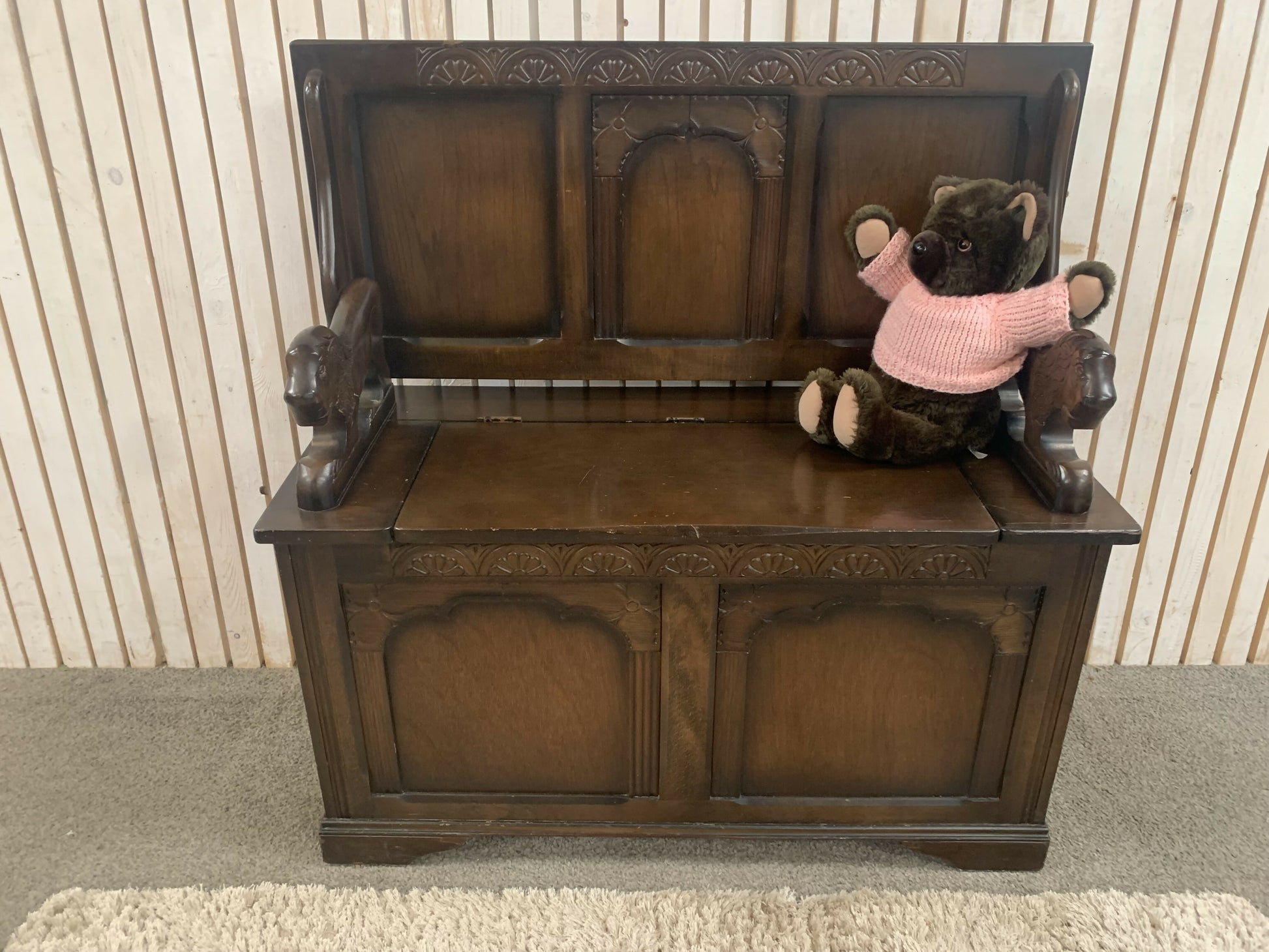 Gorgeous ornate monks bench with under seat storage, the top folds down to form a useful flat surface also, has some lovely features such as linenfold panels & carved lions