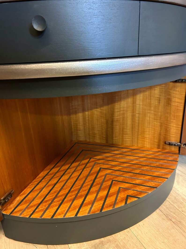 Painted in the stunning Buntys Total Eclipse and finished with beautiful metallic silver. The inside of the two glass doors is a contrasting Art Deco paper which brings the piece to life.