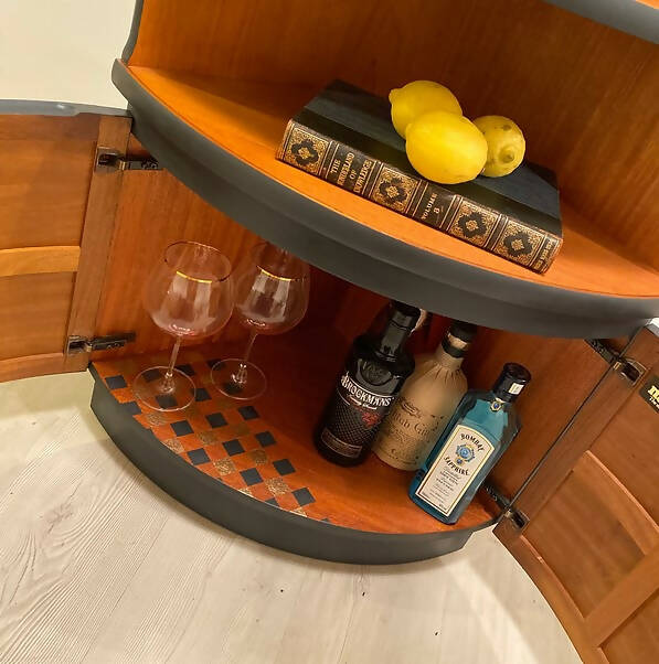 The inside has again been treated with hemp oil and has had a Ash (grey) and gold chequered pattern stencilled on for a retro pop of interest and colour when the doors are opened.