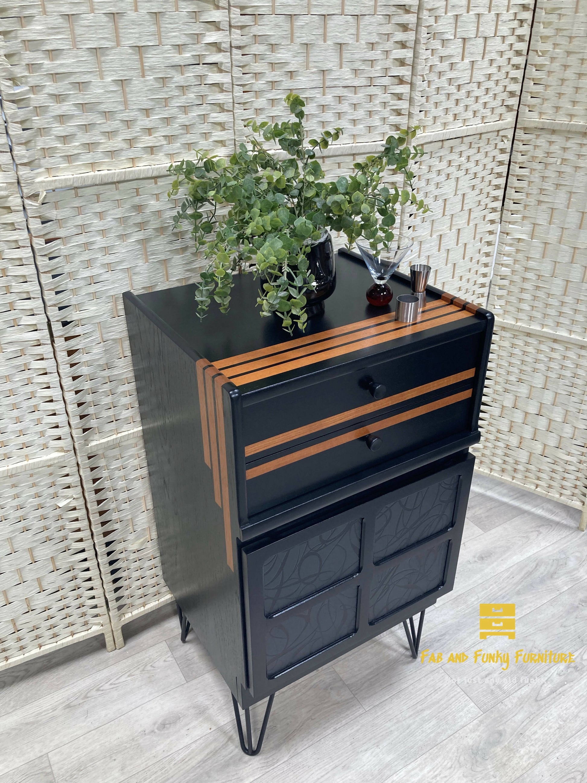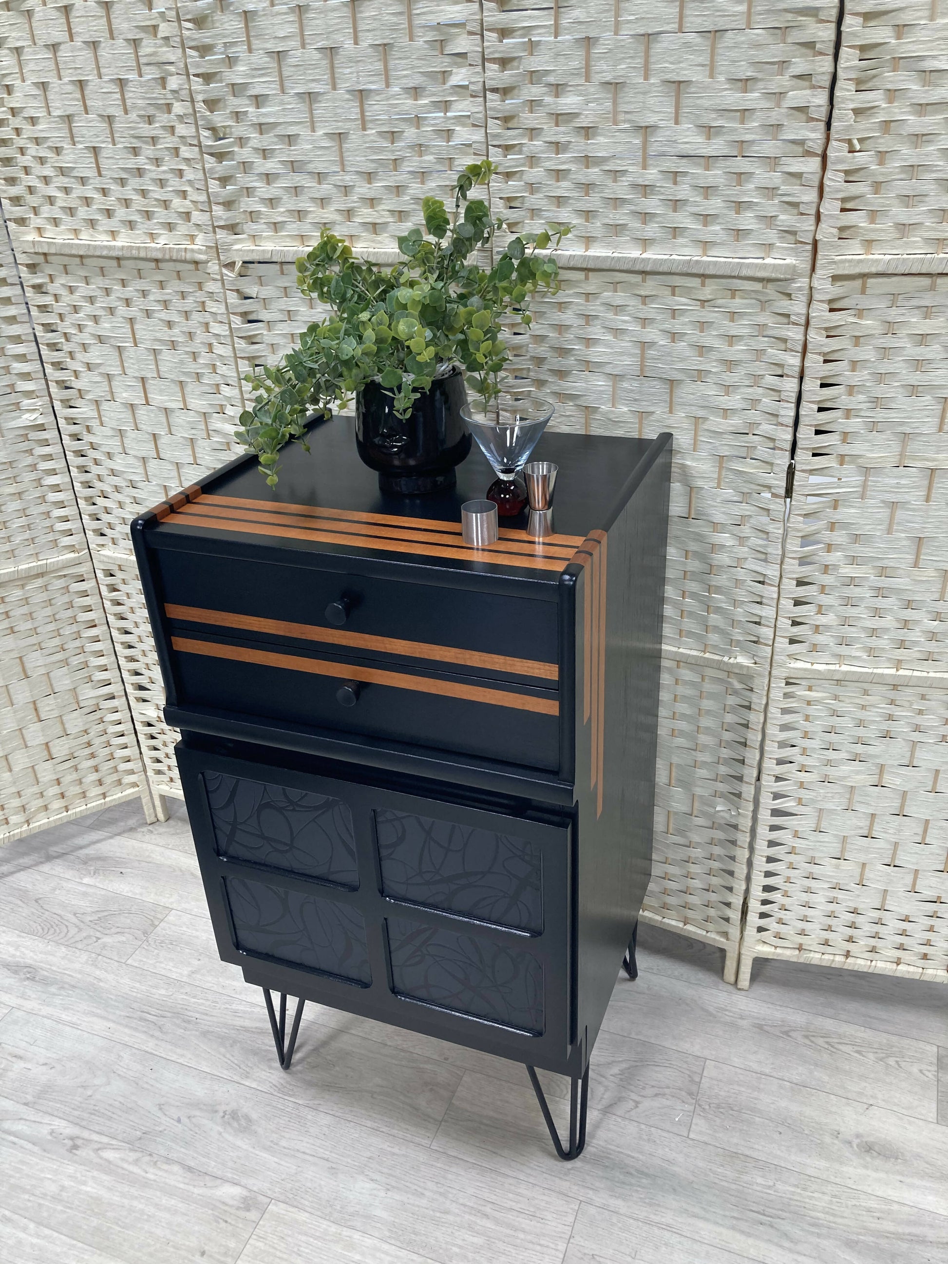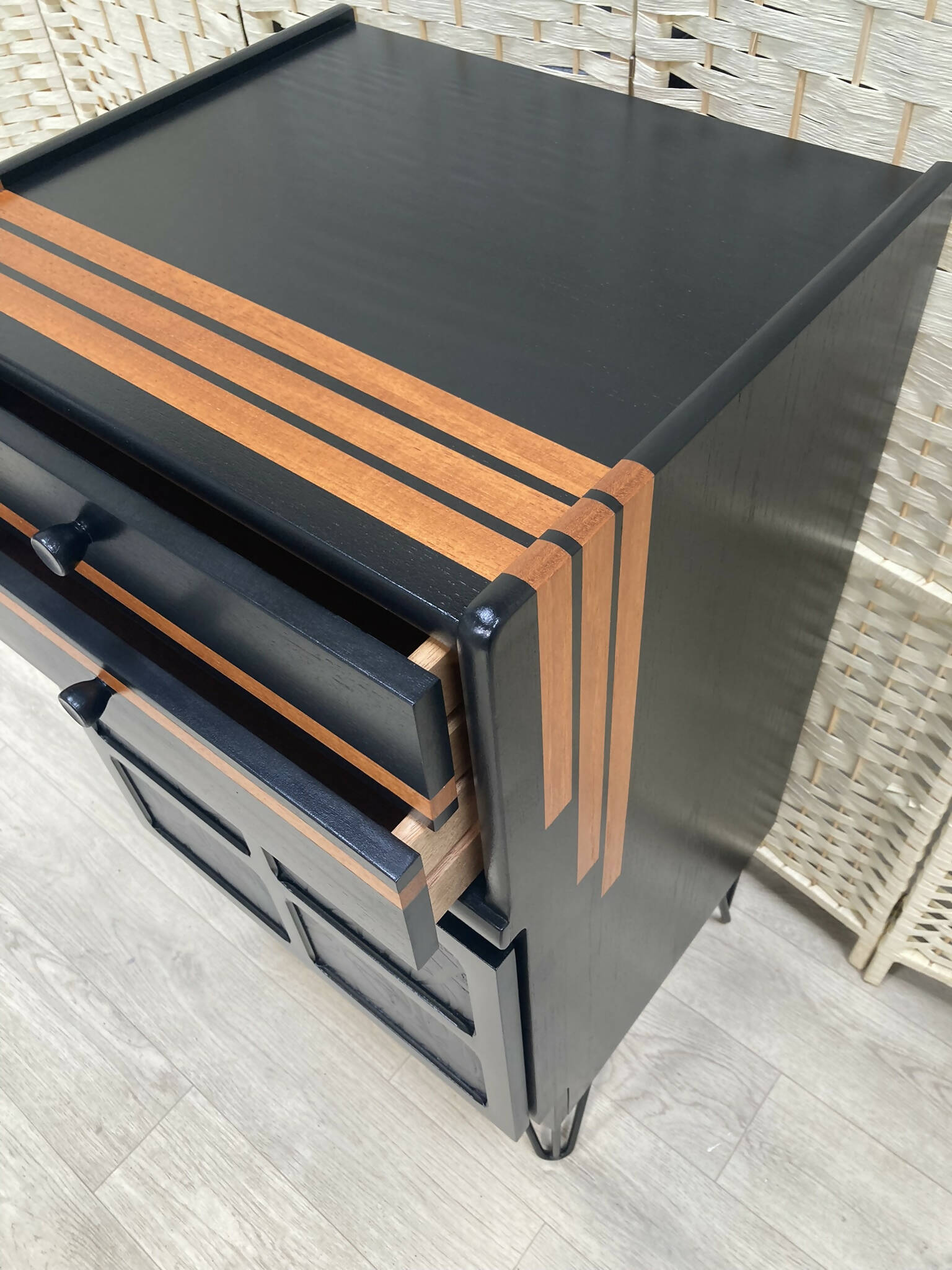 This compact unit, with cupboard and two drawers, has been thoroughly sanded, cleaned, primed and painted in Wise Owl Enamel colour Jet Black and finished in Wise Owl Furniture Salve to the interior. Added hairpin legs and retaining a hint of its history with exposed teak feature stripes make James a unique super quality addition to any home.