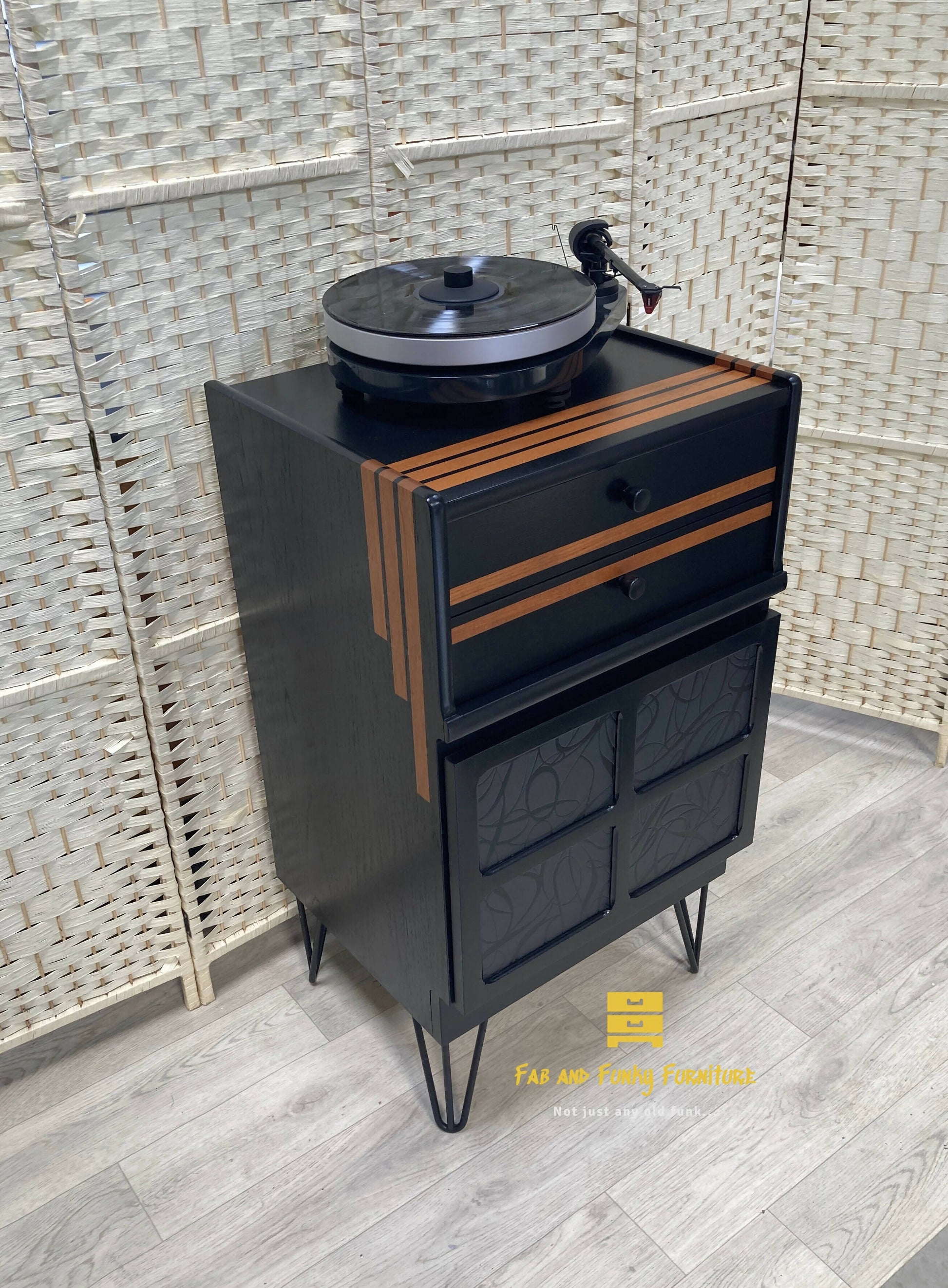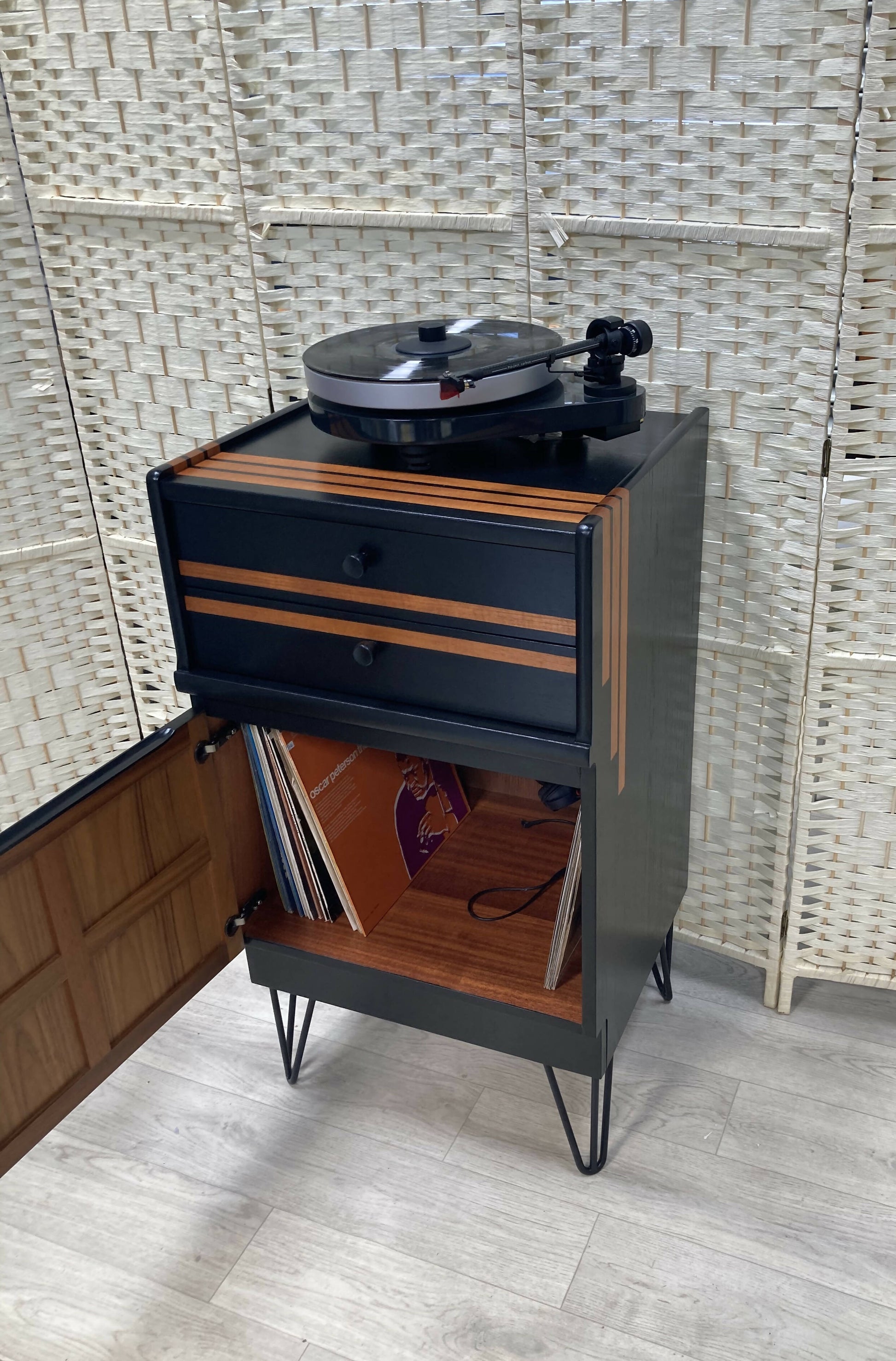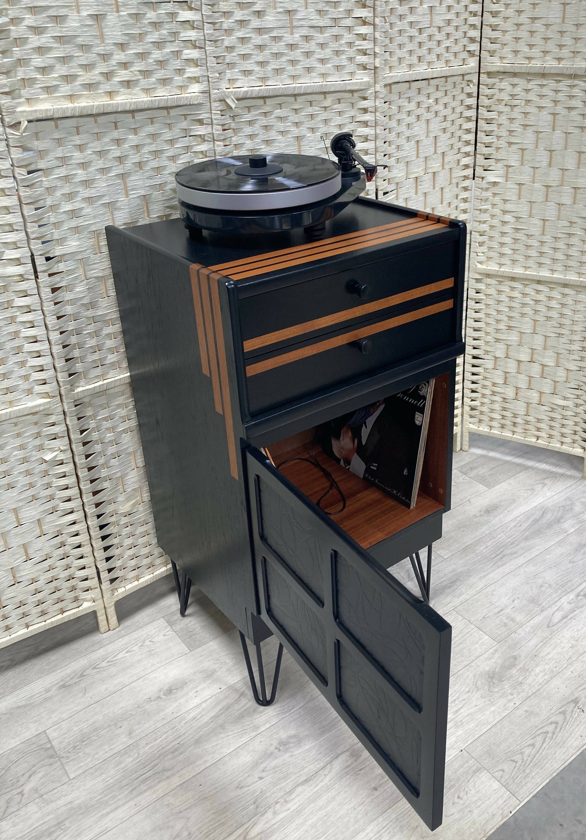 This compact unit, with cupboard and two drawers, has been thoroughly sanded, cleaned, primed and painted in Wise Owl Enamel colour Jet Black and finished in Wise Owl Furniture Salve to the interior. Added hairpin legs and retaining a hint of its history with exposed teak feature stripes make James a unique super quality addition to any home.