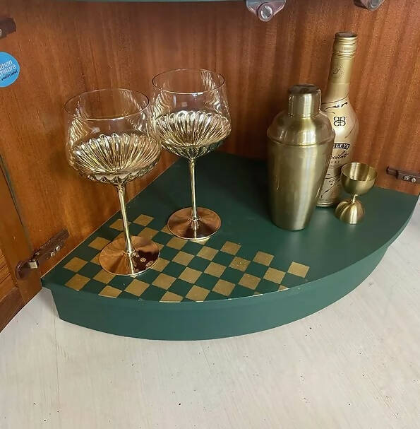 The inside has again been treated with hemp oil and has had a gold chequered pattern stencilled on for a retro pop of interest and colour when the doors are opened.