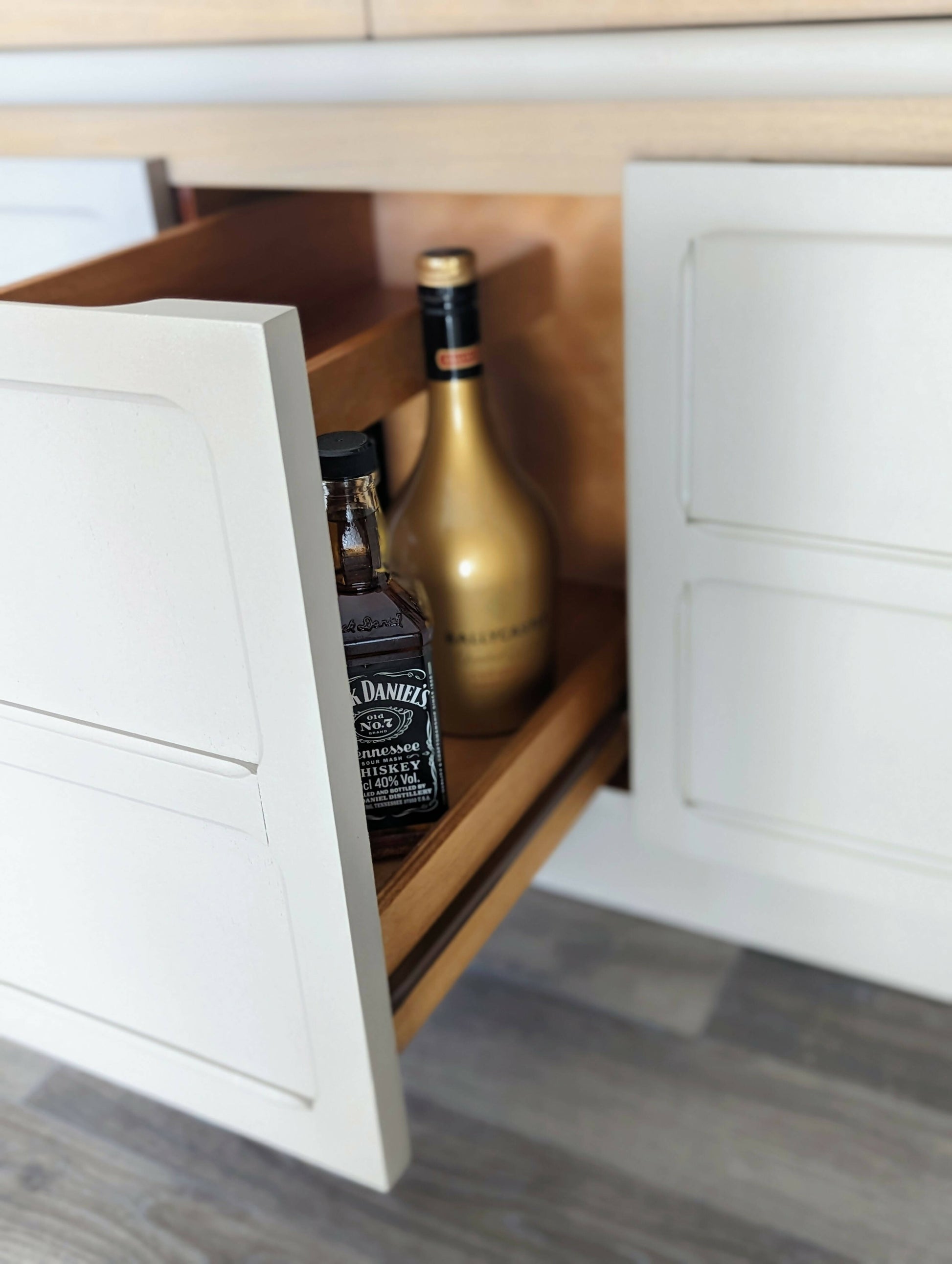 Offering so much storage with two side cupboards (retaining original record storage, which also doubles for storing that all important home filing system), and middle pull out section slides out which is great for storing all those cocktail bottles.