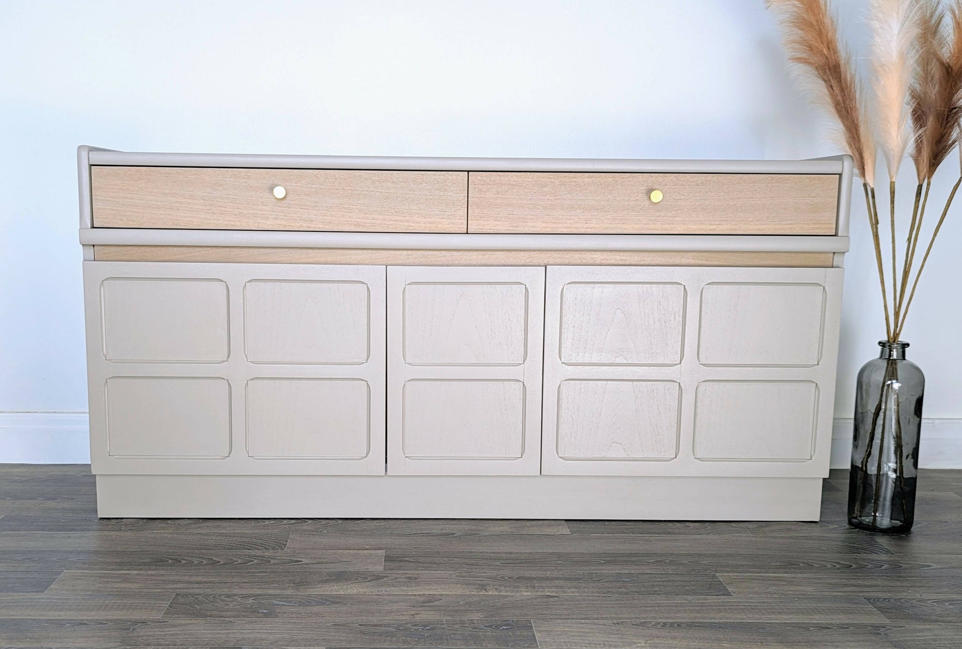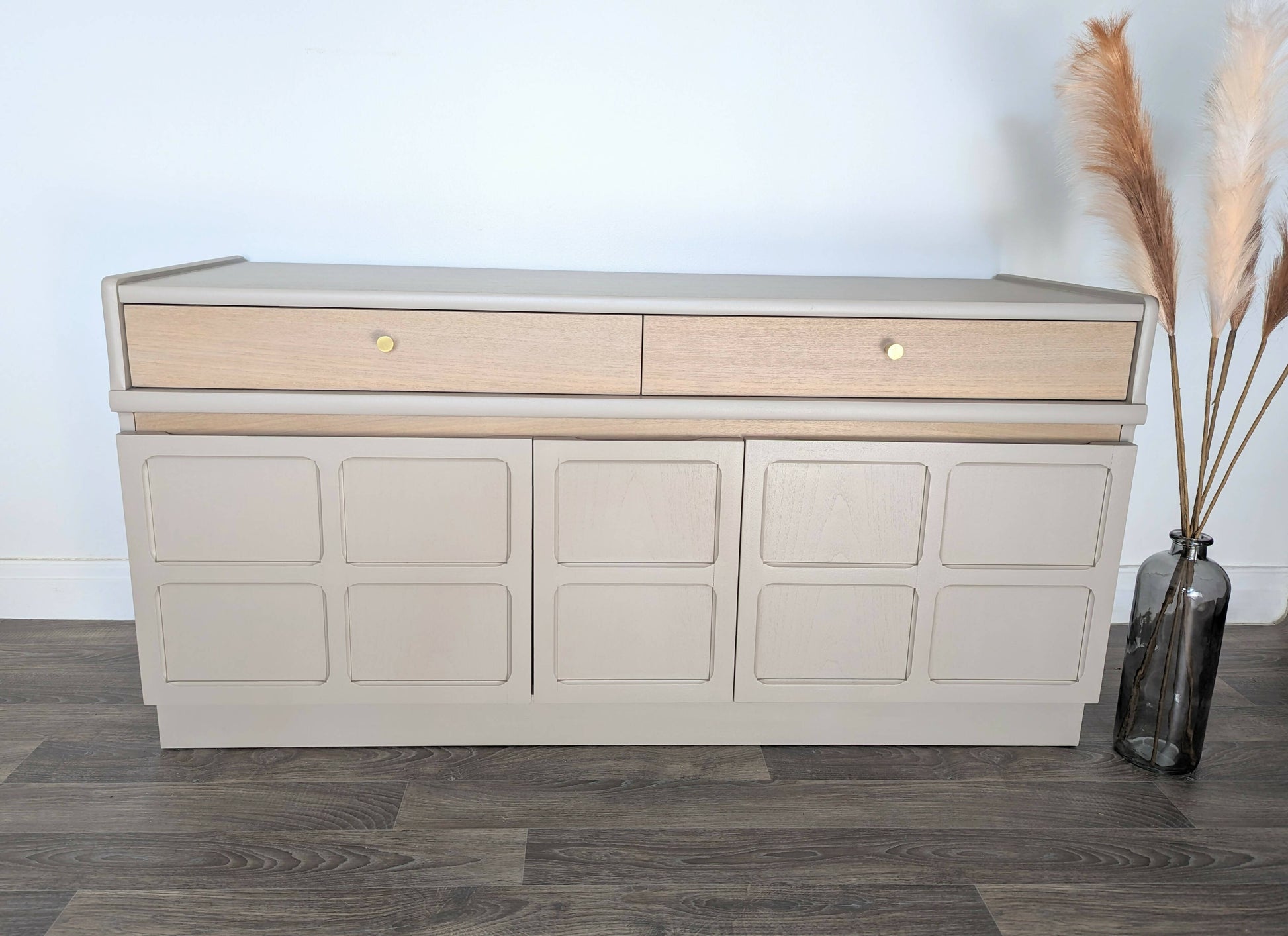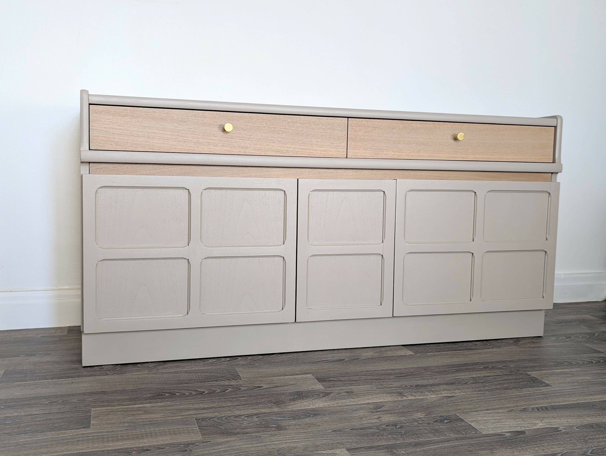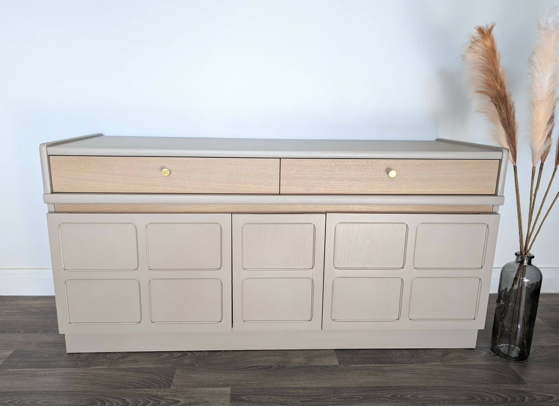 This classic Nathan sideboard has been given a up to date modern look. Fully stripped, primed then handpainted in a beautiful neutral Taupe, the drawers have been colour washed and given new handles and all interior woodwork has been treated with nourishing hemp oil.