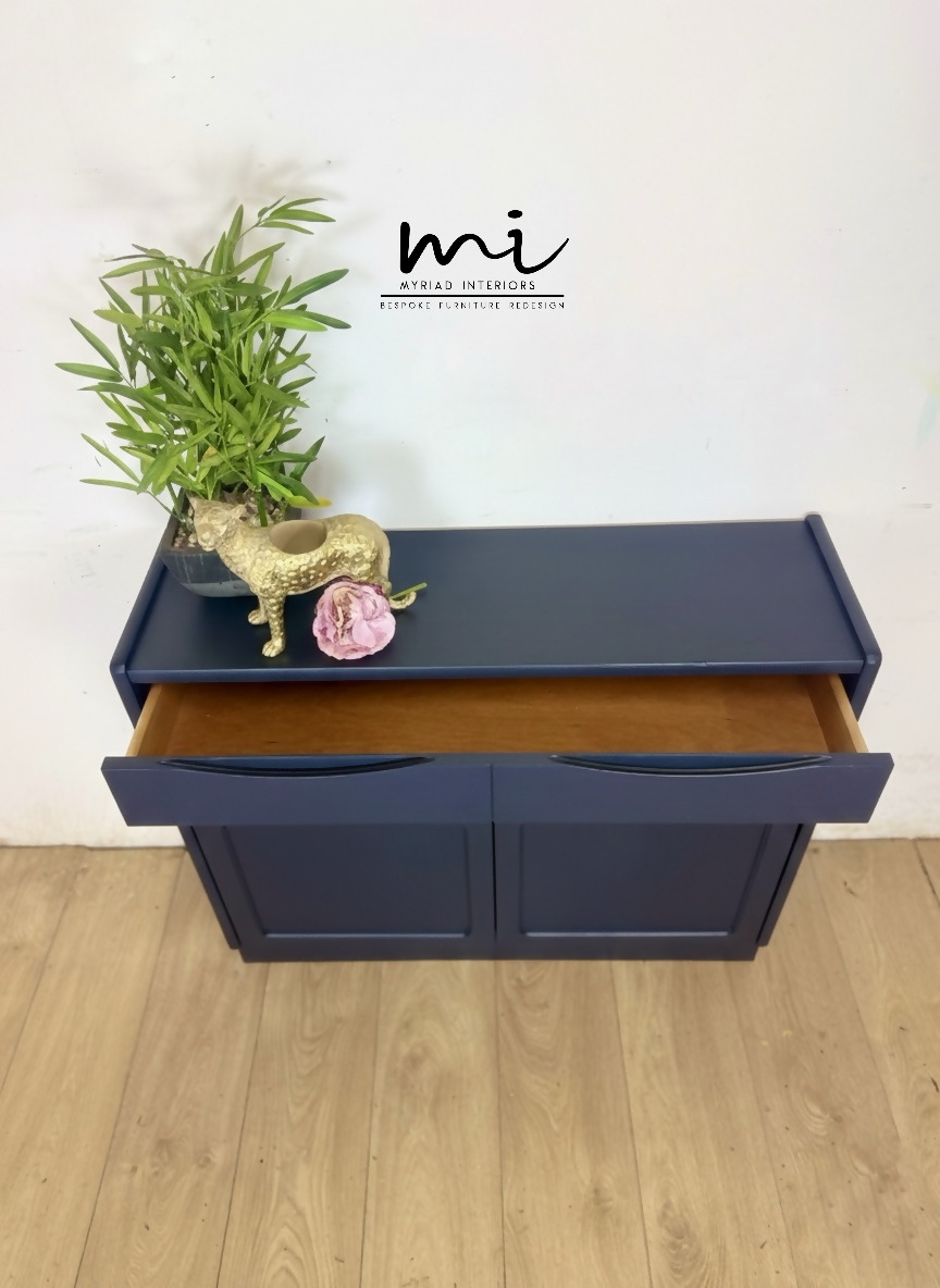 Navy Blue Nathan slim sideboard, retro hallway table, teak console, vintage, narrow, small drinks cabinet