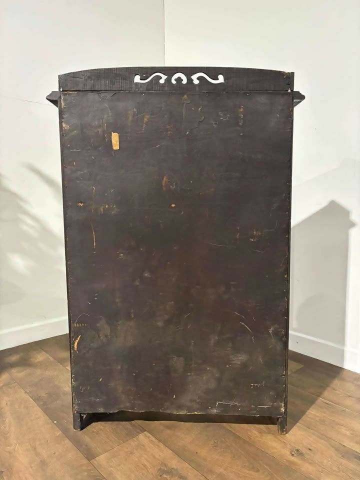 The base houses a single shelf, supported by later makeshift pieces which remain sturdy. Above, a single drawer sits between two pull-out arms (with matching knobs) that support the drop-leaf writing surface. The drawer features highly decorative handles, and the leaf itself is embellished with decorative metalwork. It lowers smoothly and includes a handle at the top for ease of use.