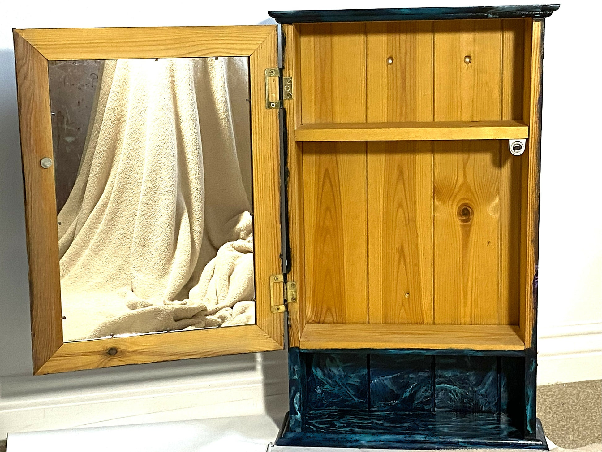 The cabinet dates back the 1970’s solid pine construction. It has internal shelf and external cubby hole.