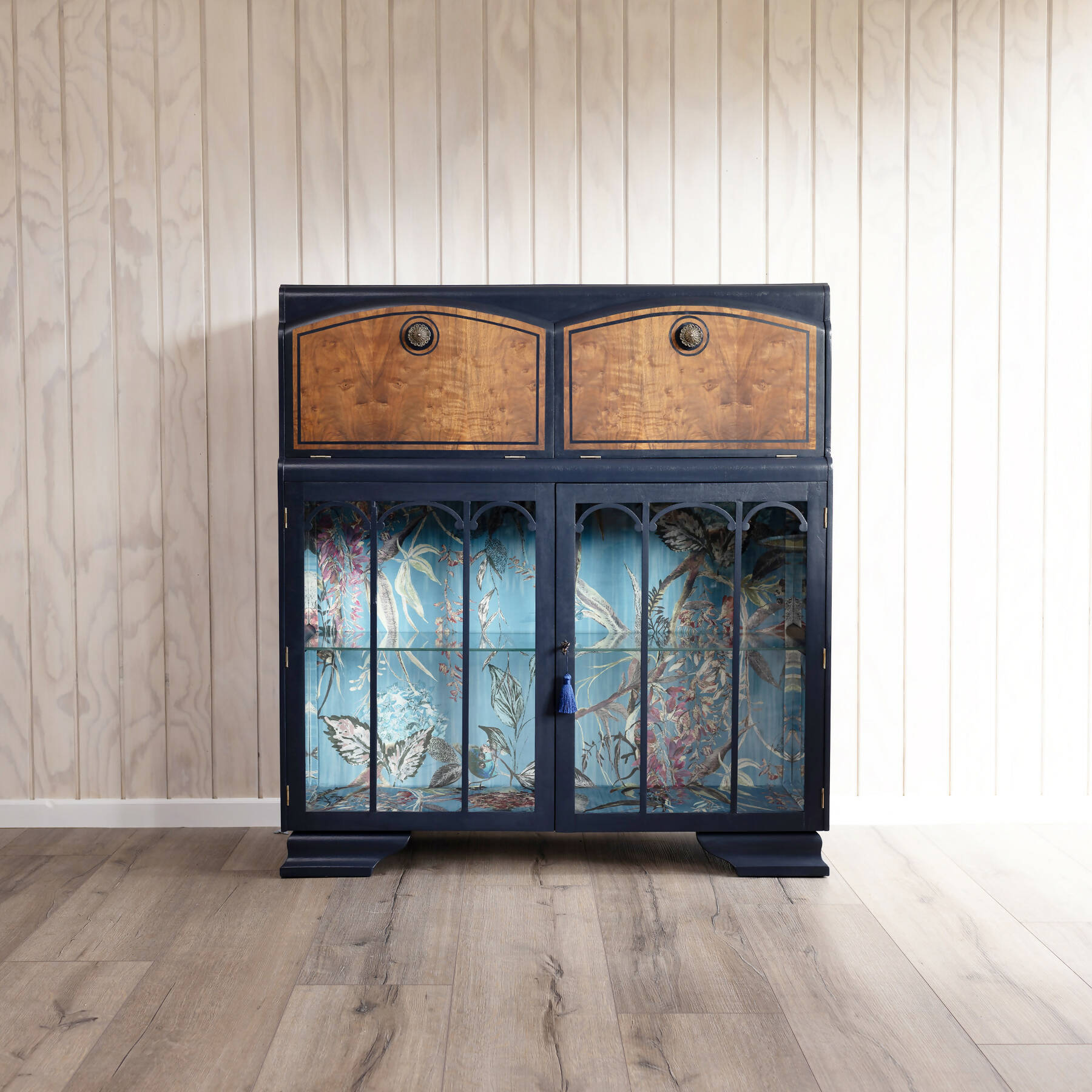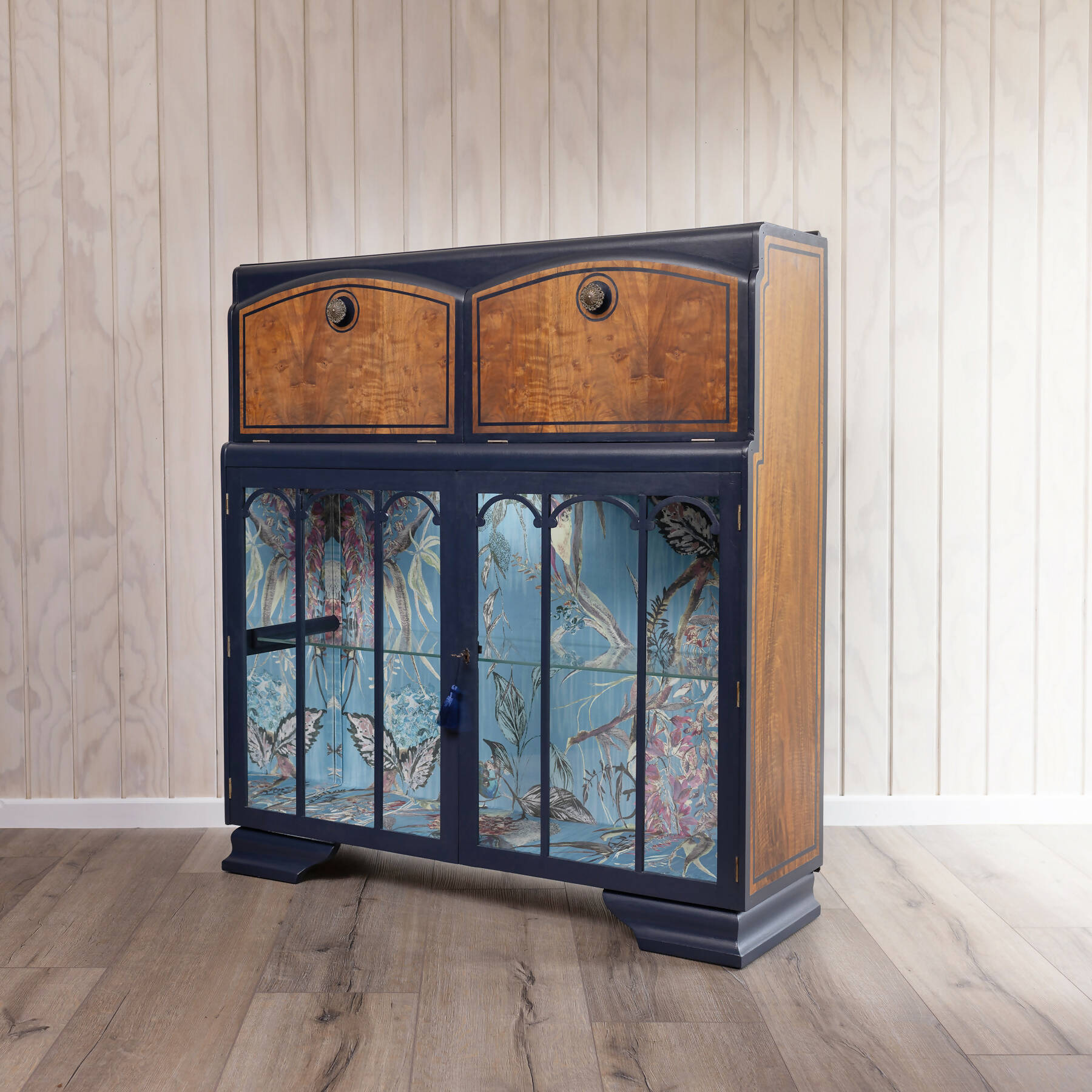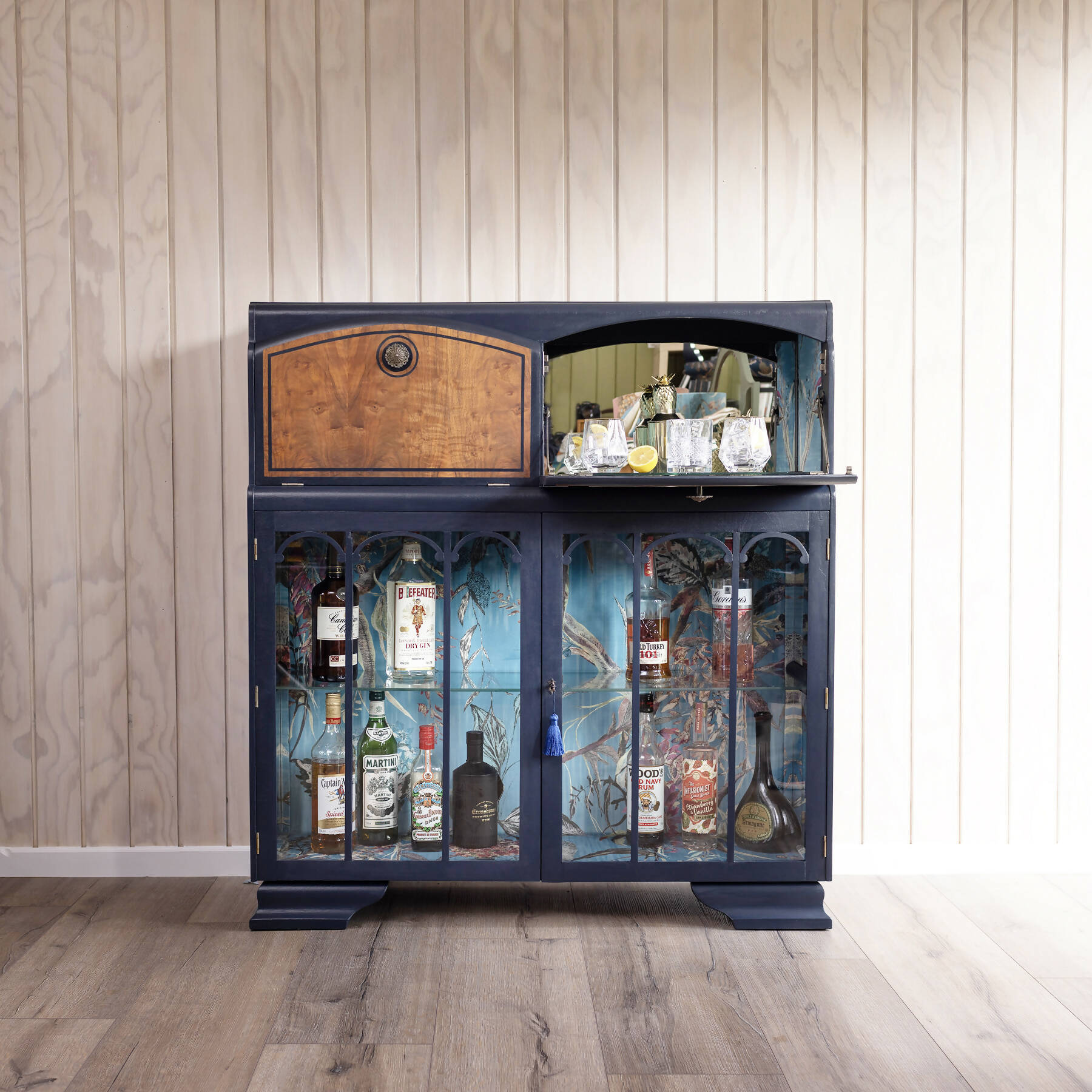 Available: One of a kind blue vintage cocktail cabinet, vintage drinks cabinet, cocktail bar, desk and drinks cabinet combined.