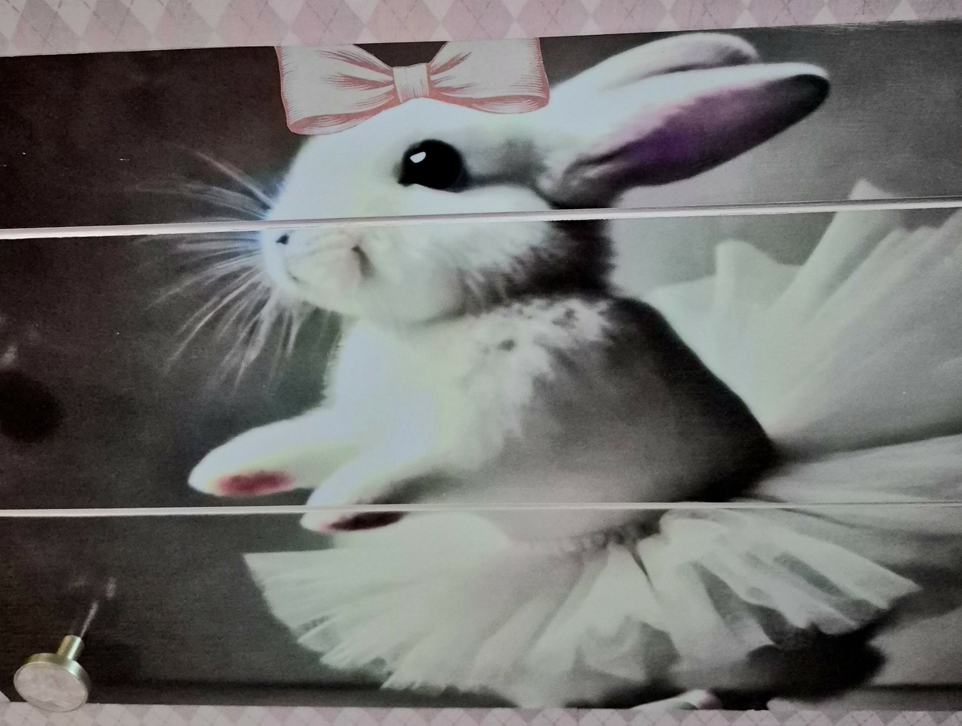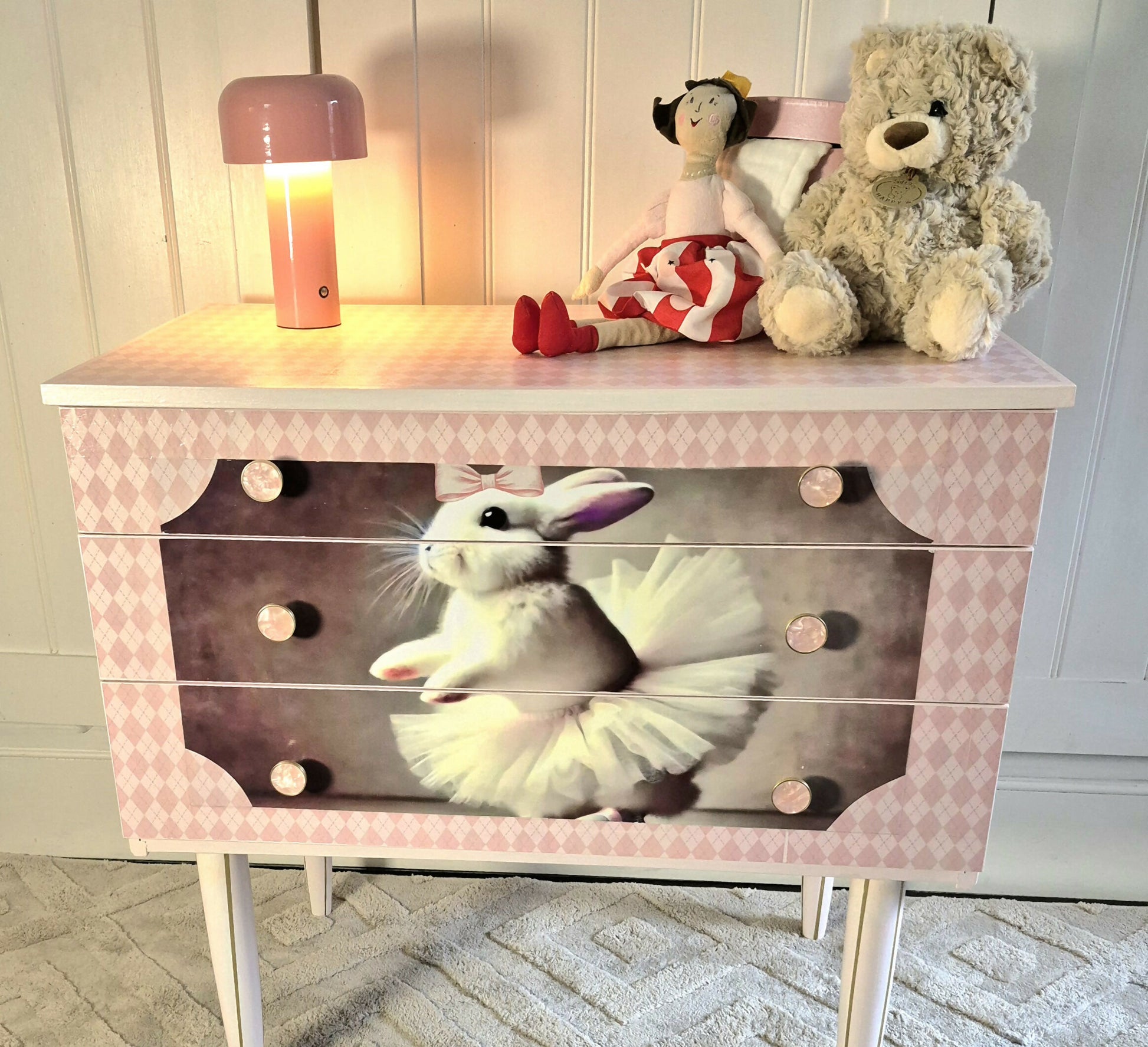 Drawers covered with a sweet bunny ballerina decoupage – perfect for a child’s room.
