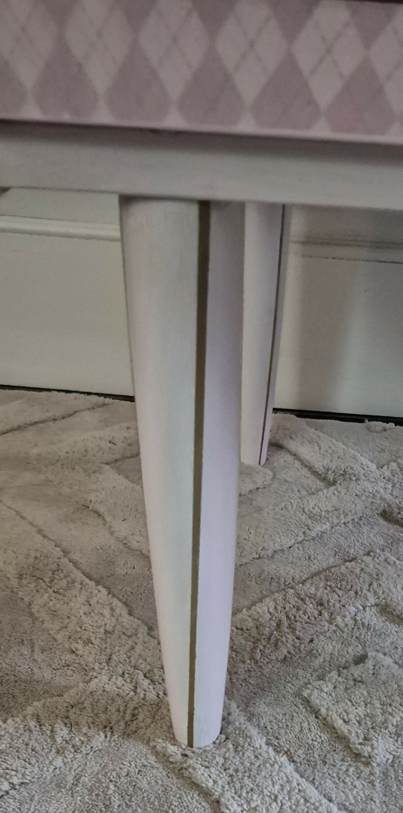 Legs painted in pink and gold stripes, giving it a cheerful, whimsical twist.