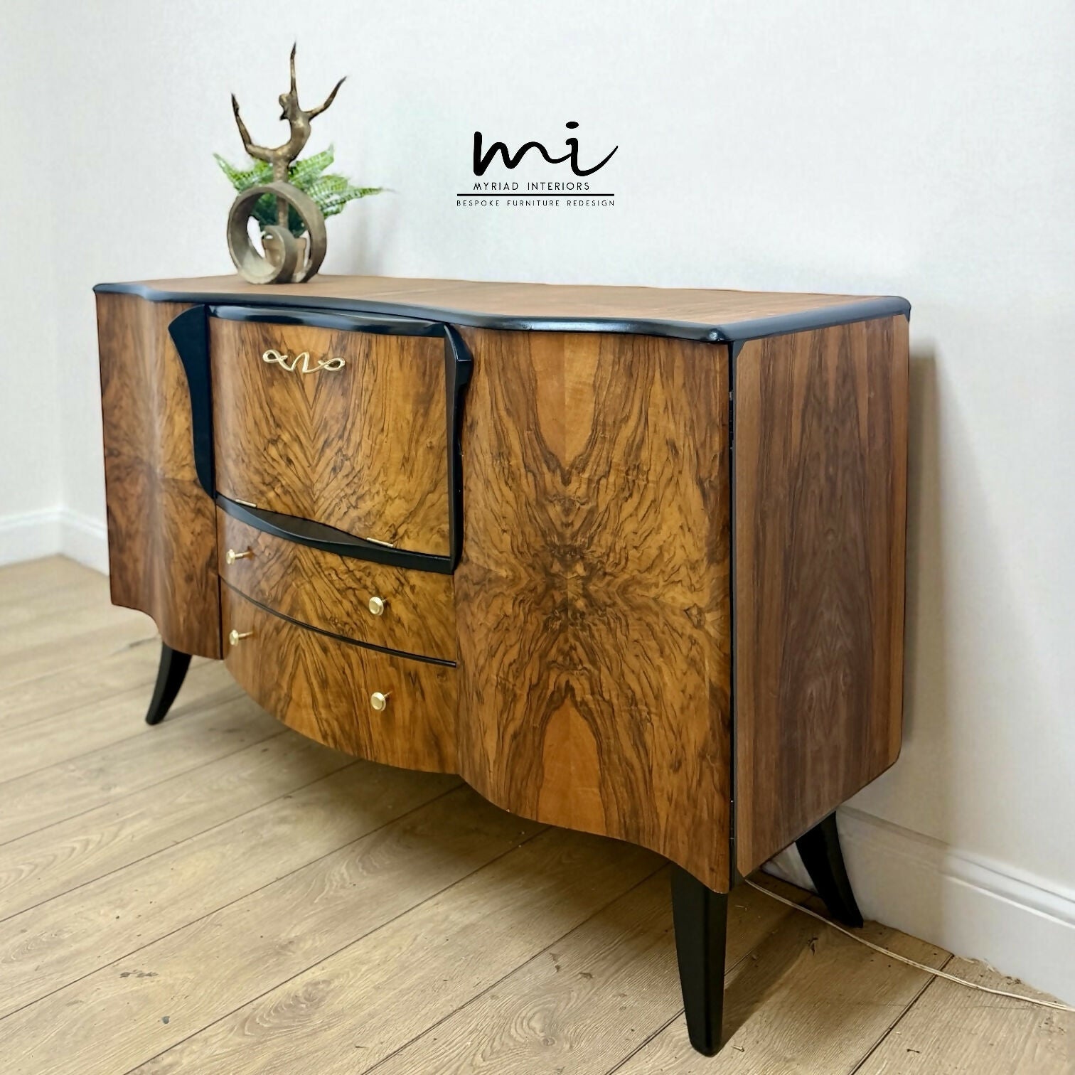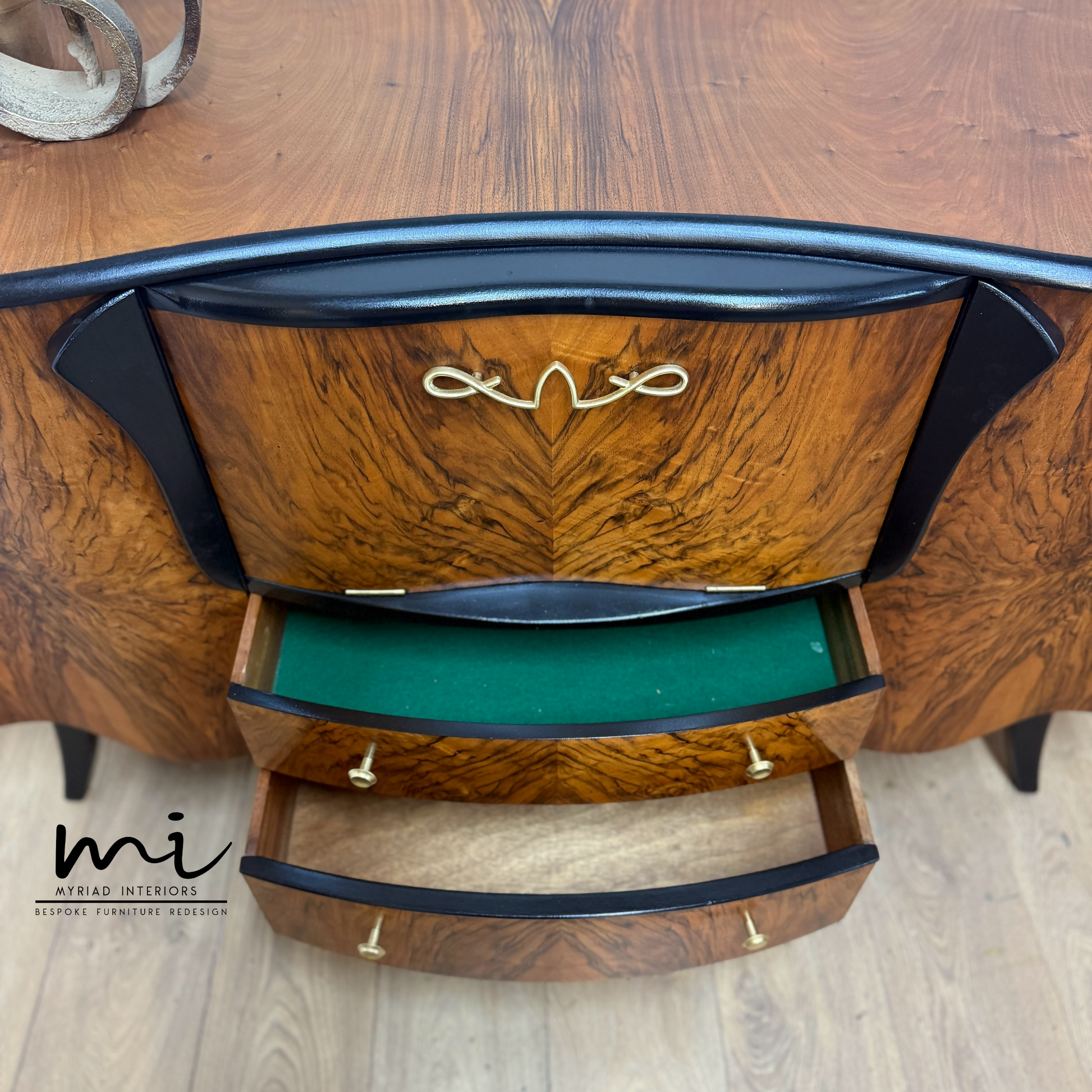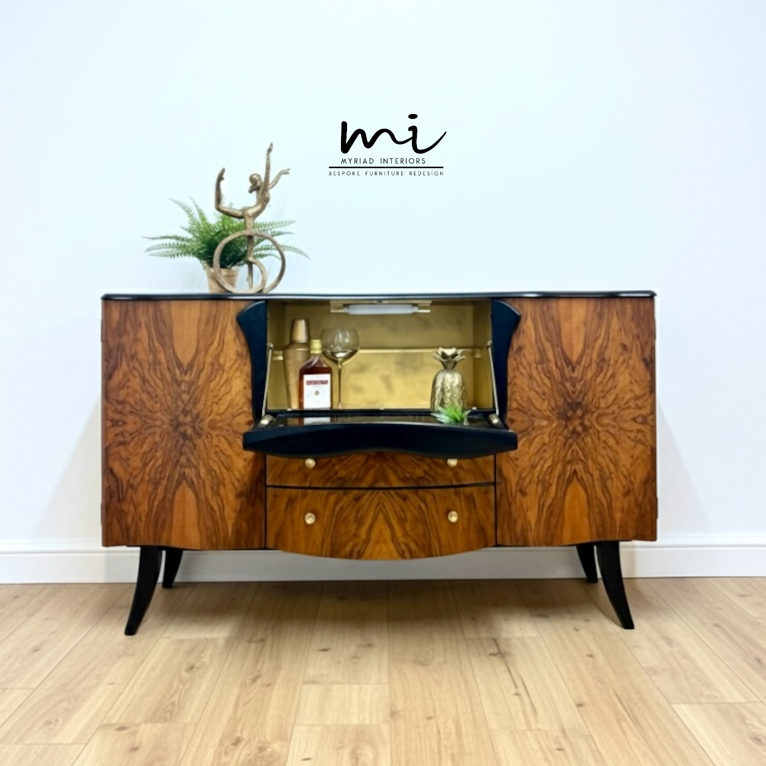 Refinished Art Deco Stonehill cocktail cabinet in black, hand painted, vintage drinks cabinet, gin bar, burr walnut, sideboard