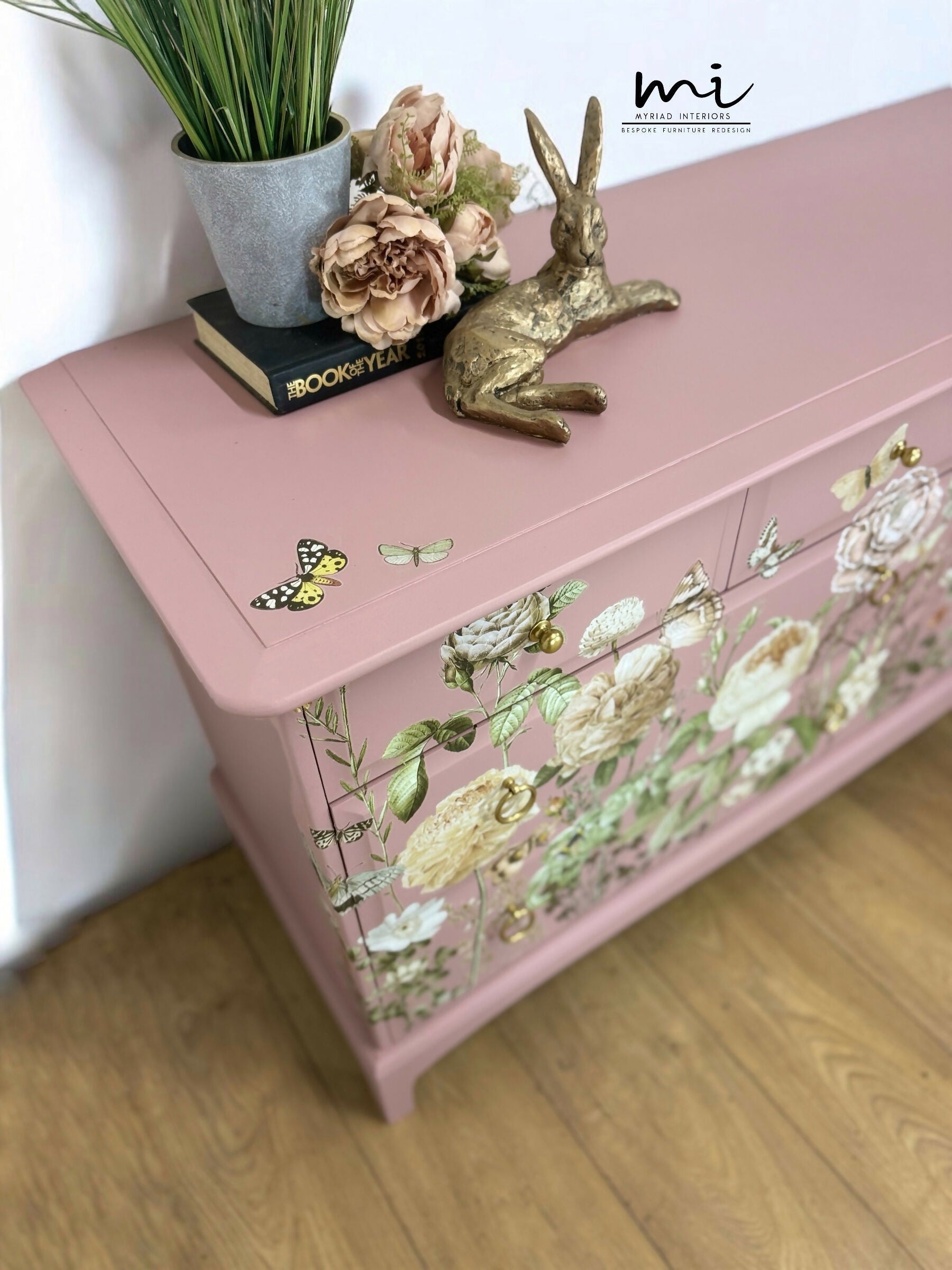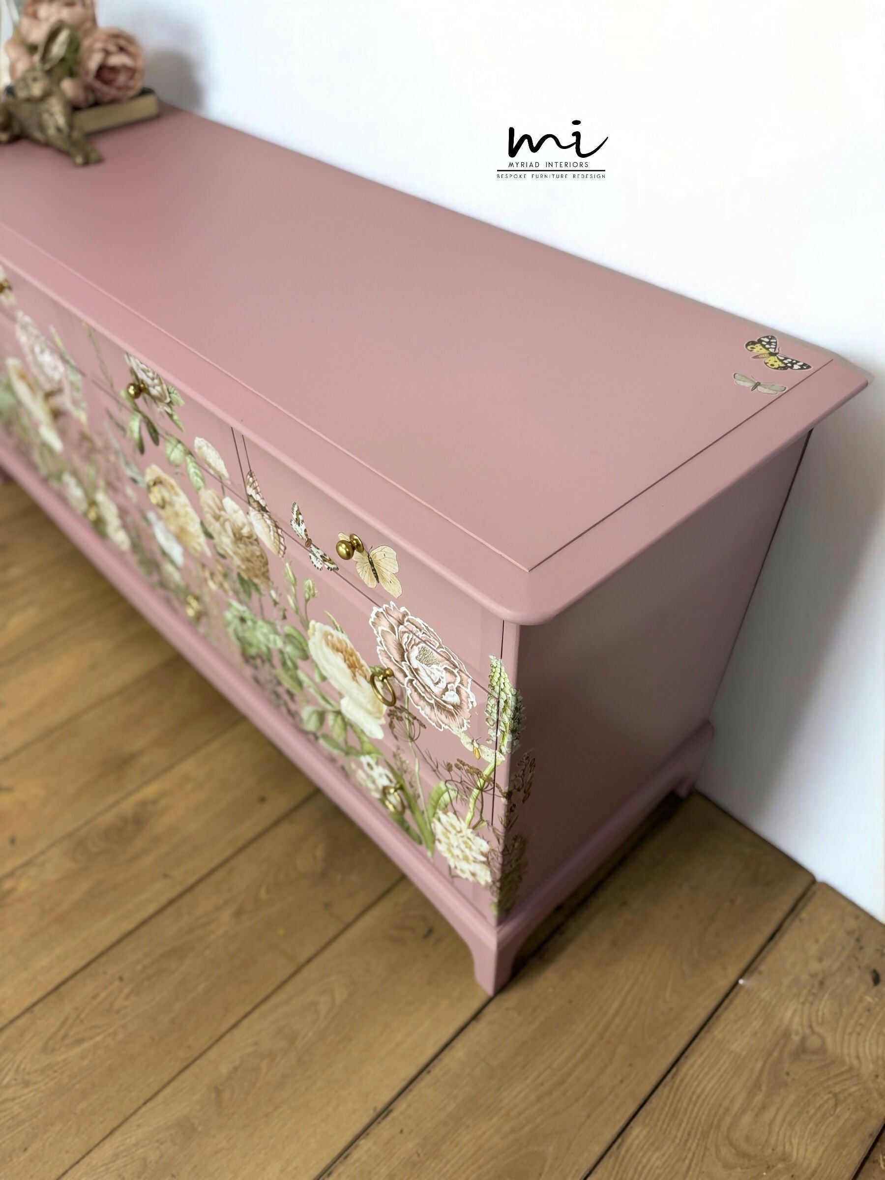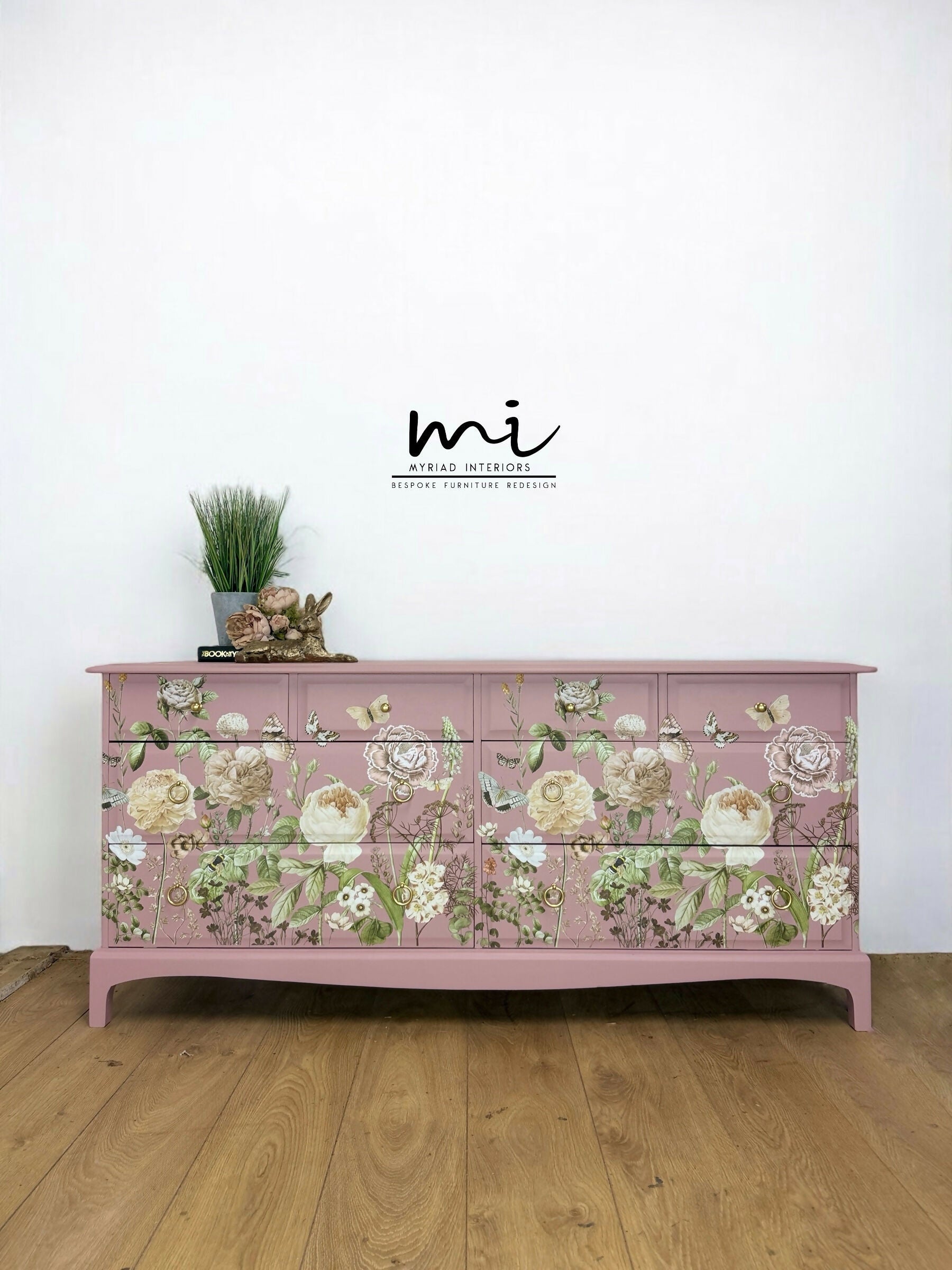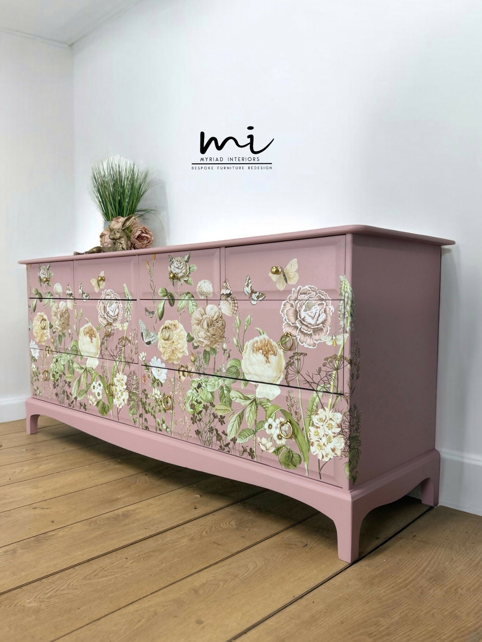 Refinished Stag Minstrel Captains Chest Of Drawers In Dusky Pink With Floral Design, large drawers, sideboard