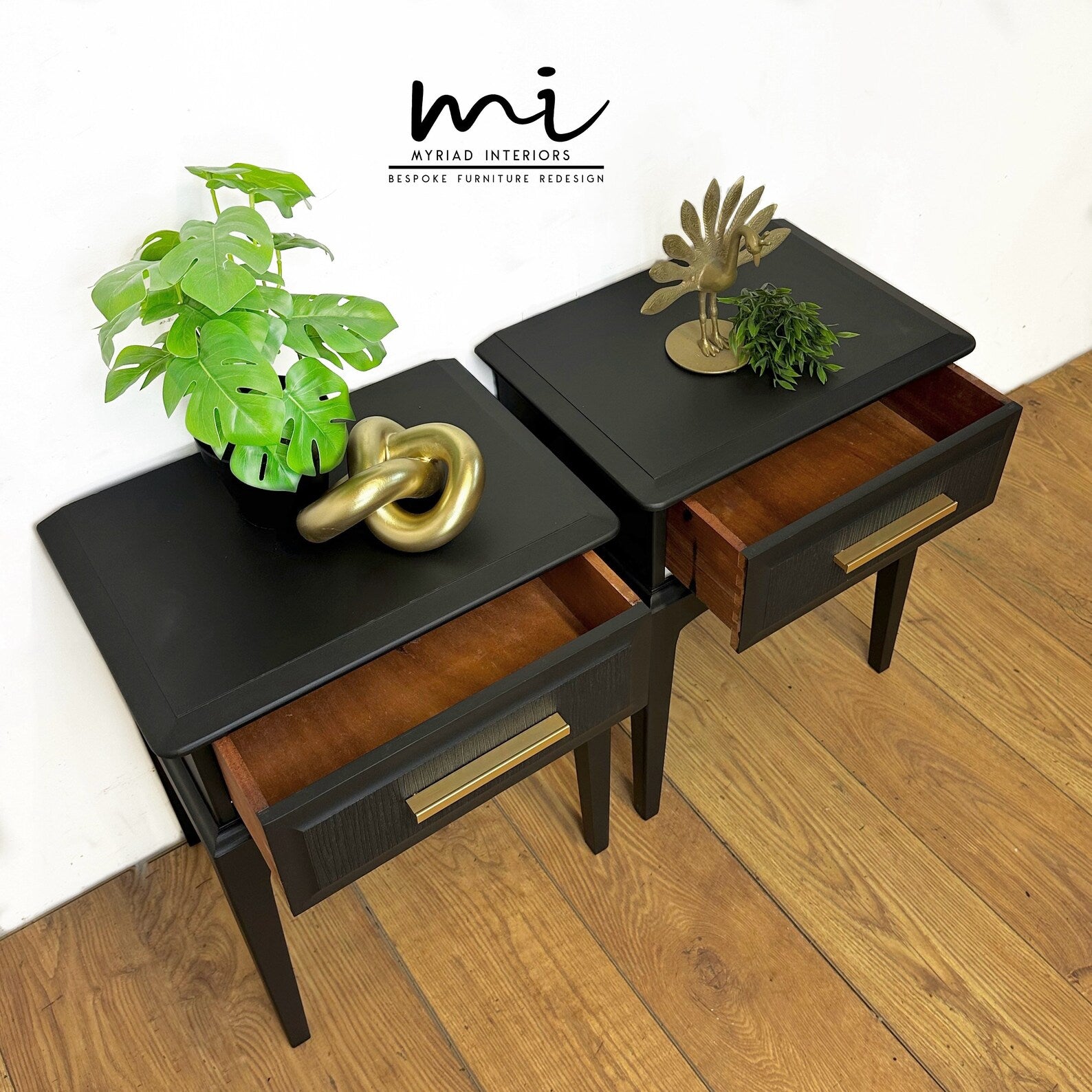 Made To Order Refinished Vintage Stag Minstrel bedside tables in black, gold, nightstands, mid century, bedroom drawers