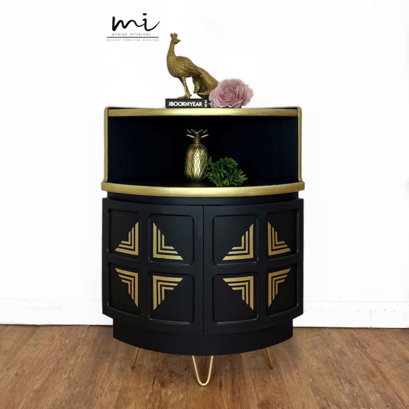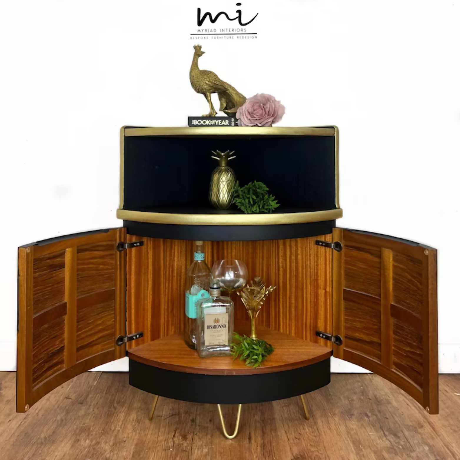Refurbished Nathan corner cabinet, drinks cabinet, cocktail bar, retro, art deco, black and gold, teak, console, sideboard, upcycled