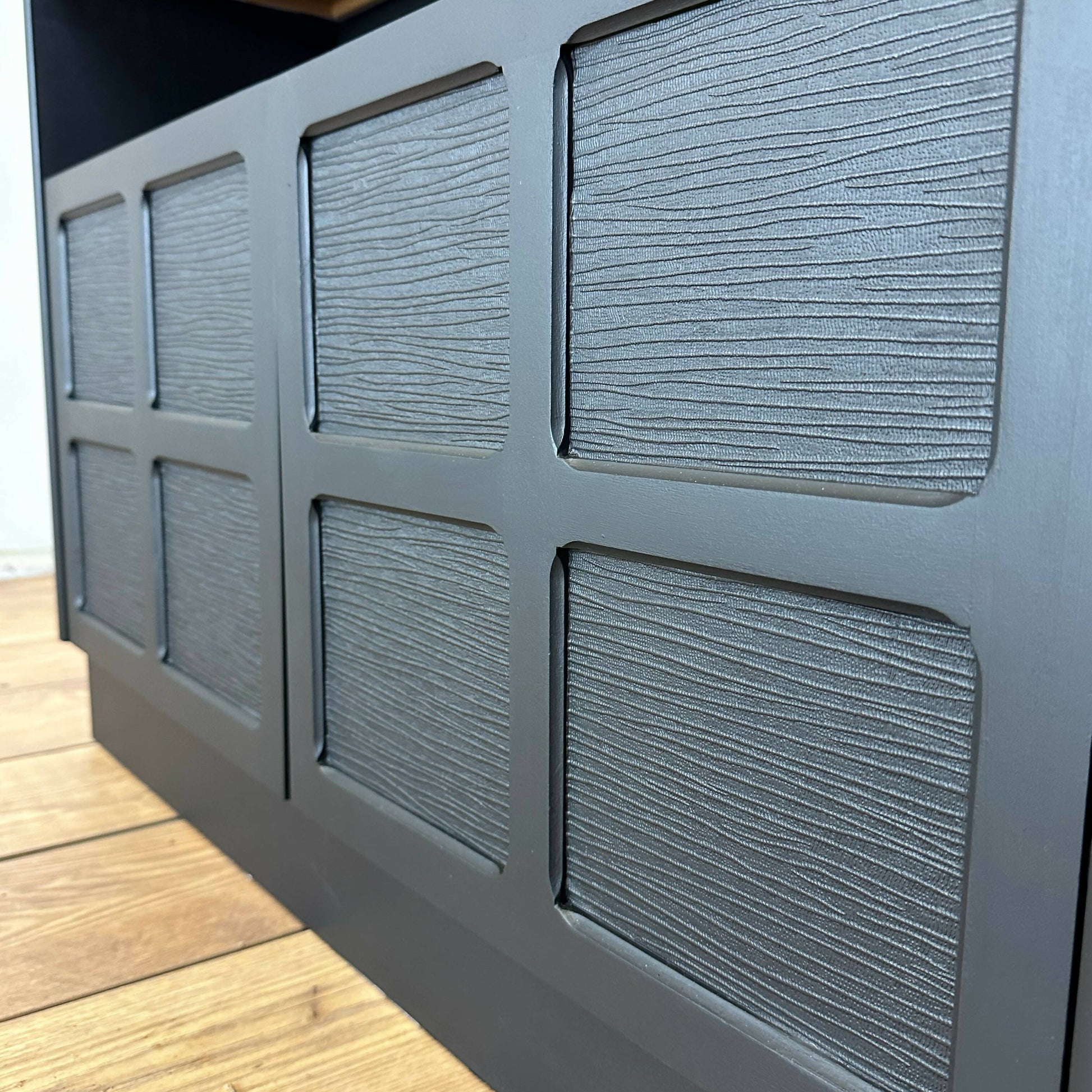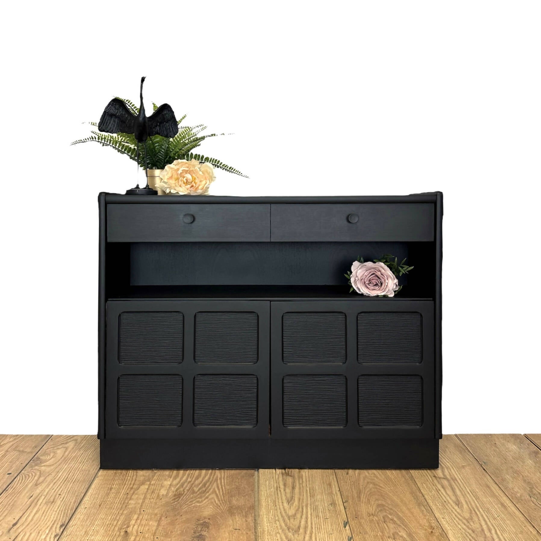 This rare slim Nathan teak sideboard is a versatile and stylish addition to any space, especially ideal for narrow hallways. Carefully sanded, prepped, and refinished in a sleek black, textured decoupage has been added in the squares giving a unique look. This multifunctional piece could serve as a sideboard, drinks cabinet, or even a slim TV unit, offering both practicality and aesthetic appeal.