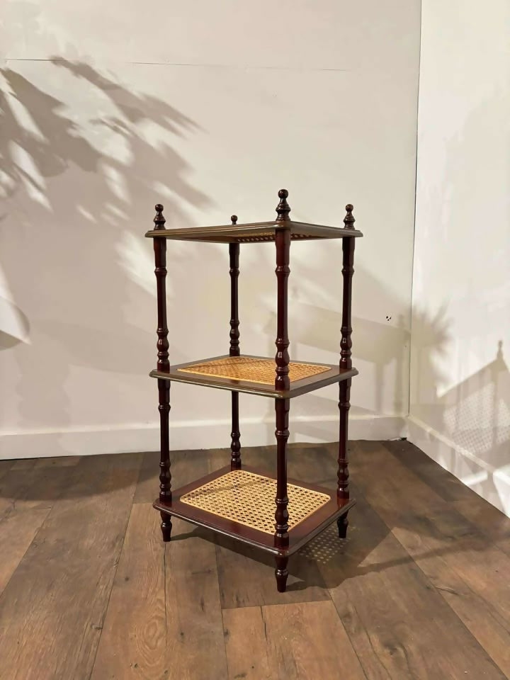 A handsome reproduction piece featuring a mahogany frame with wicker shelves, sometimes called a bergère-style étagère. Lovely proportions and plenty of storage or display space.
