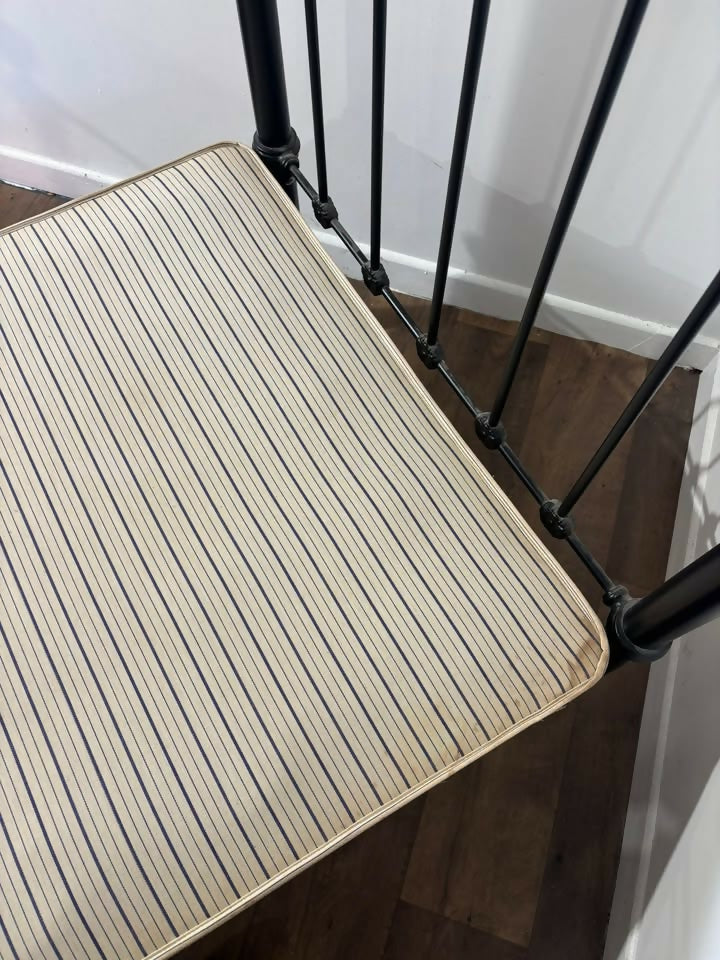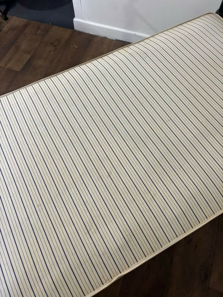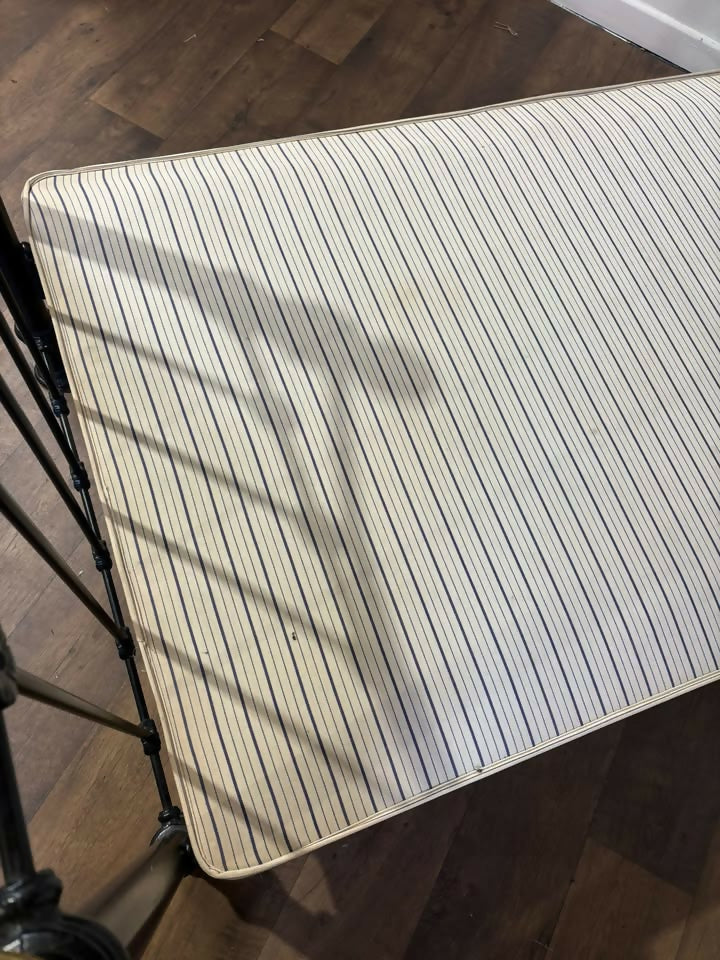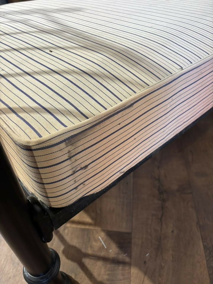 The bed is fitted with an upholstered base, designed for a mattress to rest directly on top. There are some stains visible to the side of the base upholstery, as shown in the photographs, which may benefit from cleaning if desired. The frame itself shows light signs of wear and age-related marks, adding to its gently aged character without detracting from its overall appeal.