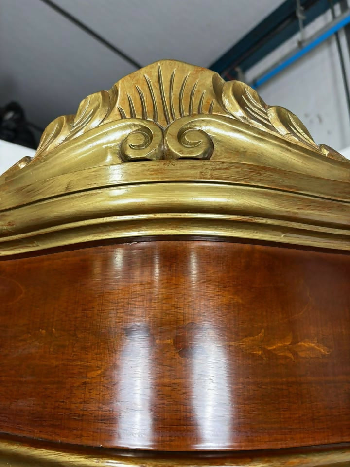 The cabinet is richly detailed throughout, with inlaid marquetry panels, curved form, and gold painted/varnished trim accenting the mouldings and edges. It comes with five keys, and both sections open and close as they should.
