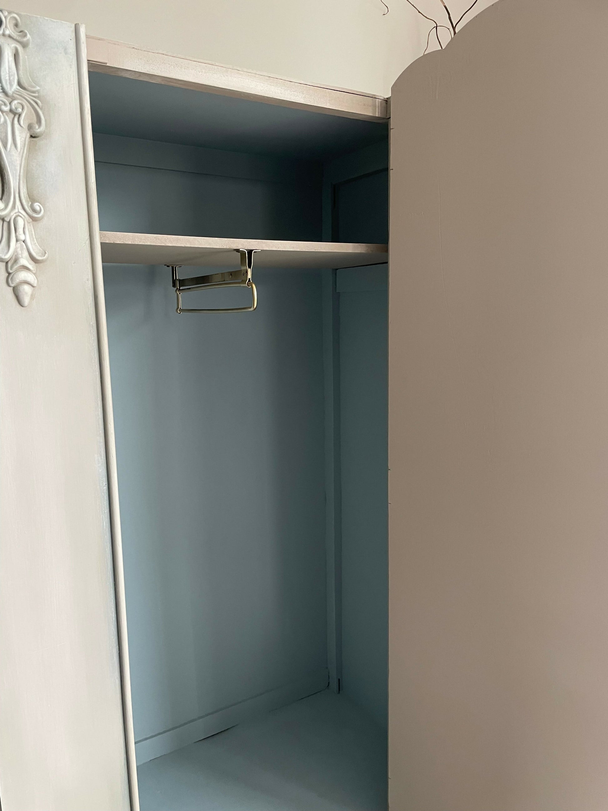 The interior has a top shelf for storage, a pull out rail for easy access and has been painted in a blue/green shade.