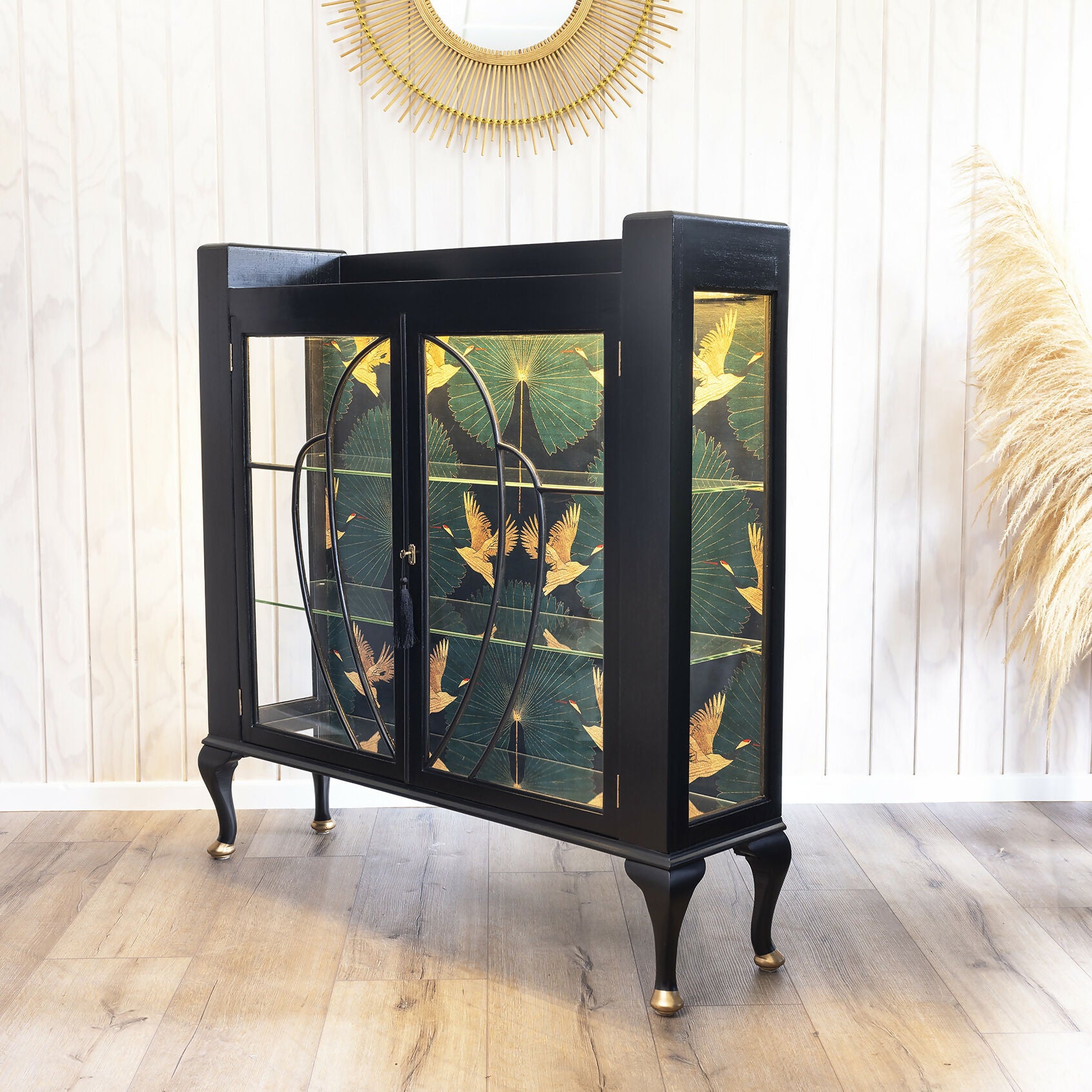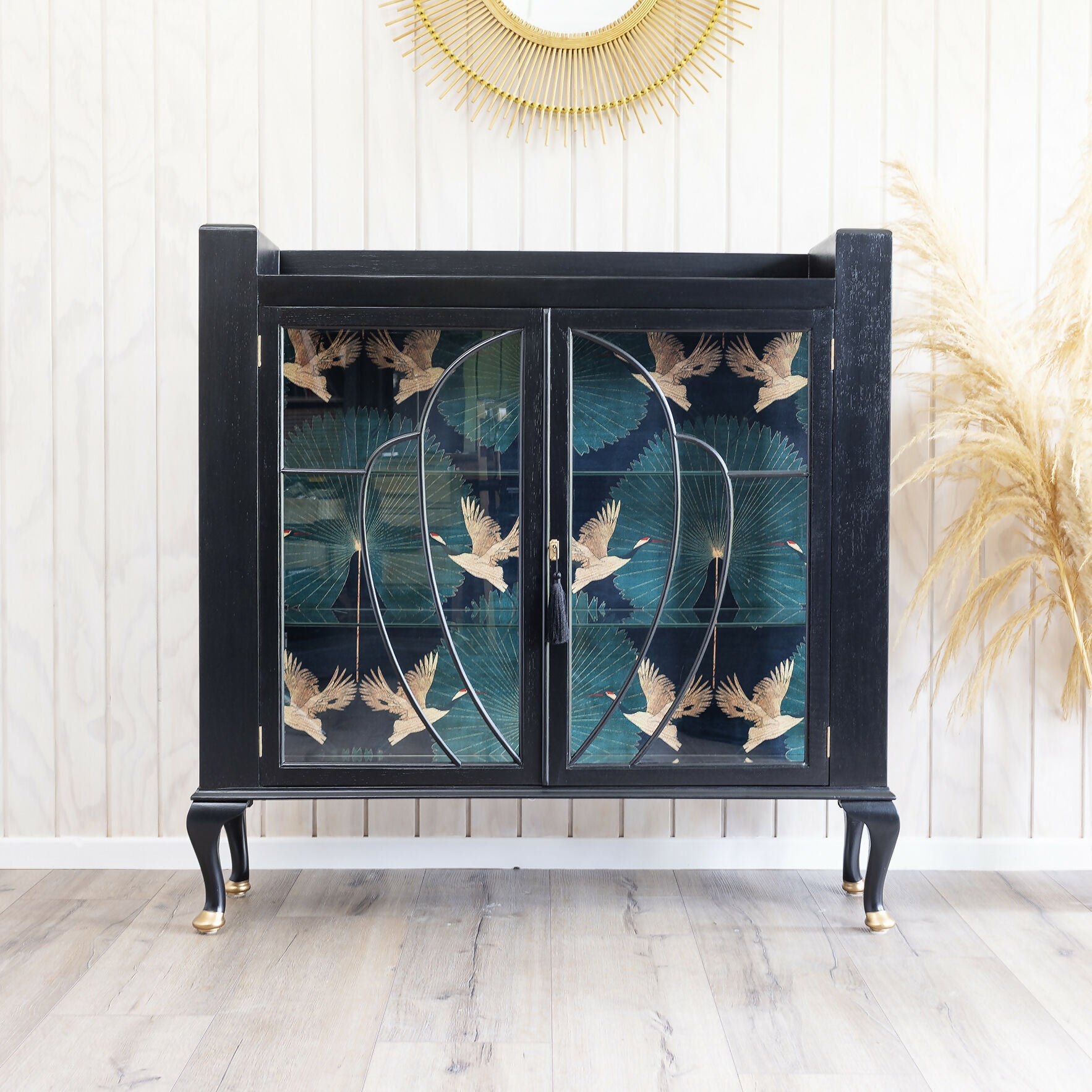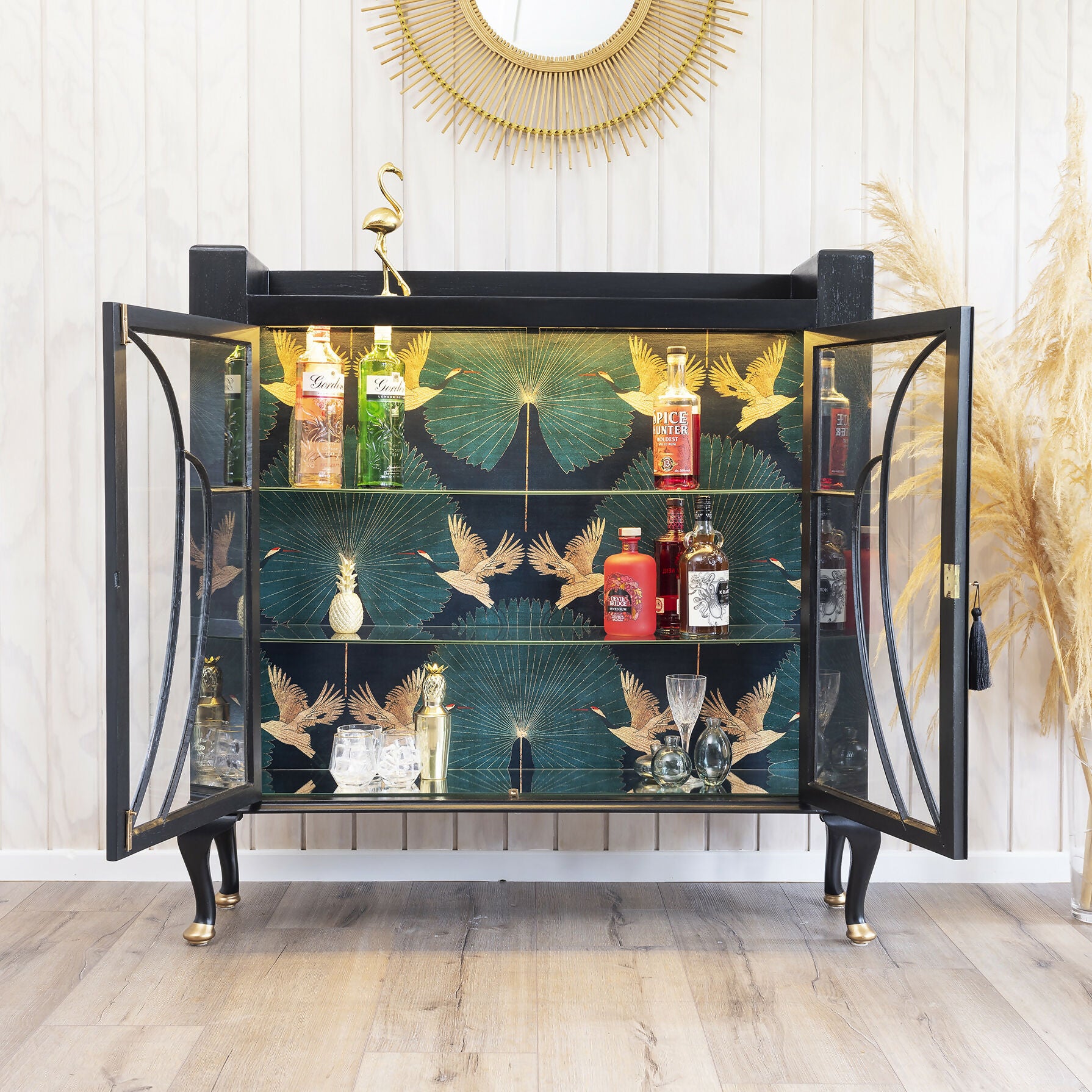 Exquisite Art Deco drinks cabinet decoupaged in a striking blend of emerald, subtle gold and black crane fabric. Sold, commission available.