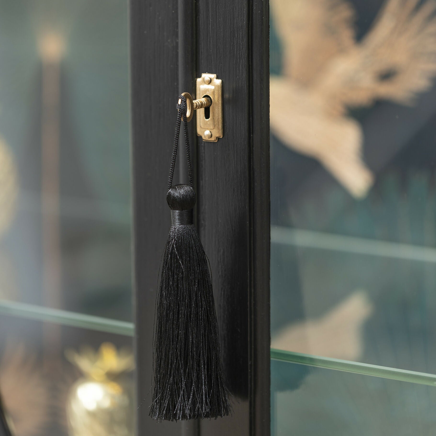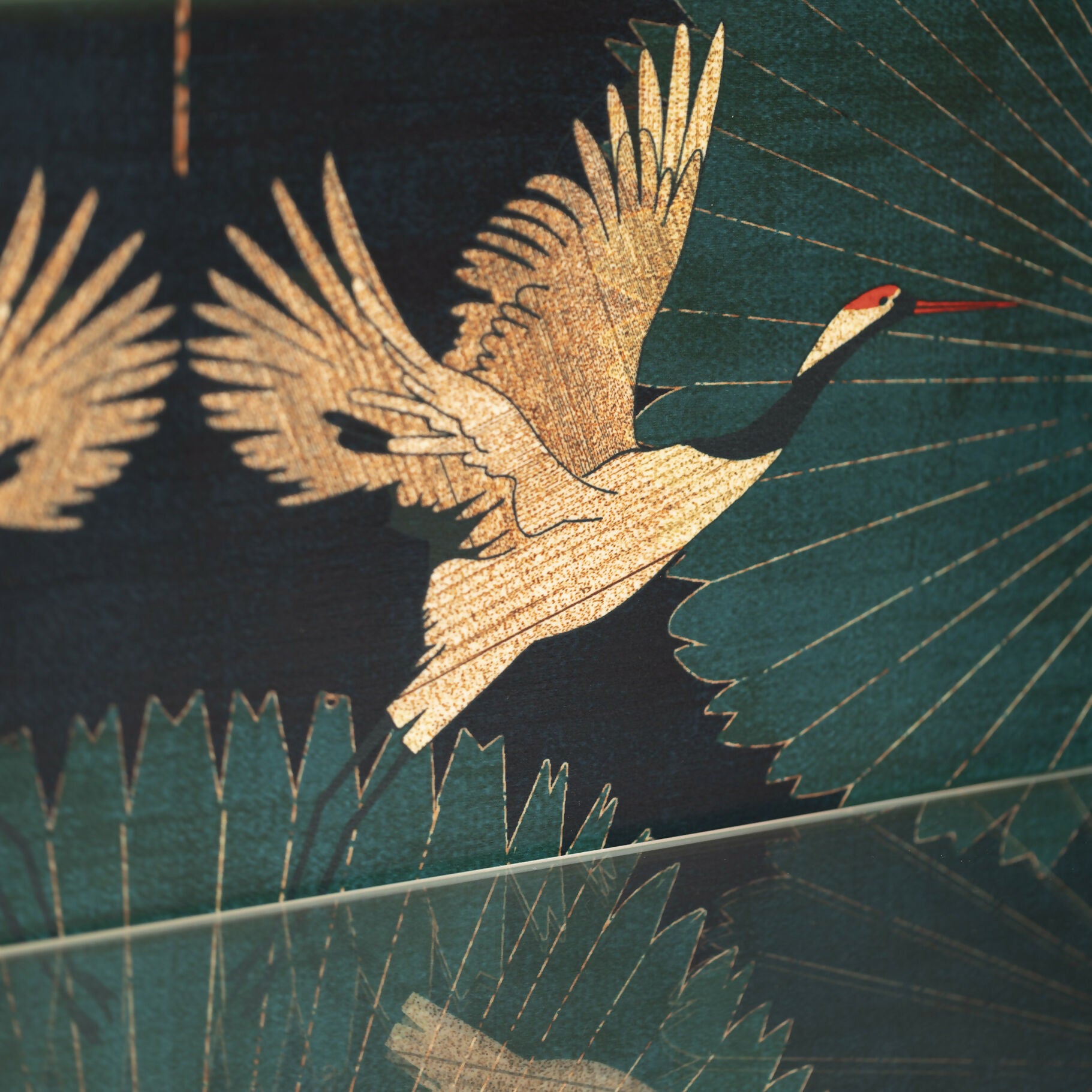 Decoupaged in luxury emerald green, black and gold crane fabric, complimenting the lines of this stunning Art Deco drinks cabinet.