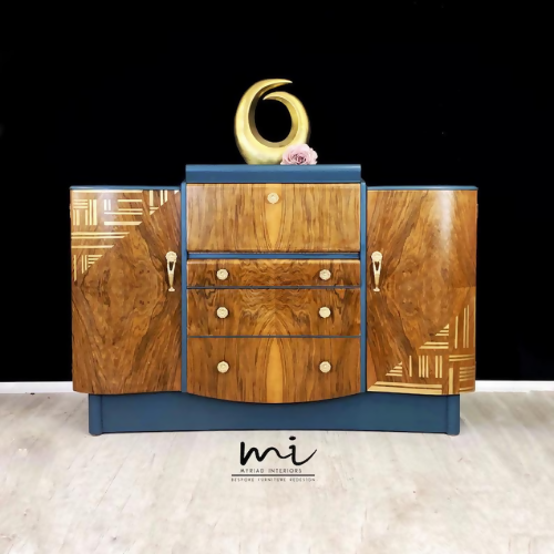 Completely stripped back to its barebones and then revamped with a gorgeous custom mixed shade of teal. The doors and drawers have been treated to a nourishing protective treatment to really make its grain pop. gold pattern adorns the doors and continues round to the sides to make its stand out from any angle.