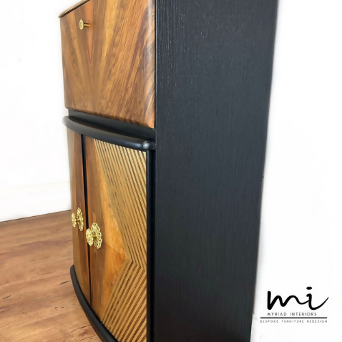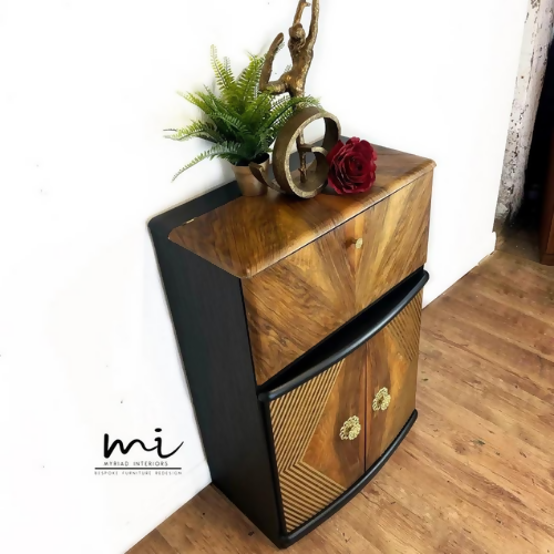 After coming to the workshop in a terrible state, it’s been completely stripped back to reveal some stunning grain! A complimenting gold design has been added to the doors with the top being left bare so as that the grain can be enjoyed as it should be. Modern textured paper adorns the sides which has been painted in a modern coal black.