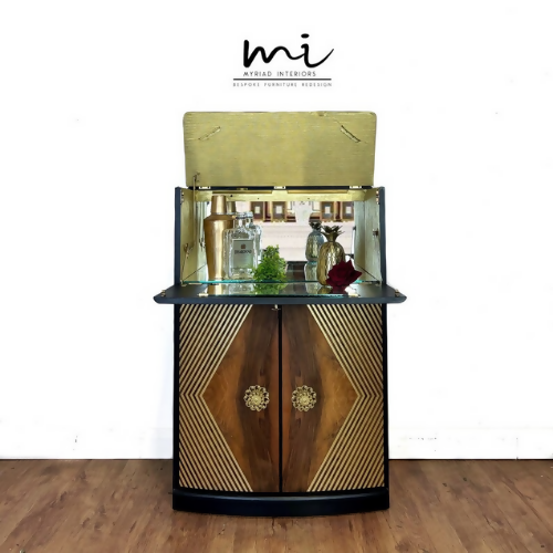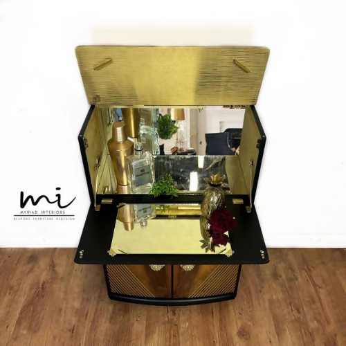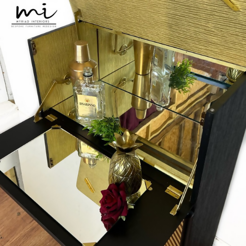 Pull door down the drop down door which simultaneously lifts the upper section to reveal a statement bar area. Matching texture lines the sides and top which has been finished in a bold gold and new mirrors have been added to finish it off.