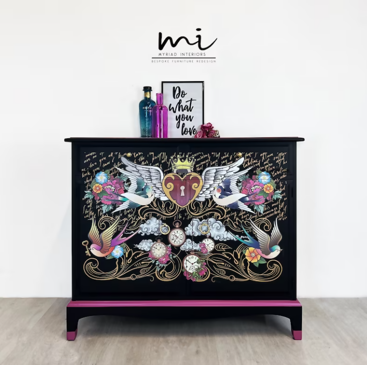 This refurbished vintage Stag Minstrel sideboard has been transformed into a stunning statement piece that is sure to impress. The piece has been refinished in a sleek and sophisticated black color that lends a sense of drama to the overall design, but what really sets this piece apart is the addition of a maximalist vintage tattoo inspired transfer “Hey Sailor”, which features a variety of iconic images including swallows, hearts, wings, and more. The transfer has been carefully applied to the surface of the sideboard and then sealed with a varnish creating a striking and intricate pattern that draws the eye in.