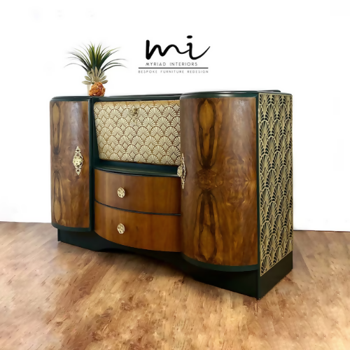 Her main outfit is a gorgeous custom mixed deep green. She’s had her side embellished with the Art Deco inspired shell onlay which has been painted in a classic gold. Her drop down has been hand stencilled in a matching design. Her doors and drawers have been sanded back and freshly treated to bring out the beautiful burr walnut grain whilst protecting her at the same time.