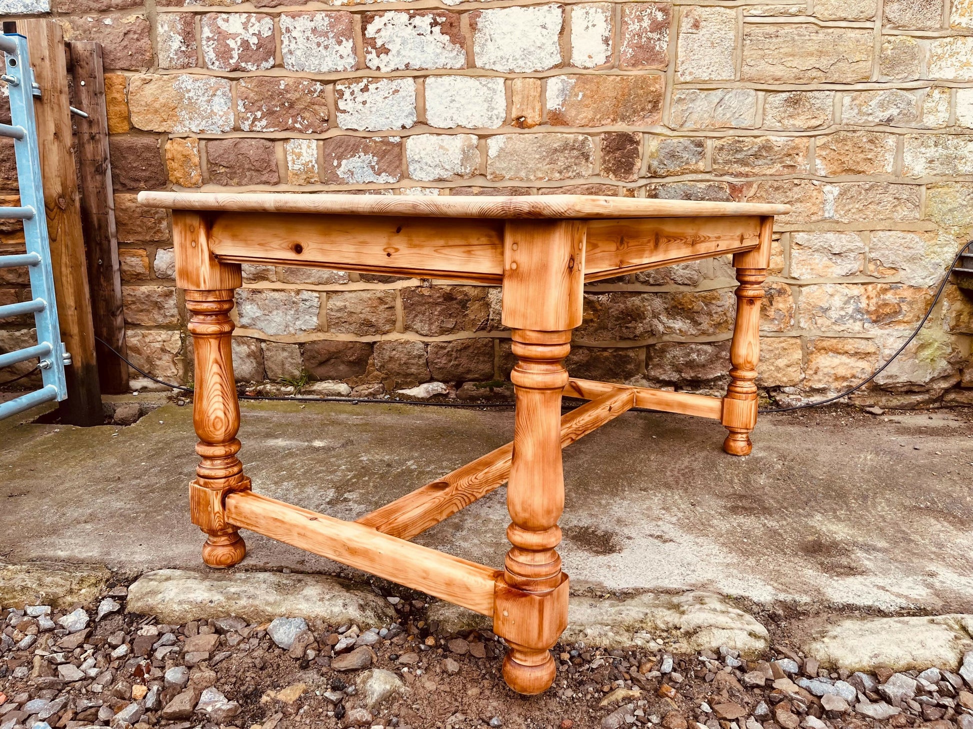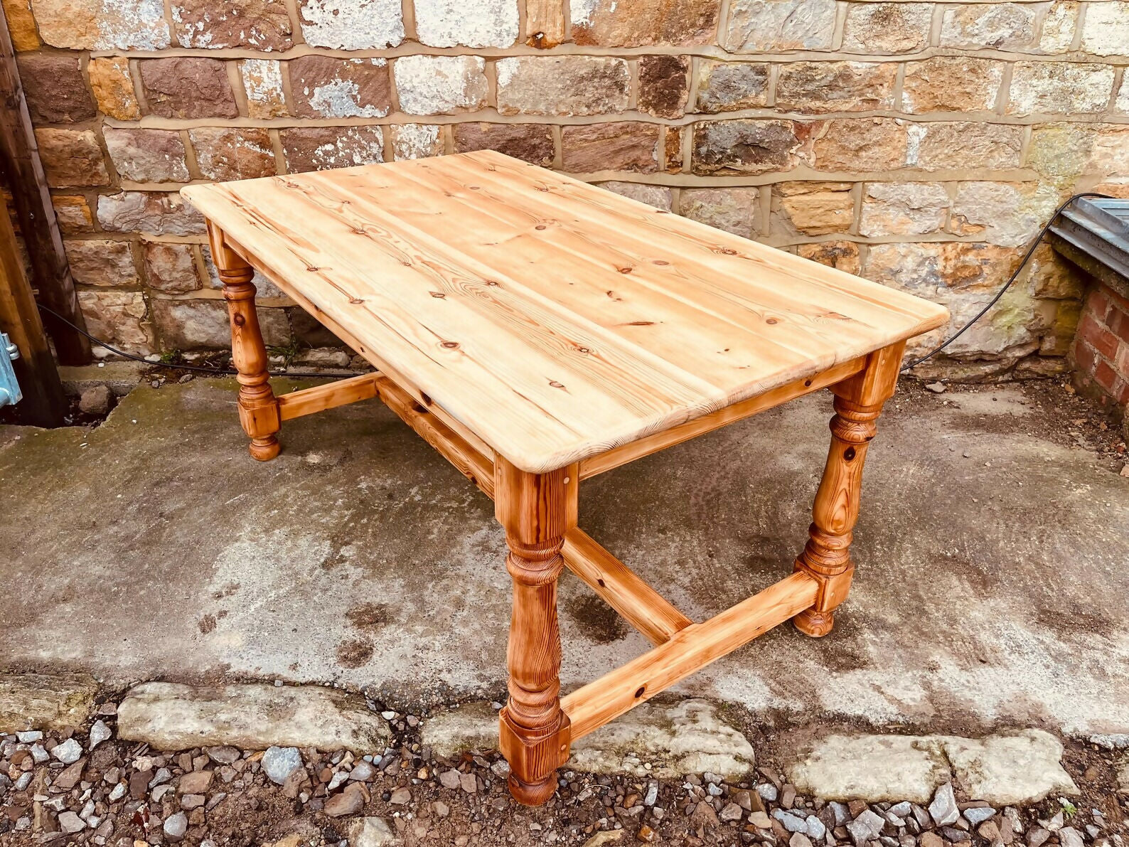 A beautifully crafted solid pine farmhouse dining table, full of warmth, character, and timeless country charm. This substantial piece has been carefully refreshed and finished to highlight the natural grain and knots of the pine, giving it an authentic rustic feel that suits both traditional and modern farmhouse interiors.
