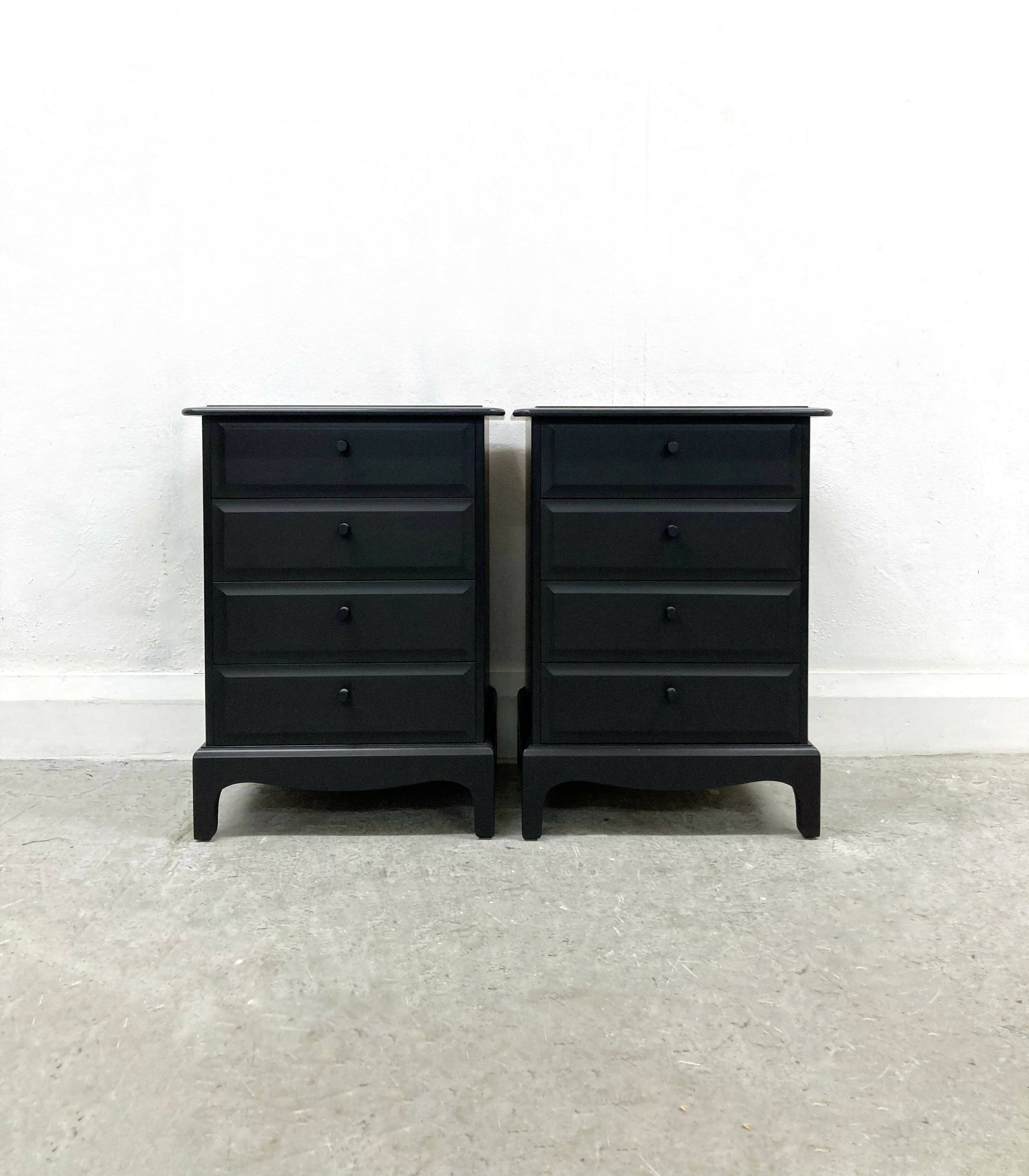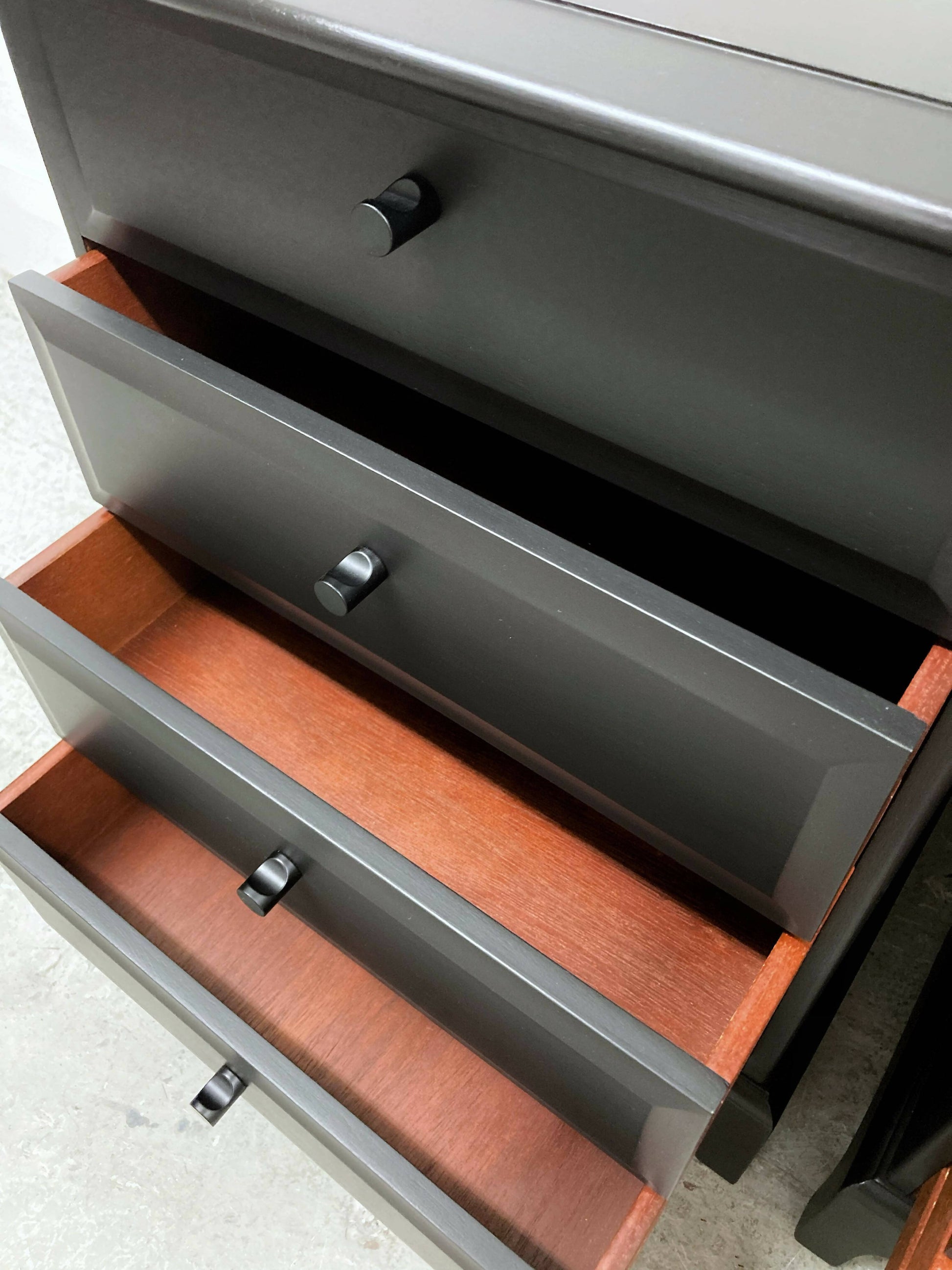 The Stag furniture set has been cleaned, hand sanded and hand painted in Annie Sloan ‘Athenian Black’ Chalk Paint which is jet black in colour. The Stag furniture set has been finished with clear wax which seals and protects the paint as well as giving the pieces a slight sheen. The insides of the drawers have been treated to some finishing wax polish, which enriches the warm wood colour.