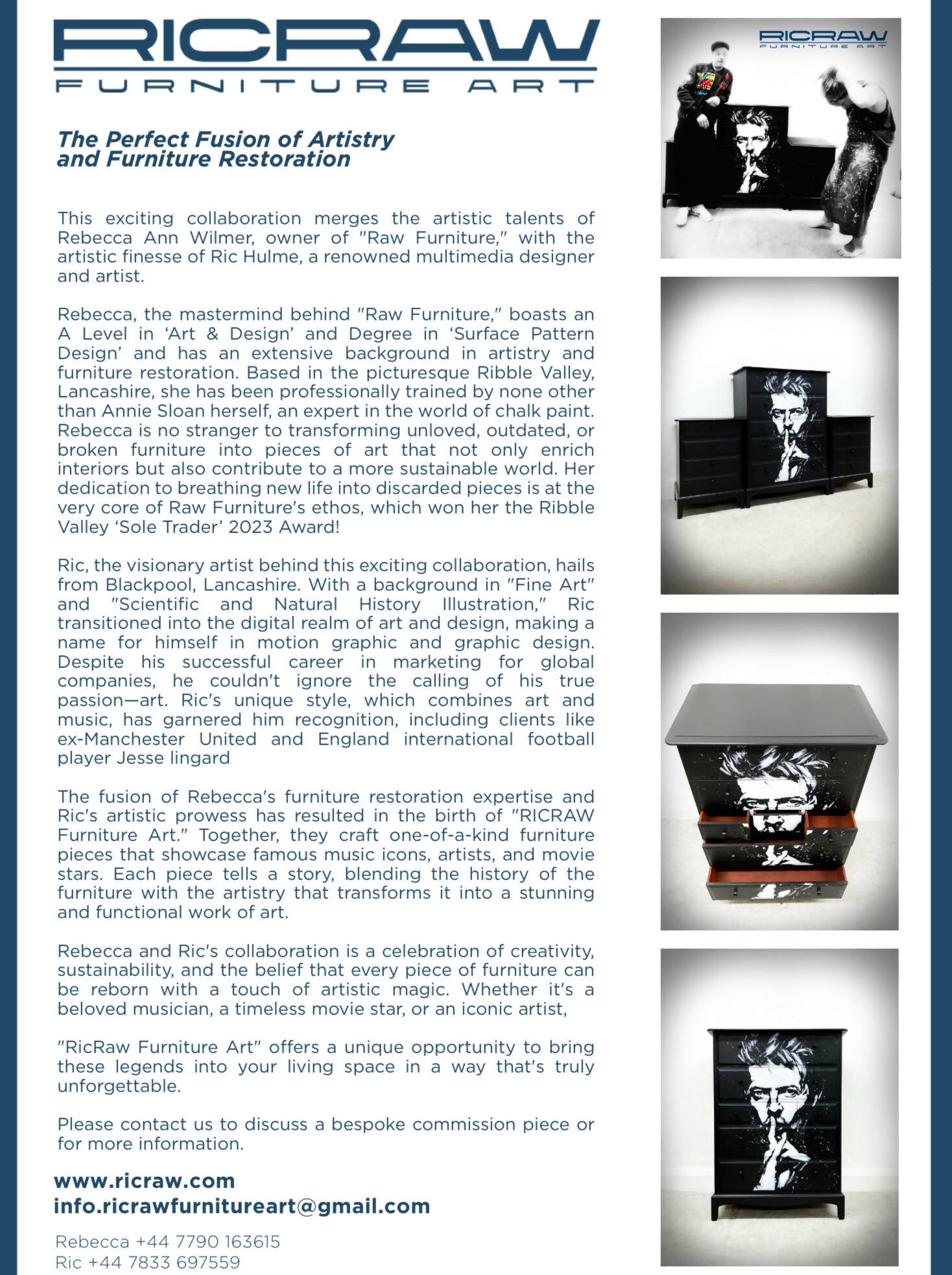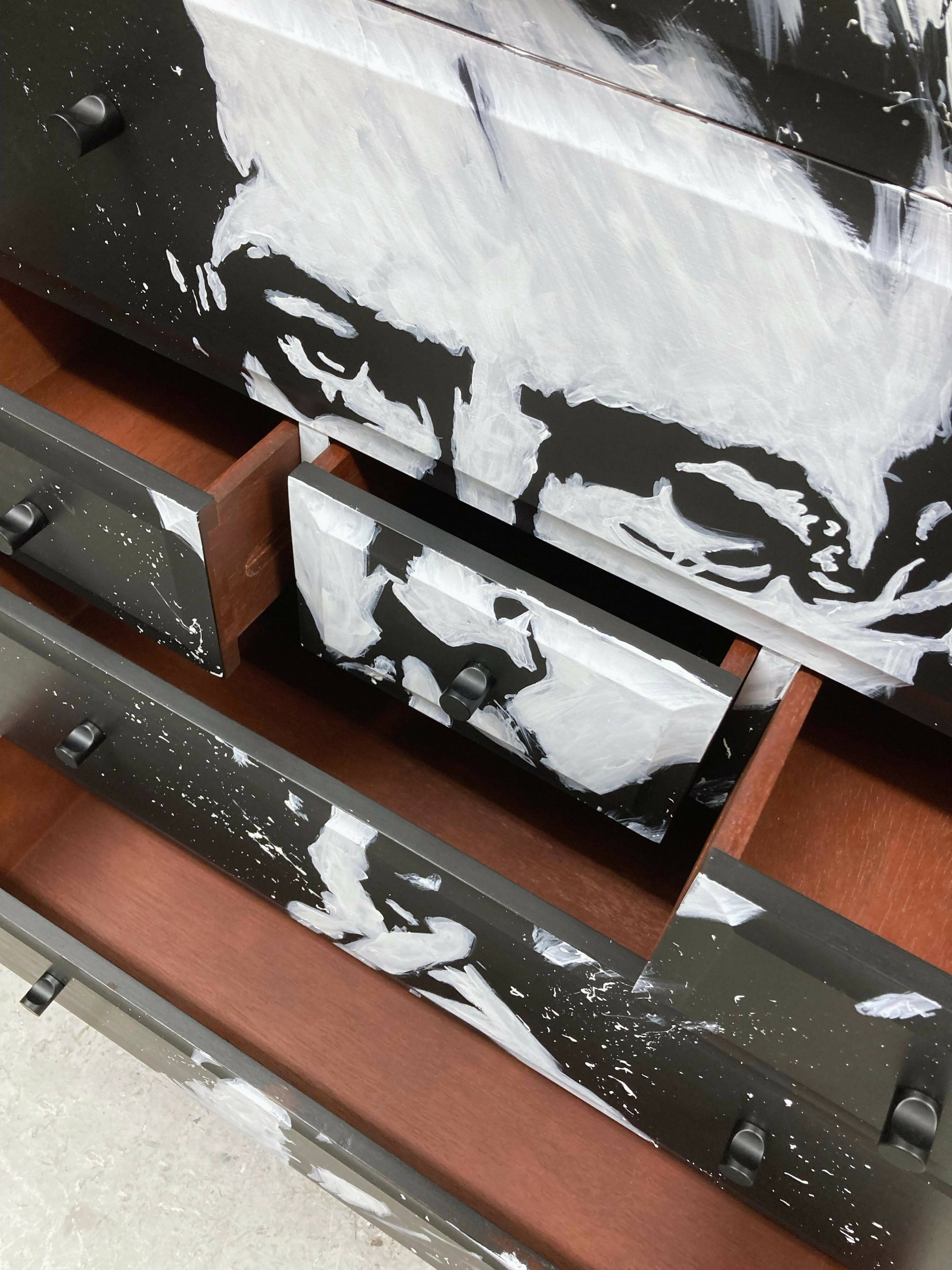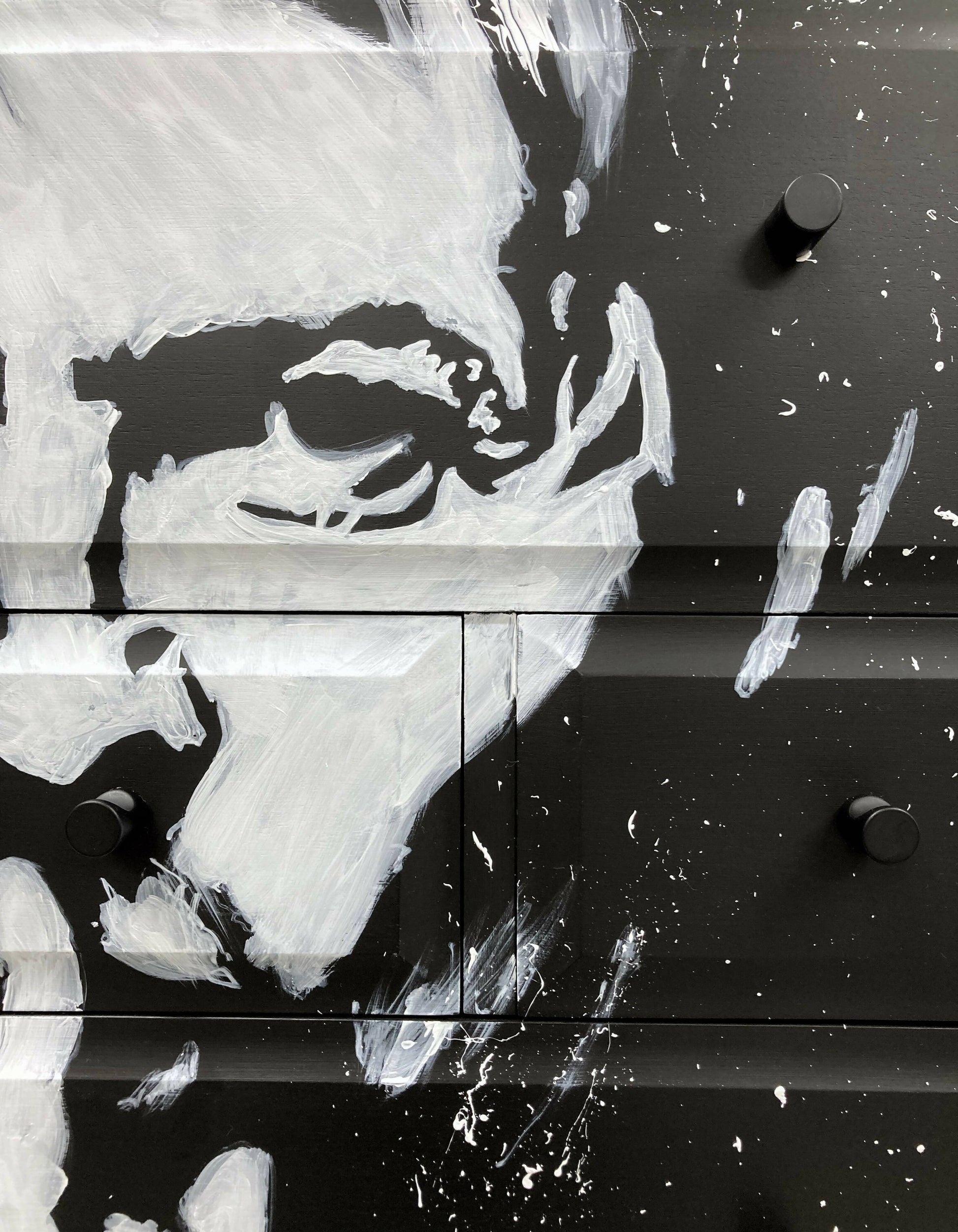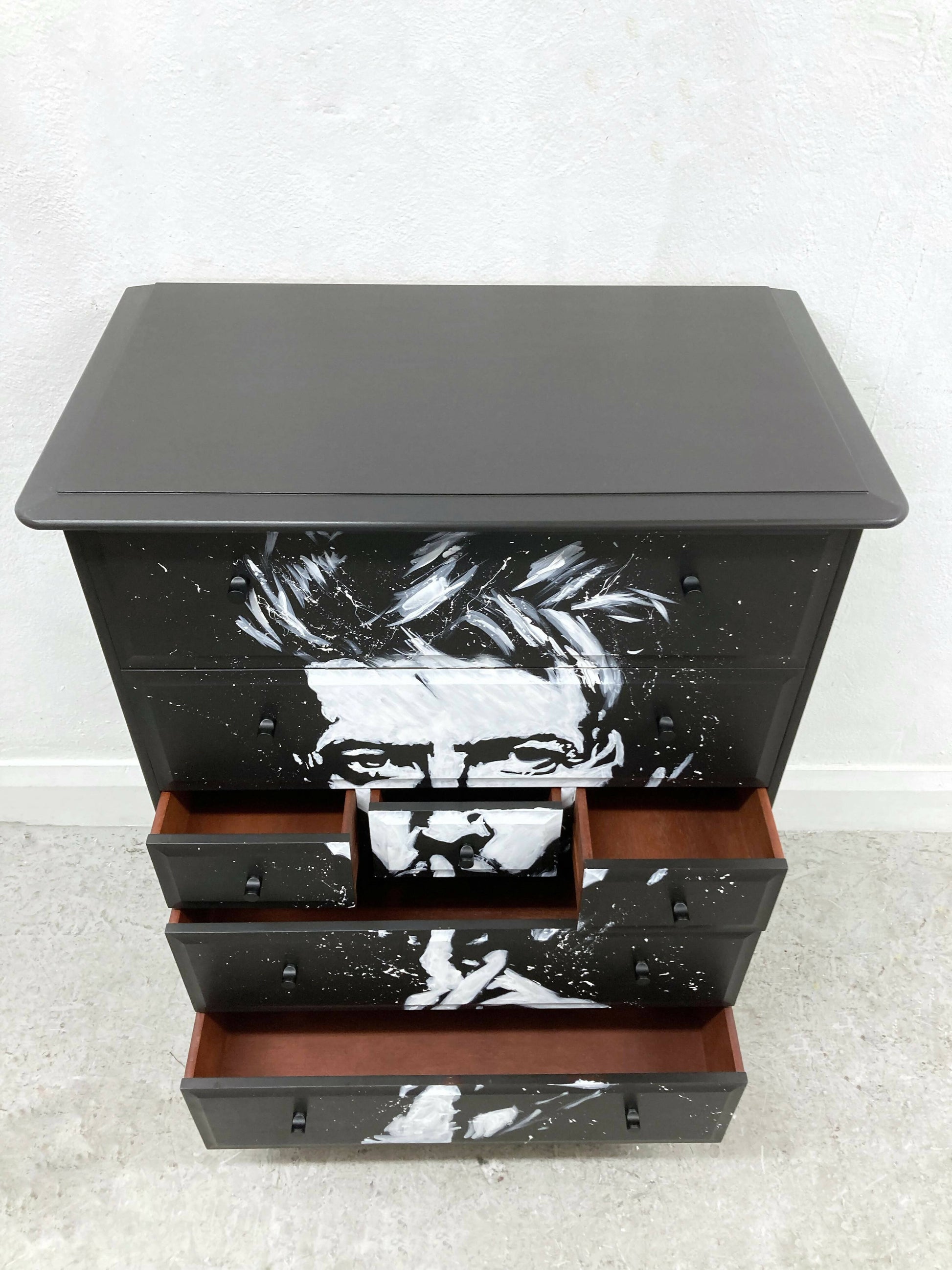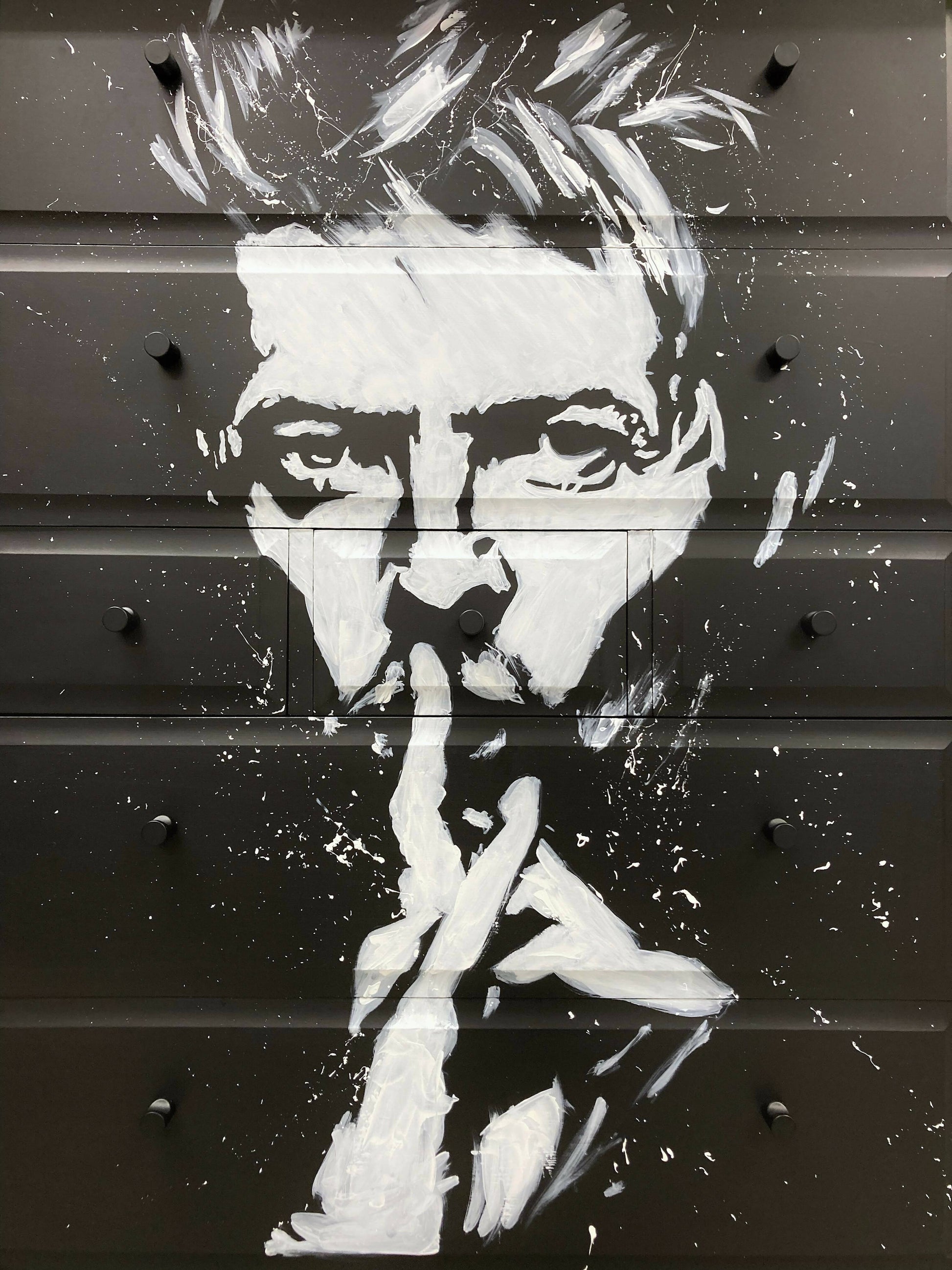 The Bowie image on the Tallboy has been professionally hand painted in white acrylic and the splashes and splats have been created with a palette knife. The Bowie image has been sealed with clear wax.