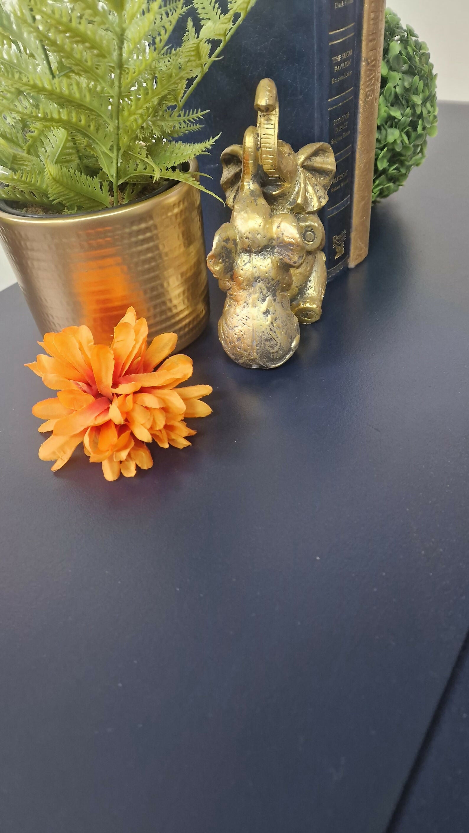 Adorning the front of the chest is the Cerulean Blooms floral furniture transfer, seamlessly blending with the rich navy hue to create a striking visual appeal. The combination of the transfer and the deep tone adds a touch of sophistication to any room.