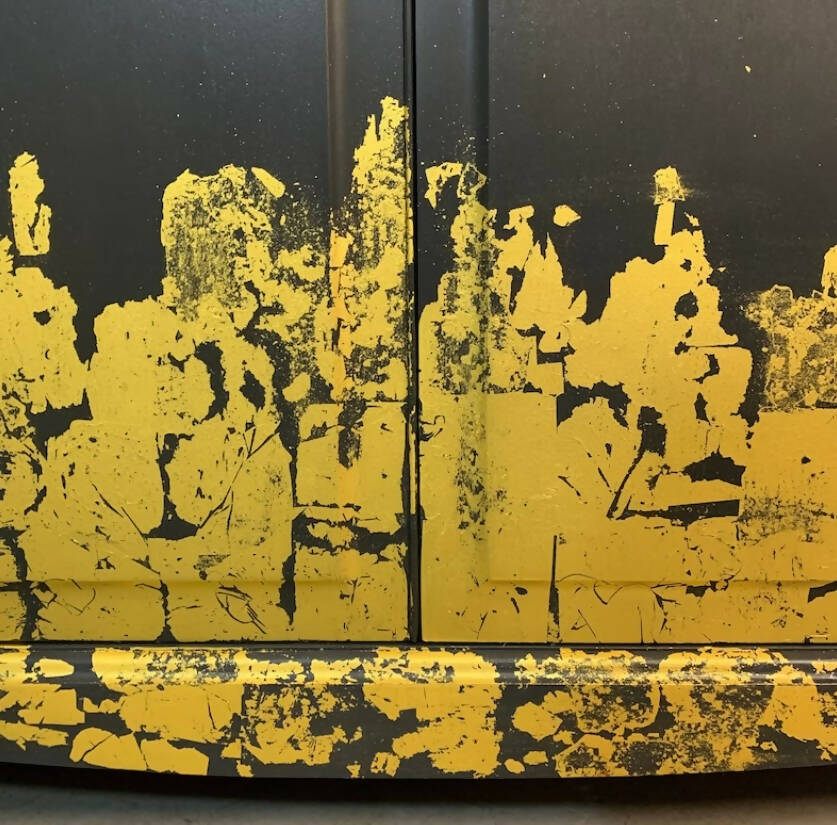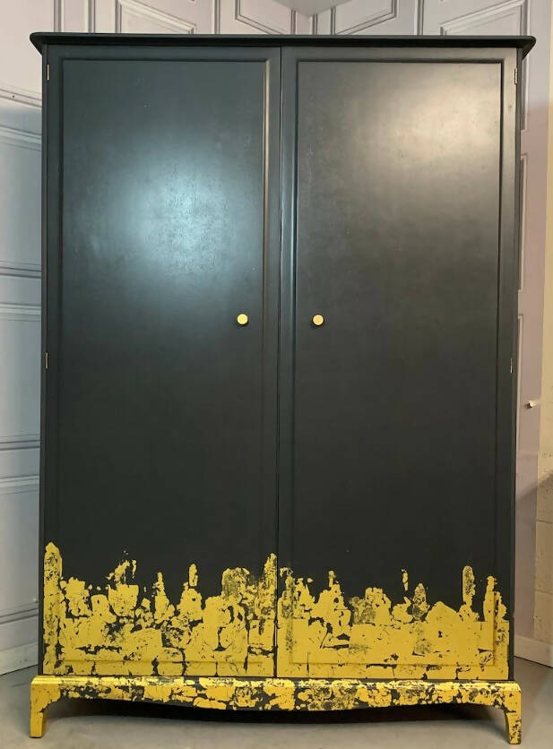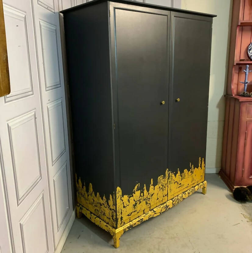 Outside of the wardrobe was primed, professionally spray-painted black colour and finished with satin varnish. When furniture is spray-painted it gives streak free flawless and long-lasting finish. The bottom of the wardrobe was finished with flame effect using gold leaf. I have chosen gold colour modern style knobs and entire piece comes together.