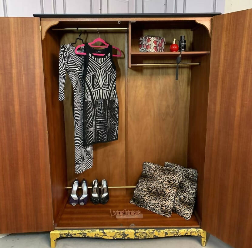 Cleaned, repaired, stripped from the old varnish inside & out. The inside of the wardrobe was finished with beautifully scented wood salve which nourishes the wood, inside railings been painted in gold to add a little glamour to the inside.