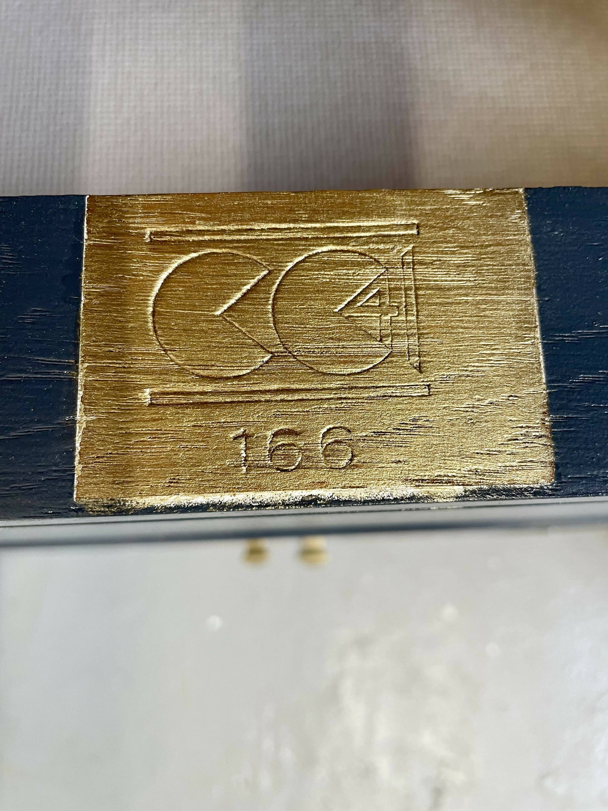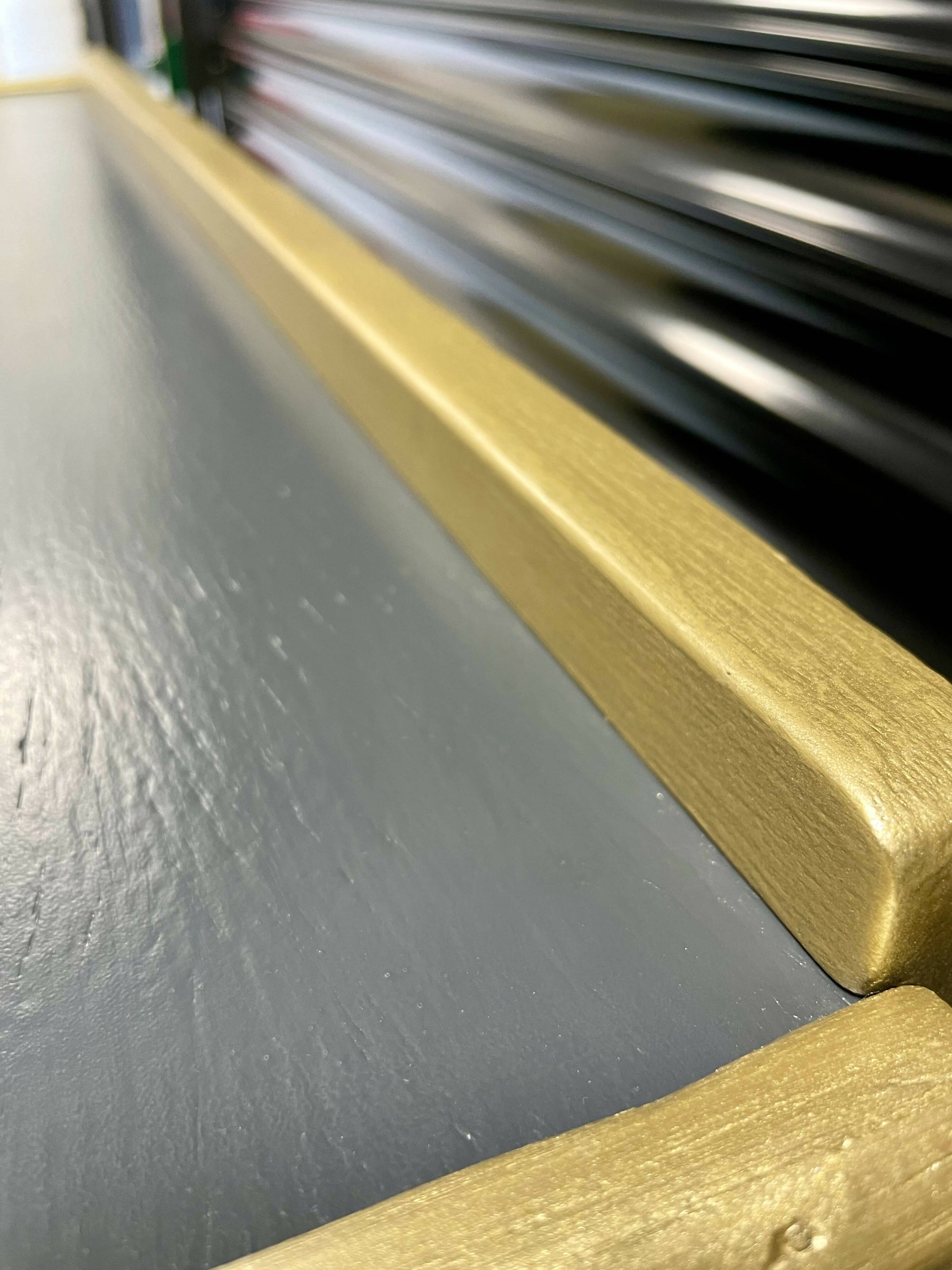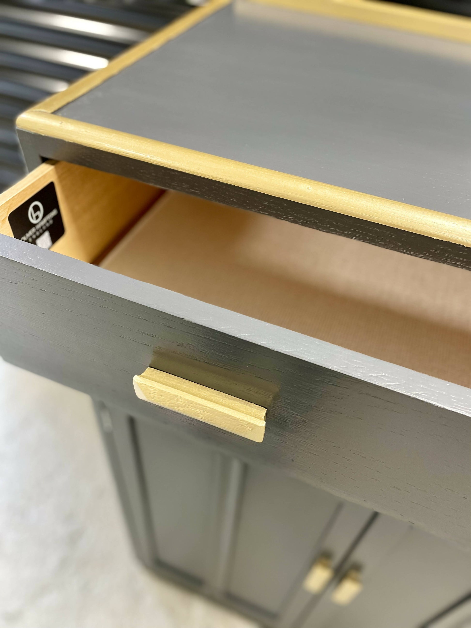 Very deep charcoal grey mineral paint coloured the whole piece of cabinet to keep the real wood grain beauty showing, with lovely original wooden knobs painted in gold gives a luxurious finish look.