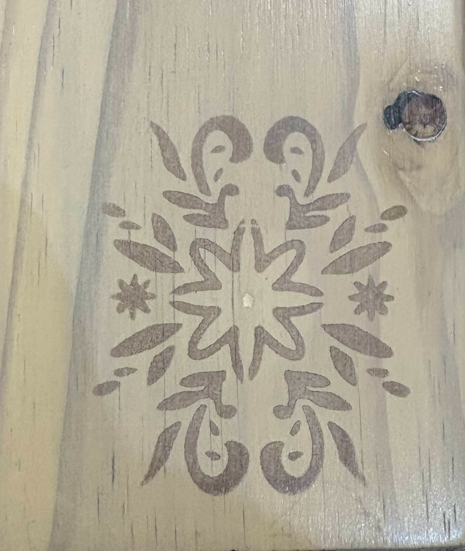 Unique Drawer: The drawer front features a dimensional, stencilled design created with natural wood filler, stained with Church Oak, and finished with a striking Vintage Floral Brass Handle.
