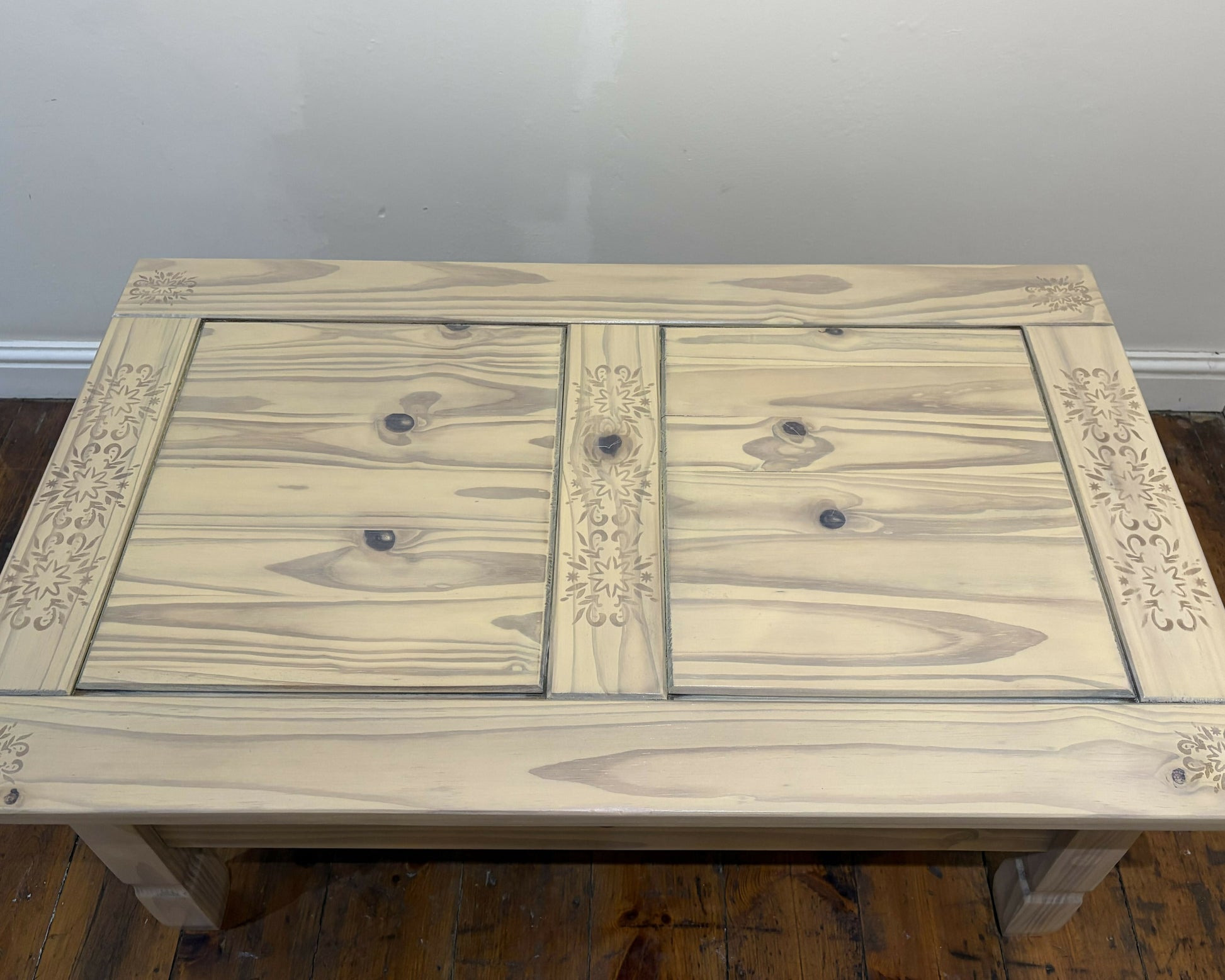 This beautiful coffee table has been upcycled and finished in a popular Farmhouse/Shabby Chic style. The process was meticulously done to create a bright, contemporary look while maintaining the texture and character of the original pine wood.