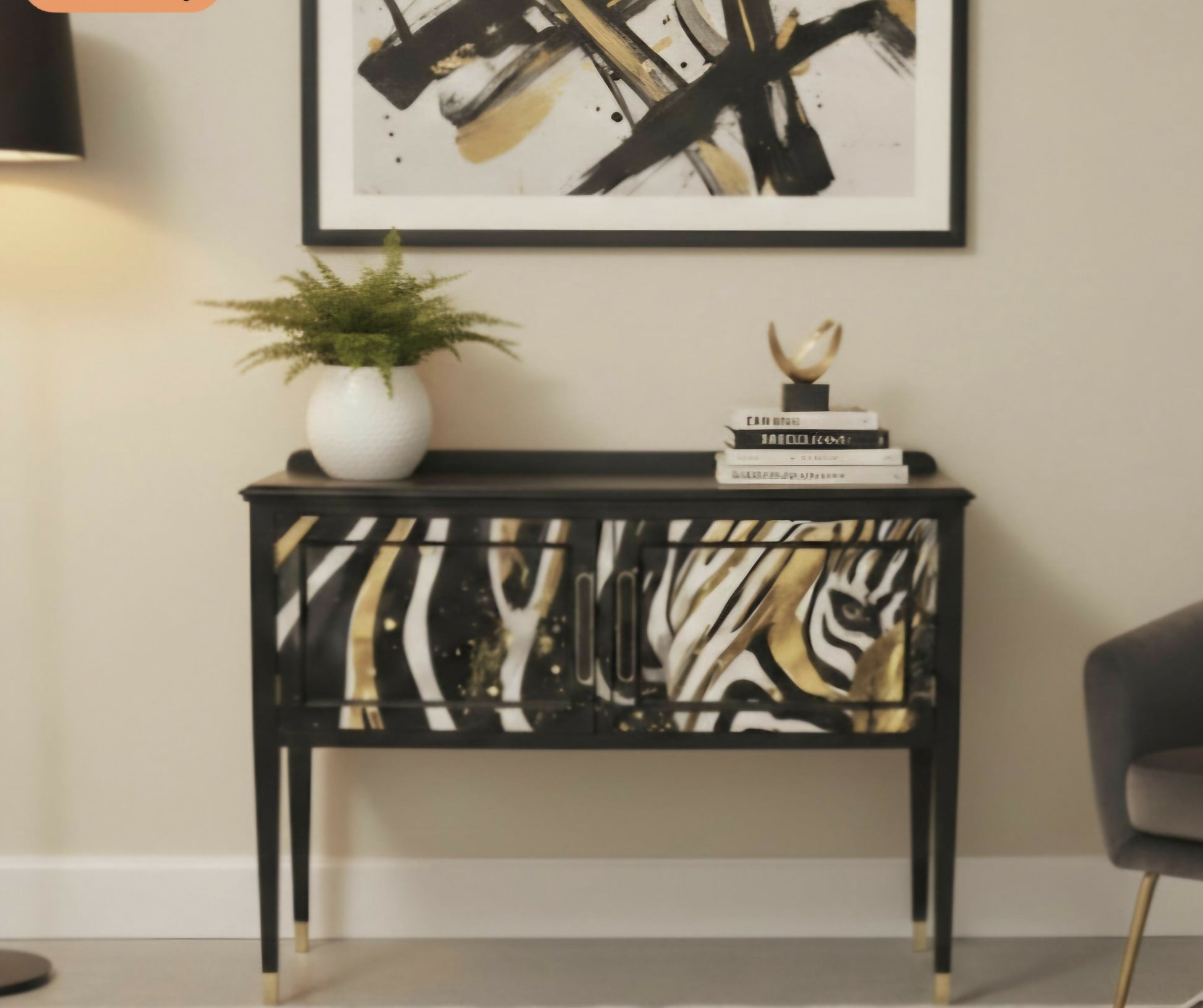 Upcycled Black Sideboard TV Stand with Zebra Print Doors | Gold Leaf Feet | Statement Cabinet | Opus Equus