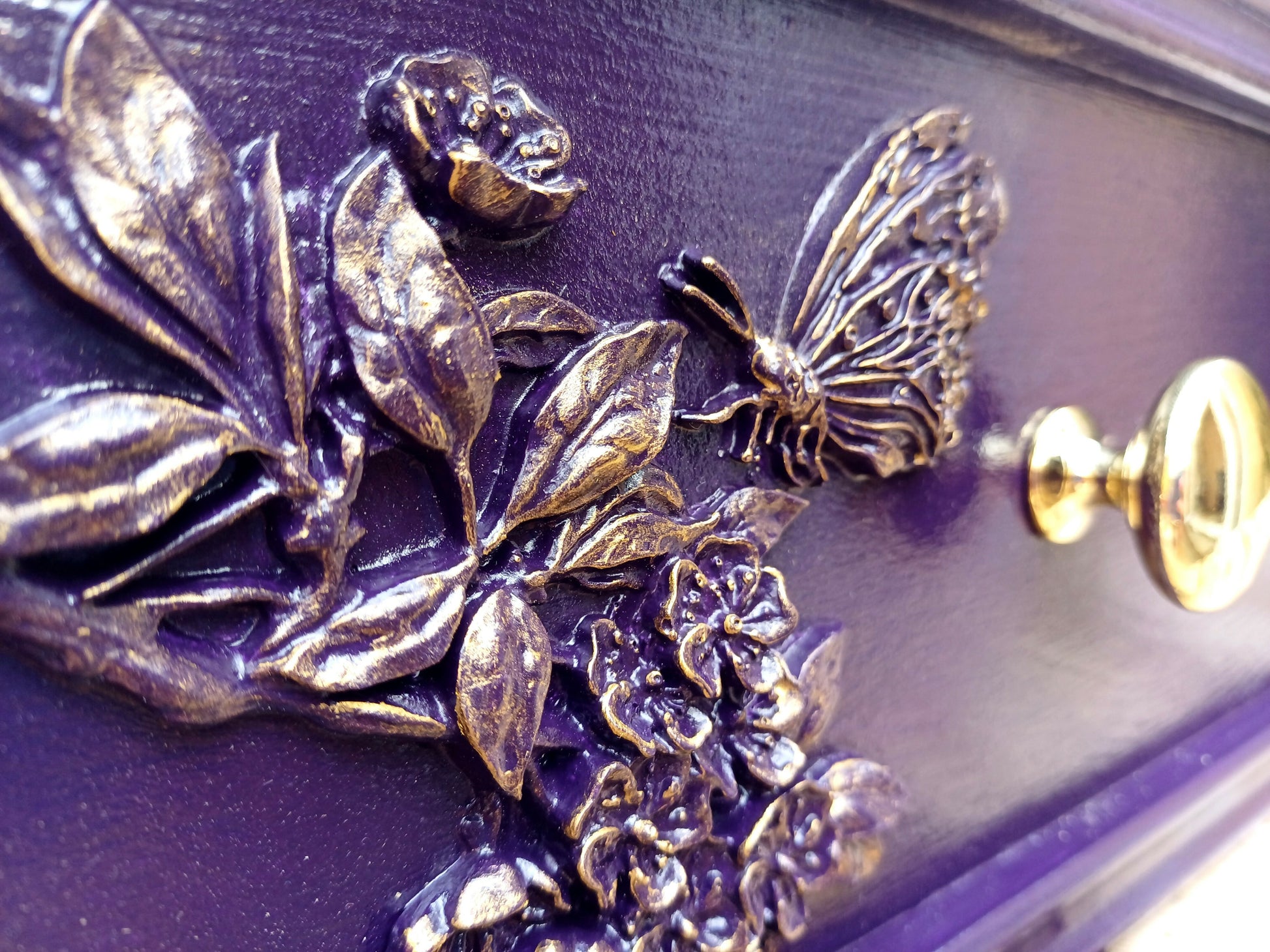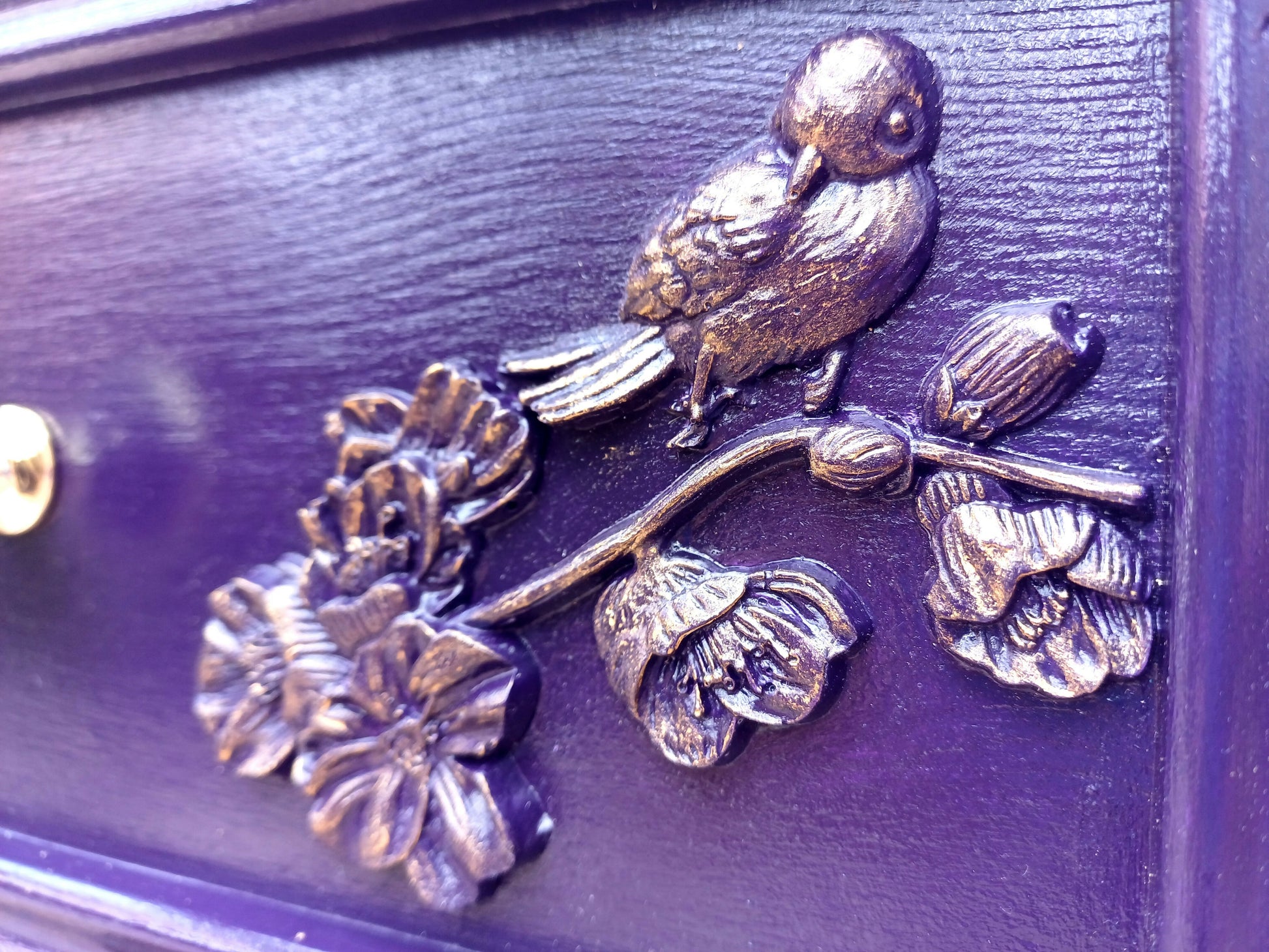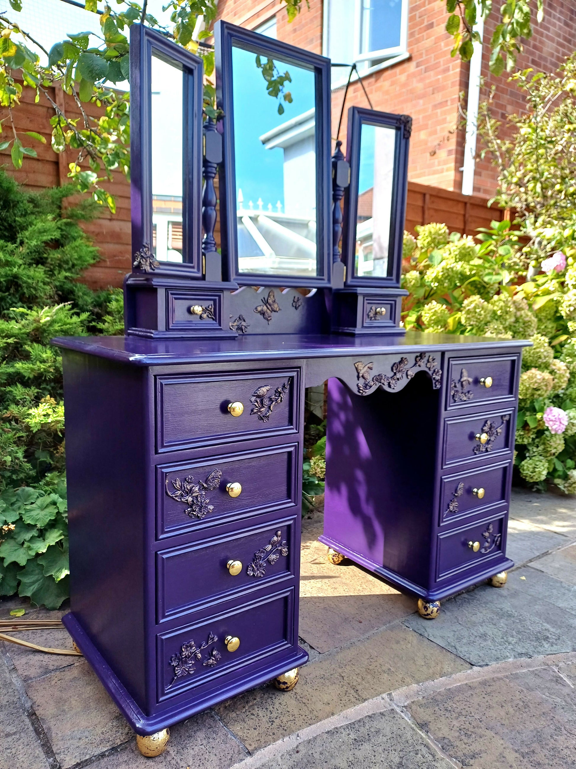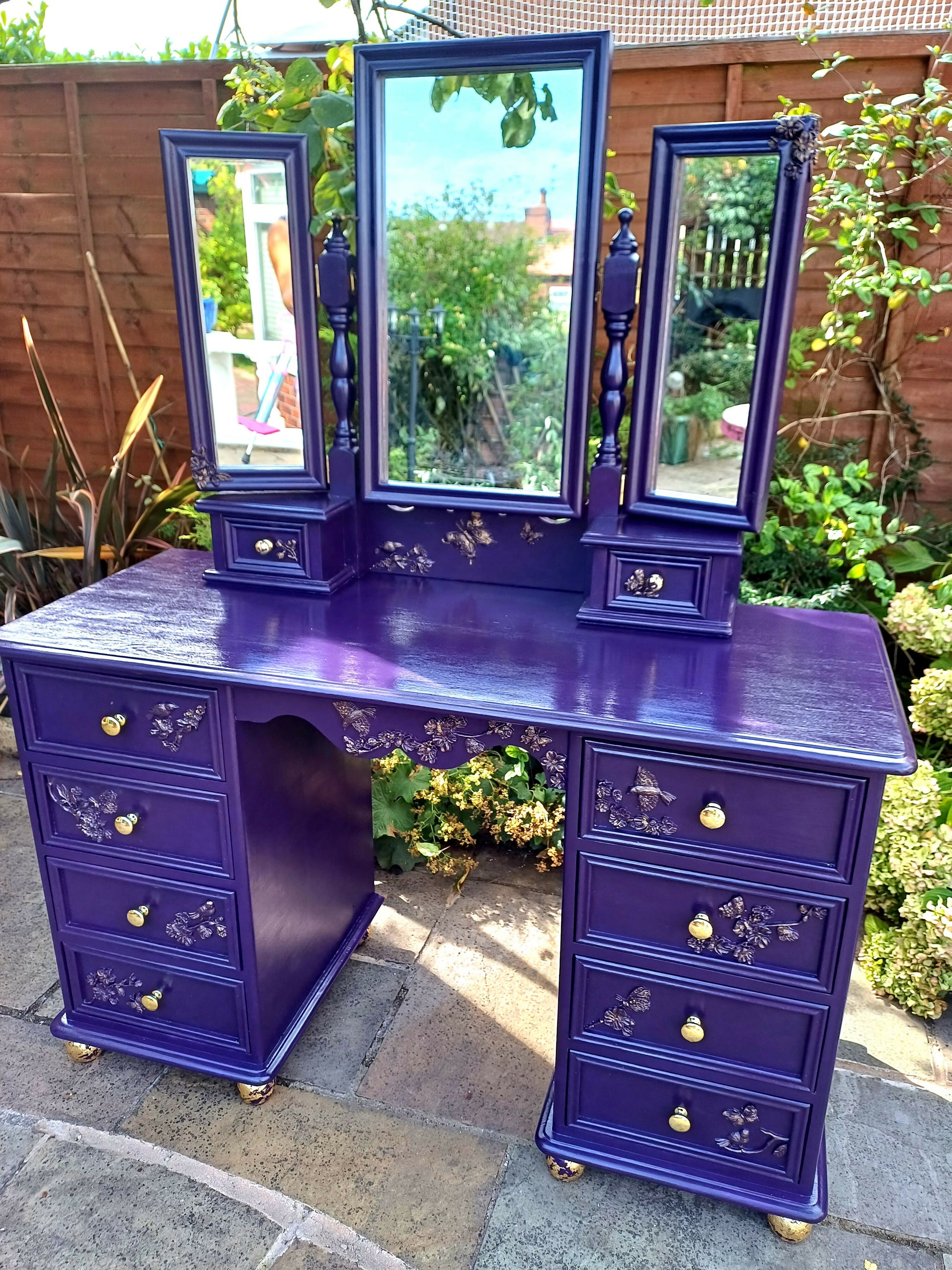Upcycled Deep Purple and Gold Dressing Table with Flower and Bird Mould Design with Three Mirrors and Ten Drawers