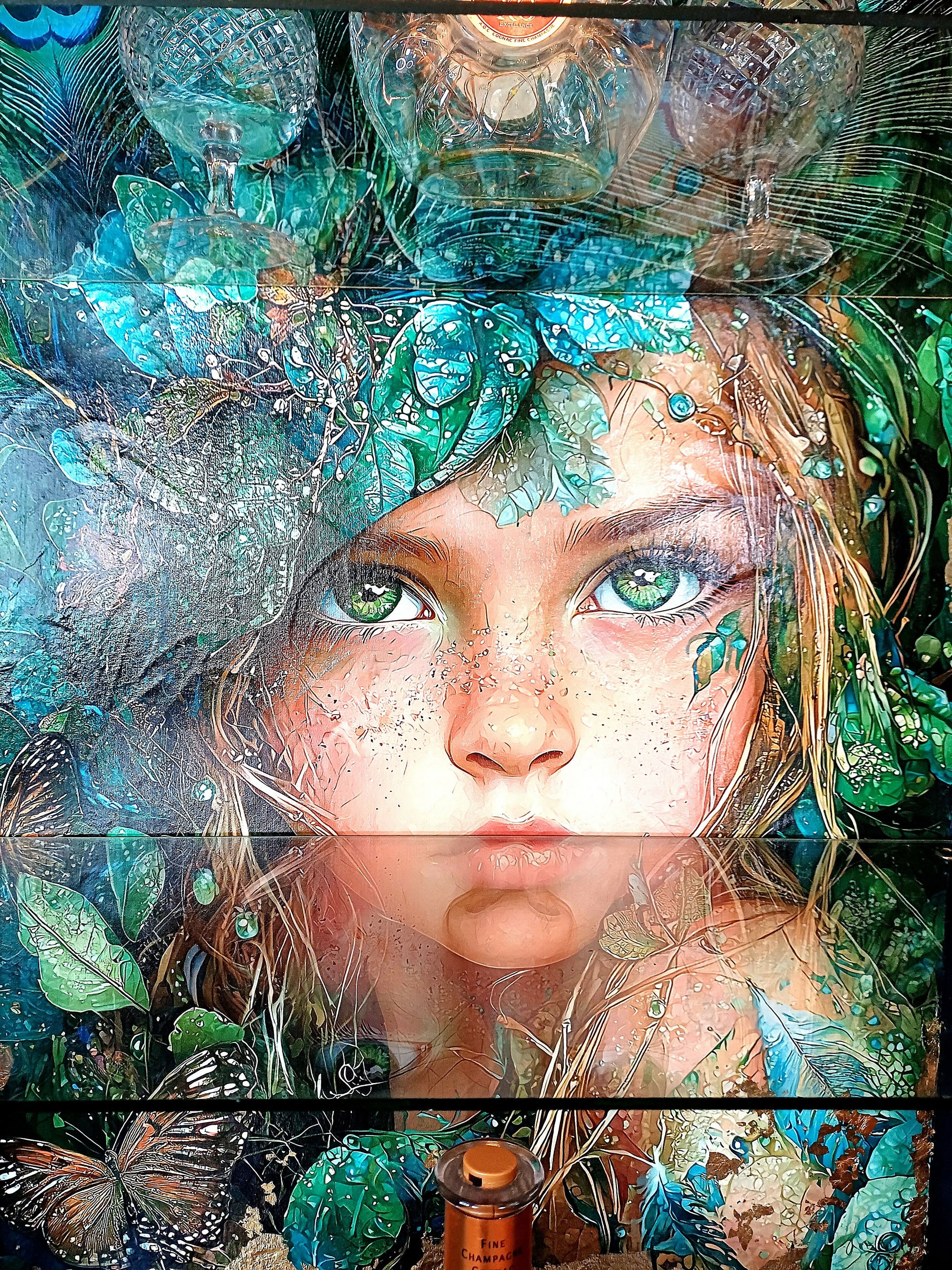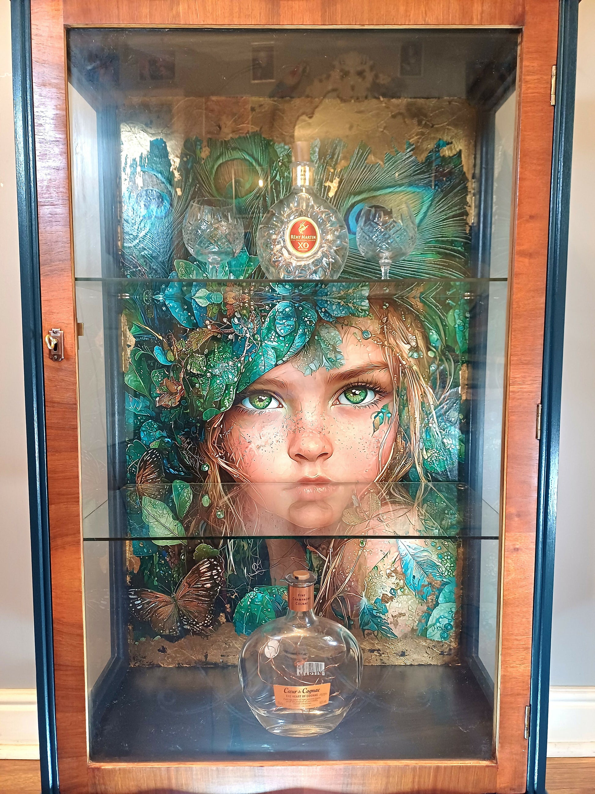 Upcycled Display Case with Decoupaged Peacock Princess and Glass Shelves