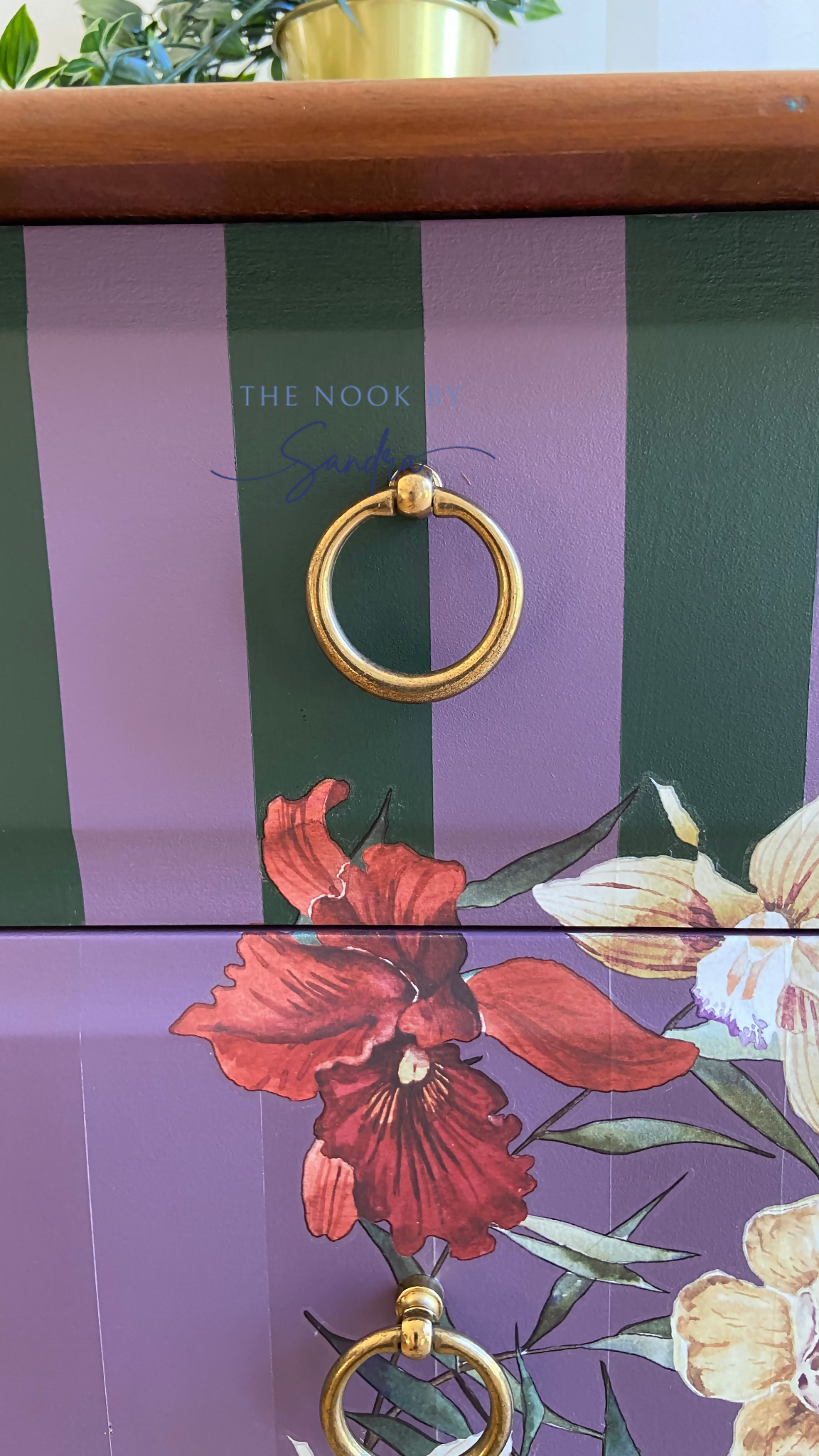 Upcycled Stag Chest in Purple and Manor Green Drawer, Floral transfer, Hand-Painted Furniture