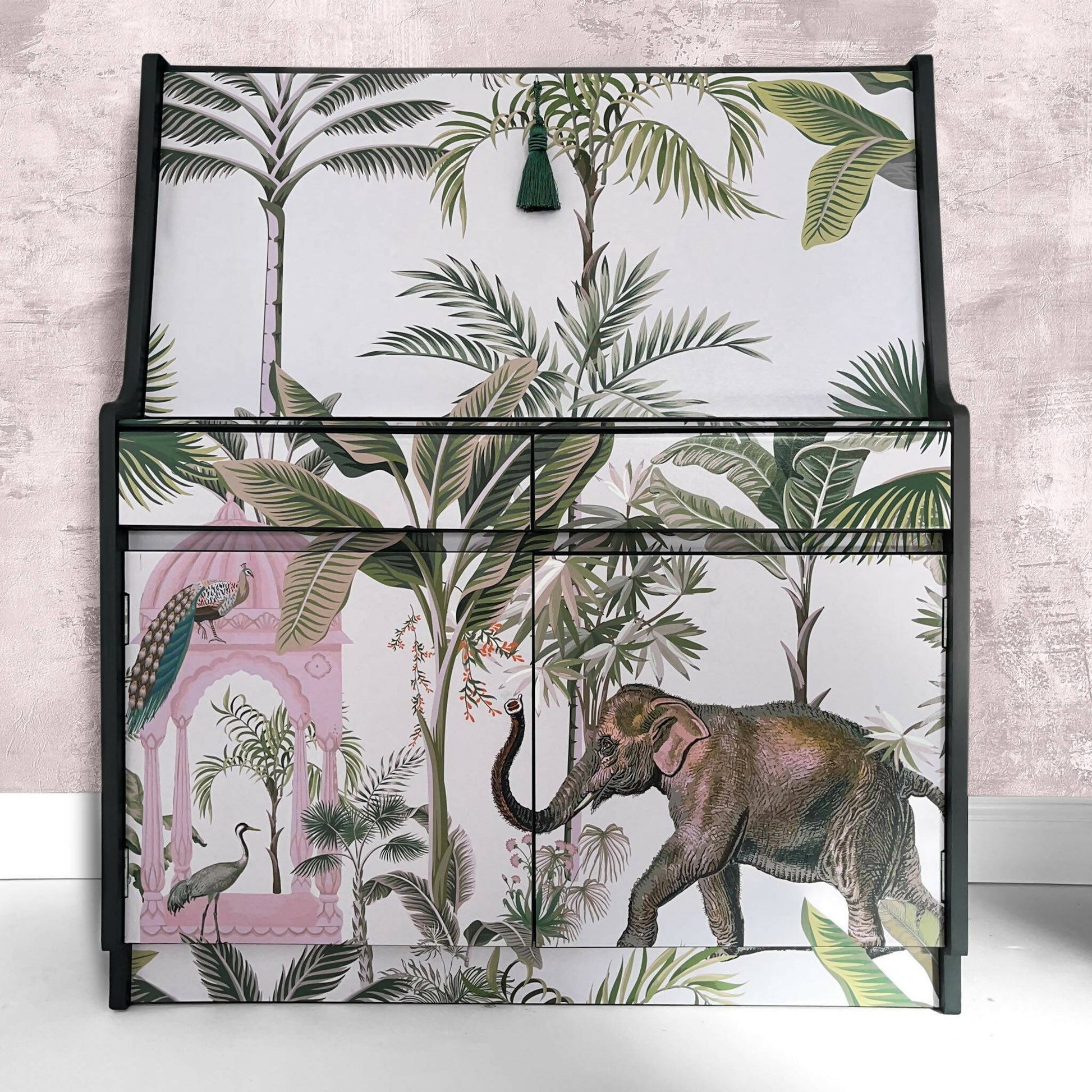 Bureau was given full makeover - painted beautiful grey colour and decorated with bespoke artwork of Indian garden.