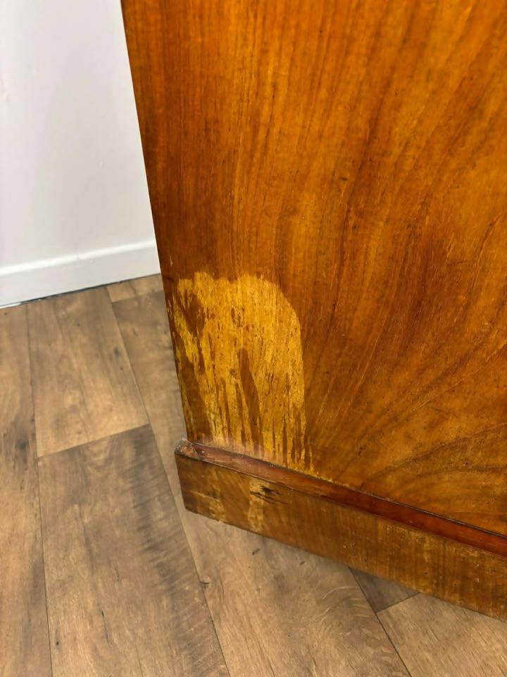 The front displays a particularly pleasing flame mahogany grain, giving the piece strong visual appeal and warmth. The top shows general age-related marks, nothing significant or distracting, and remains solid and usable. The left side has an area of discolouration towards the lower section, while the right side presents well.